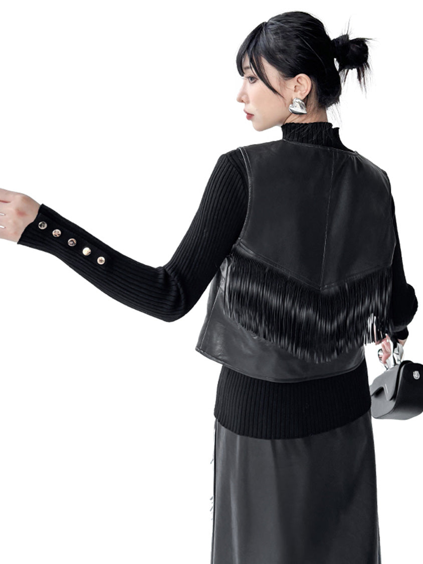 上半身はすっきりとしたラインでまとめ、フリンジの陰影が自然な立体感を与える。