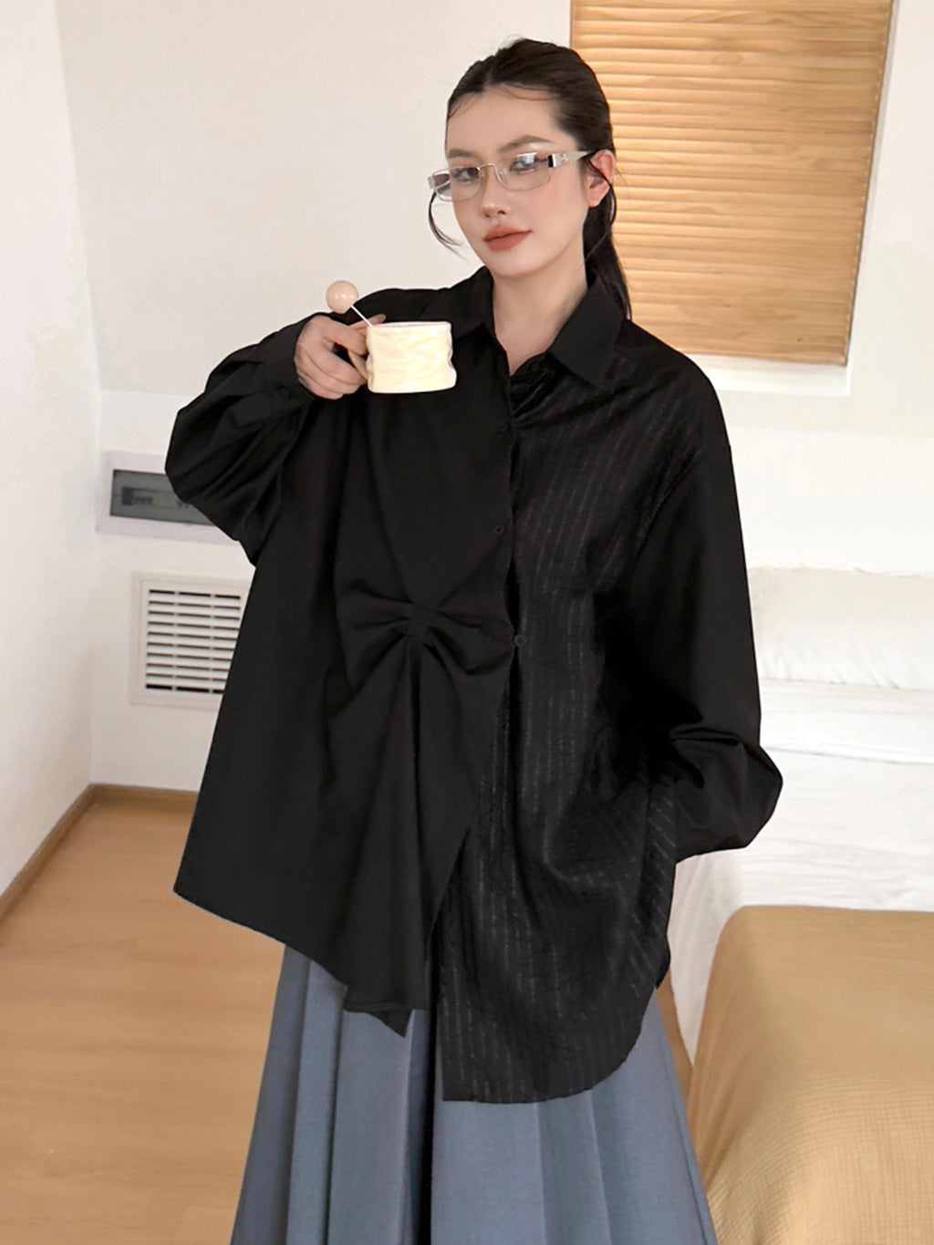 フロントに大胆なツイストドレープを配したブラウス。片側に施されたピンストライプの異素材切替が視覚的なアクセントとなり、立体感を引き立てる。ゆったりとしたシルエットと長めの着丈が抜け感を生み、軽やかな動きを演出。アシンメトリーの襟が顔まわりをシャープに見せ、モードとリラックス感を兼ね備えたデザイン。さらりとした風合いで季節を問わず着こなしやすい。