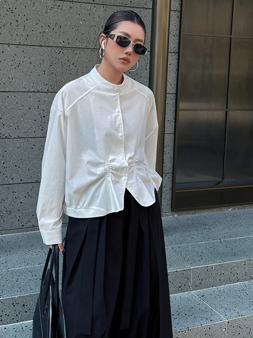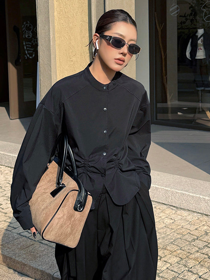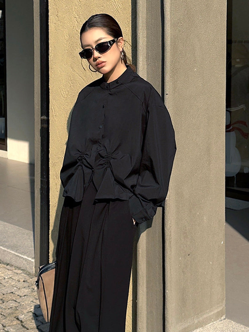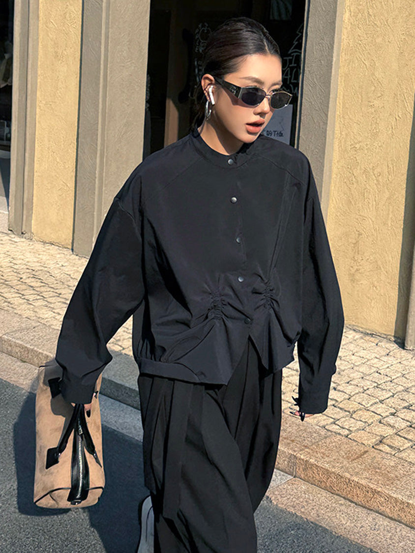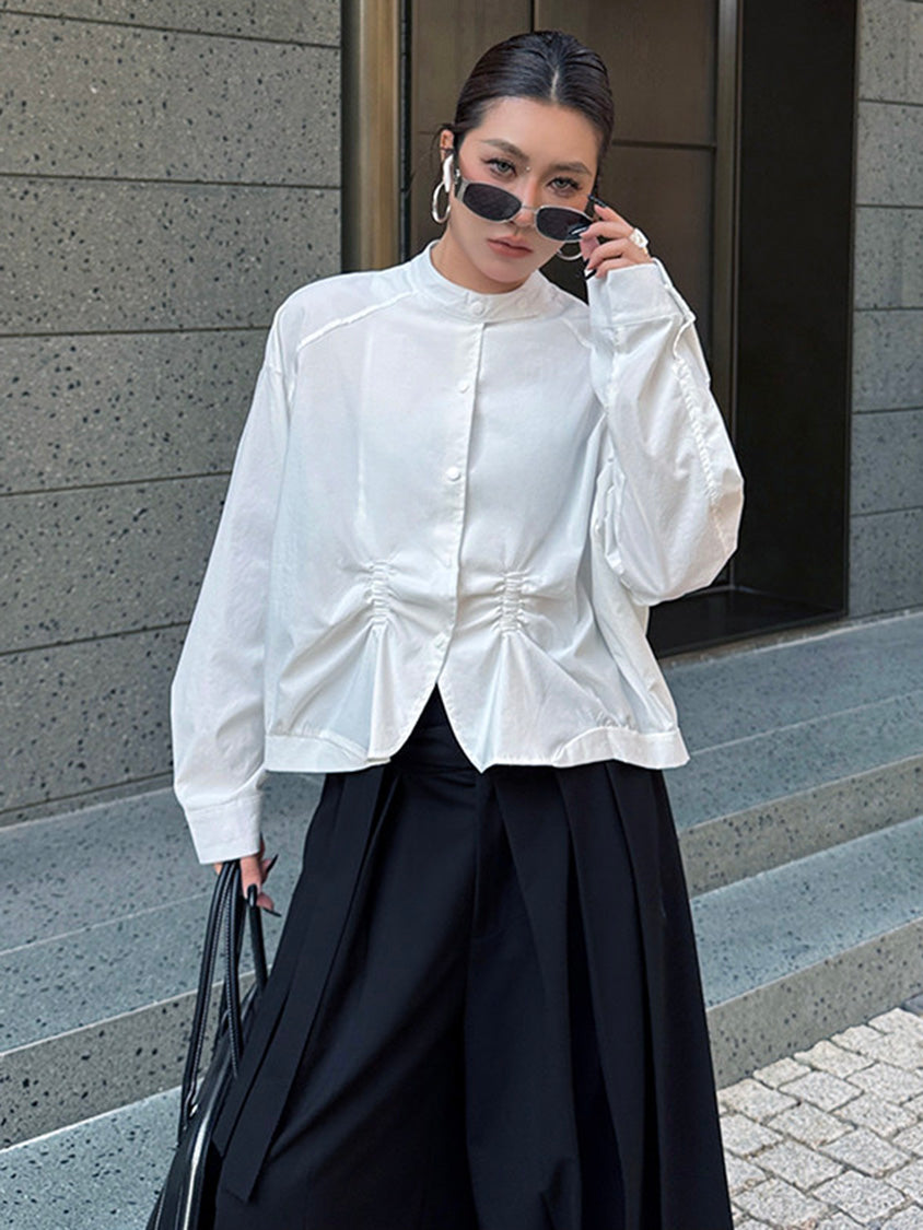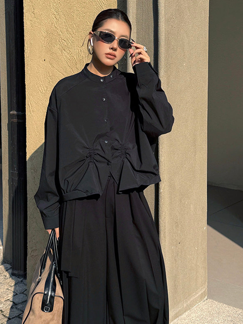 スタンドカラーと比翼調の前立てが端正な印象をつくるシルエット。胸下に配した寄せギャザーが自然な陰影を生み、裾にかけて穏やかな広がりを描く。ドロップショルダーの緩やかなラインと、滑らかな質感の生地が、都会的でミニマルな空気感を引き立てる。