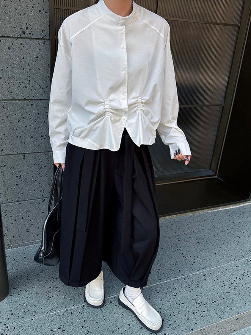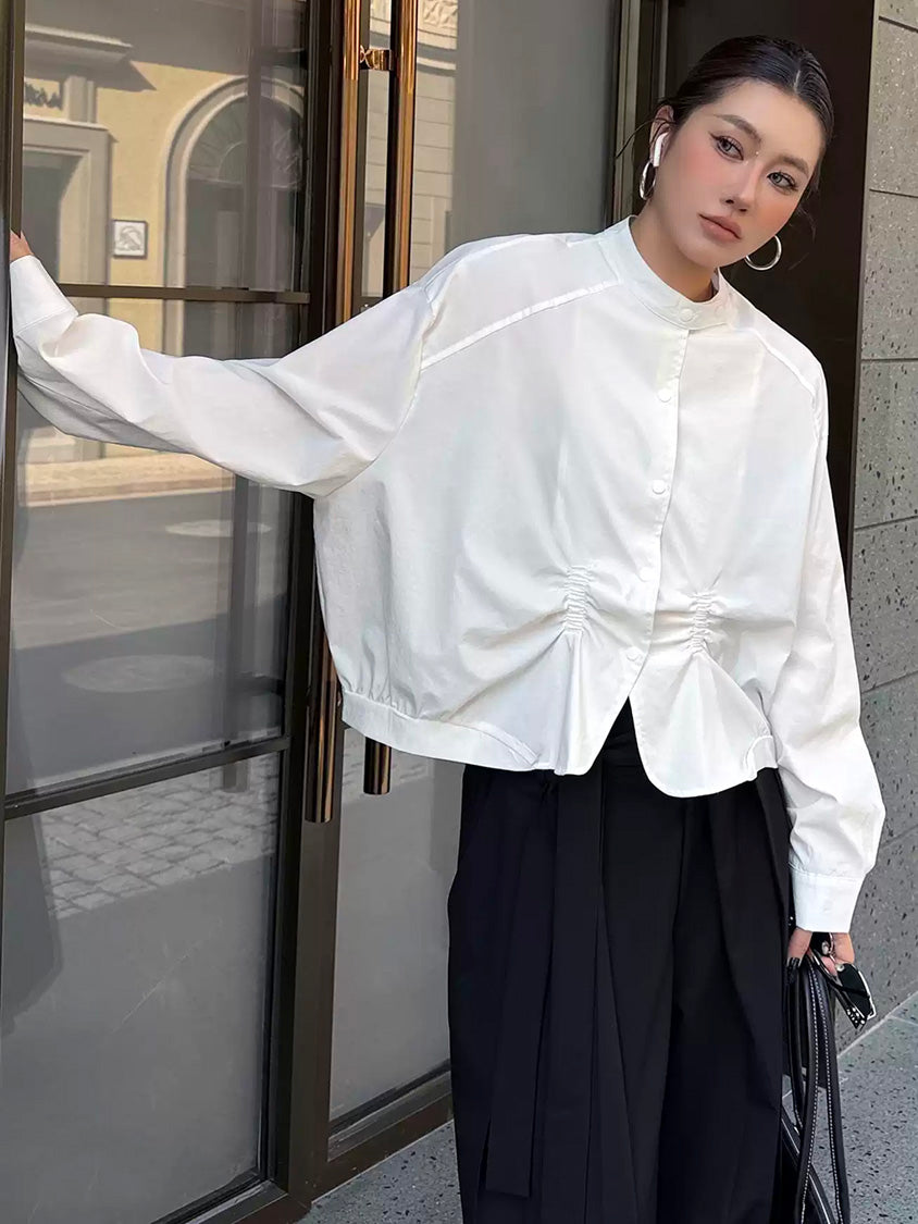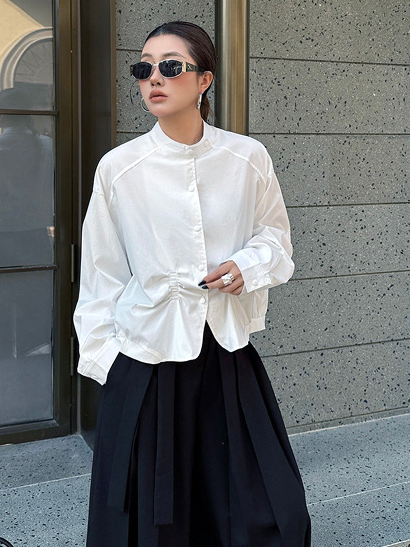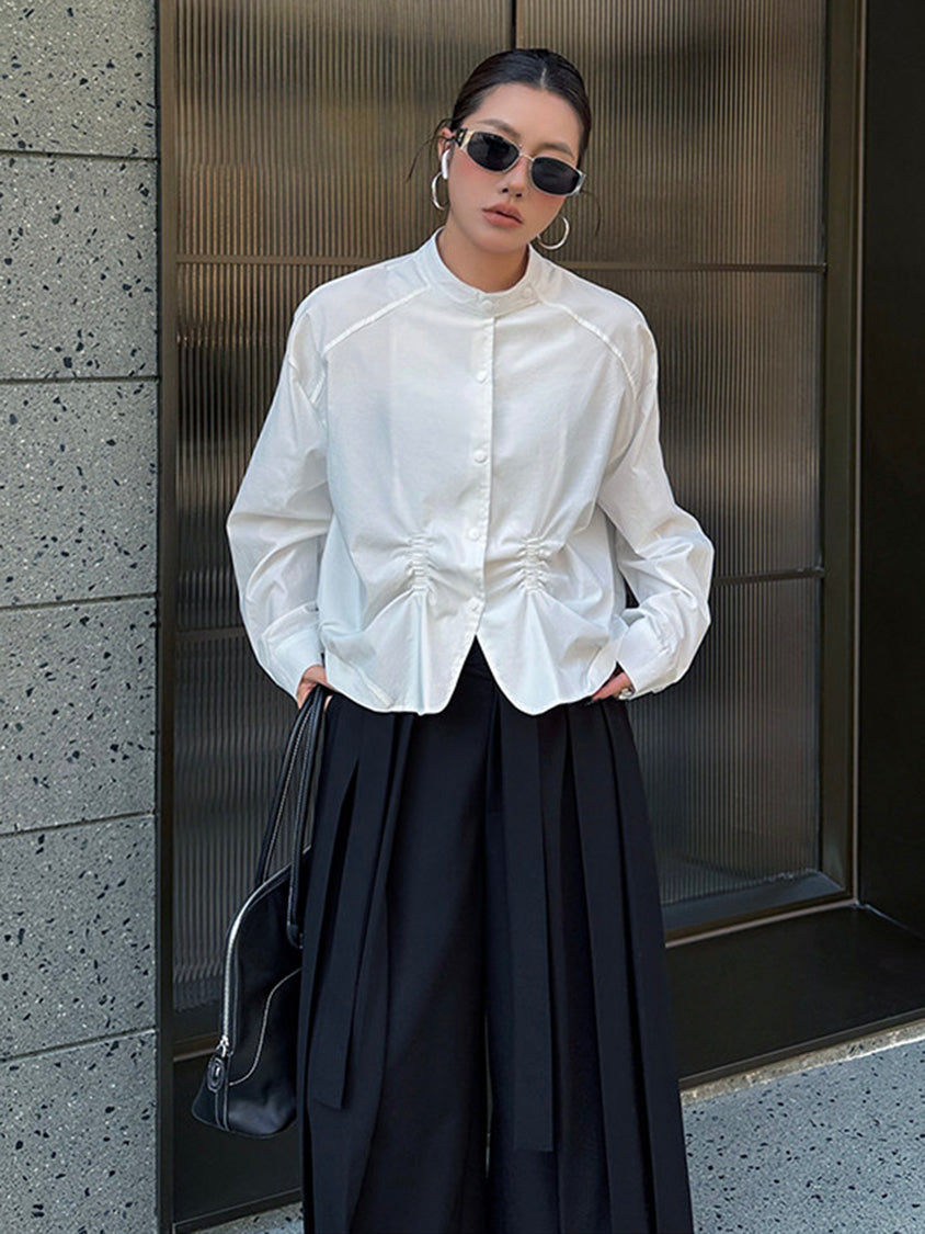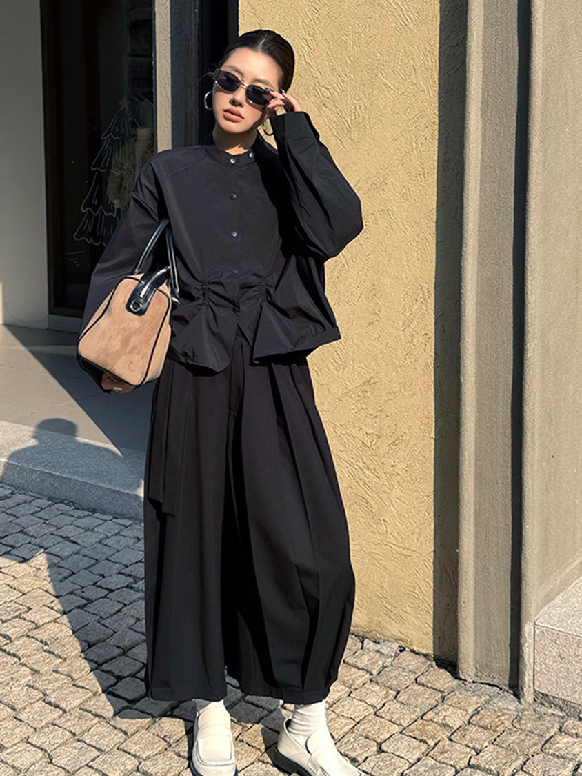 スタンドカラーと比翼調の前立てが端正な印象をつくるシルエット。胸下に配した寄せギャザーが自然な陰影を生み、裾にかけて穏やかな広がりを描く。ドロップショルダーの緩やかなラインと、滑らかな質感の生地が、都会的でミニマルな空気感を引き立てる。
