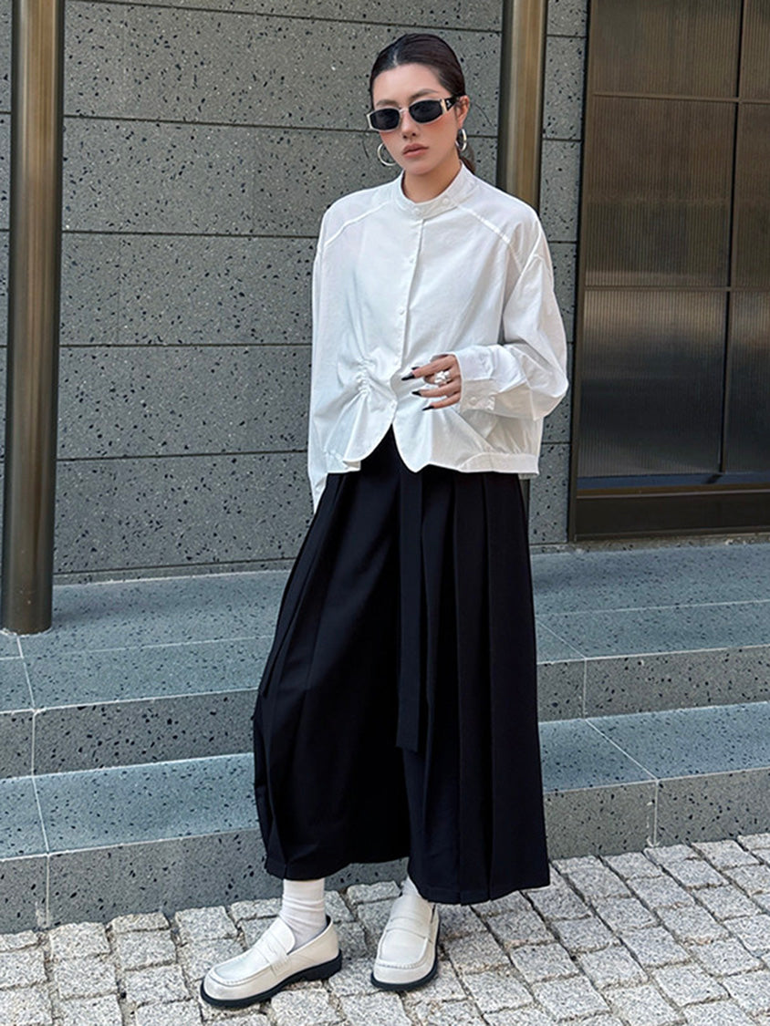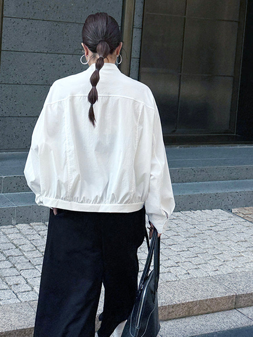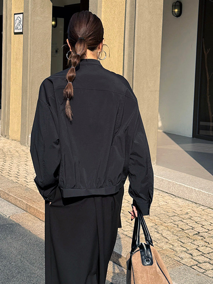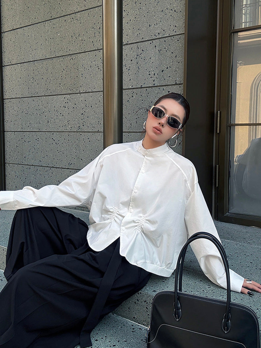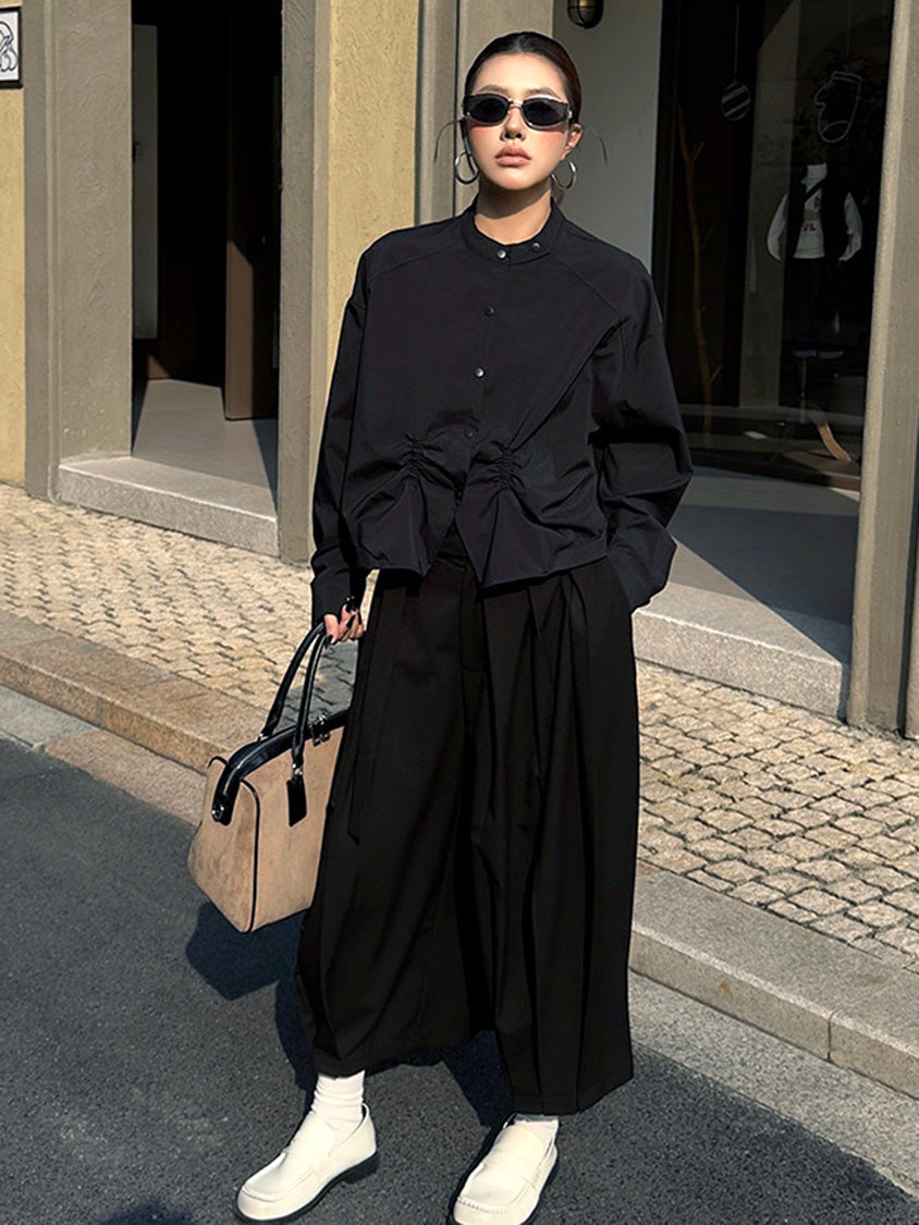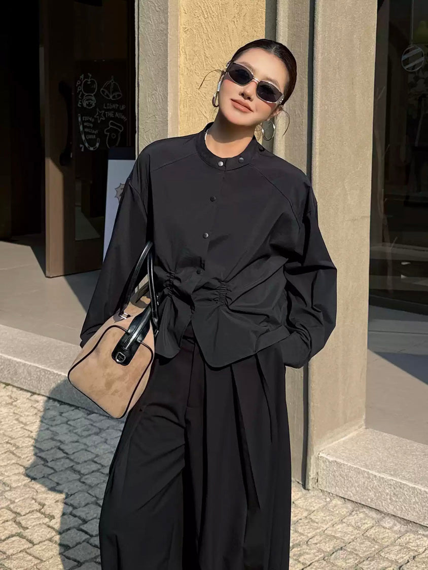 スタンドカラーと比翼調の前立てが端正な印象をつくるシルエット。胸下に配した寄せギャザーが自然な陰影を生み、裾にかけて穏やかな広がりを描く。ドロップショルダーの緩やかなラインと、滑らかな質感の生地が、都会的でミニマルな空気感を引き立てる。