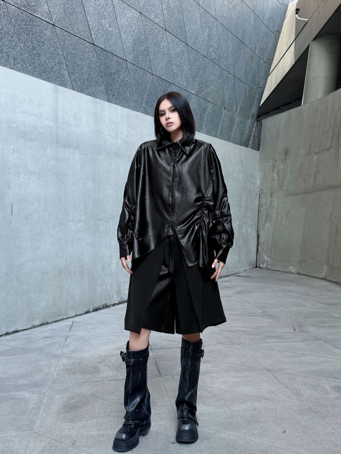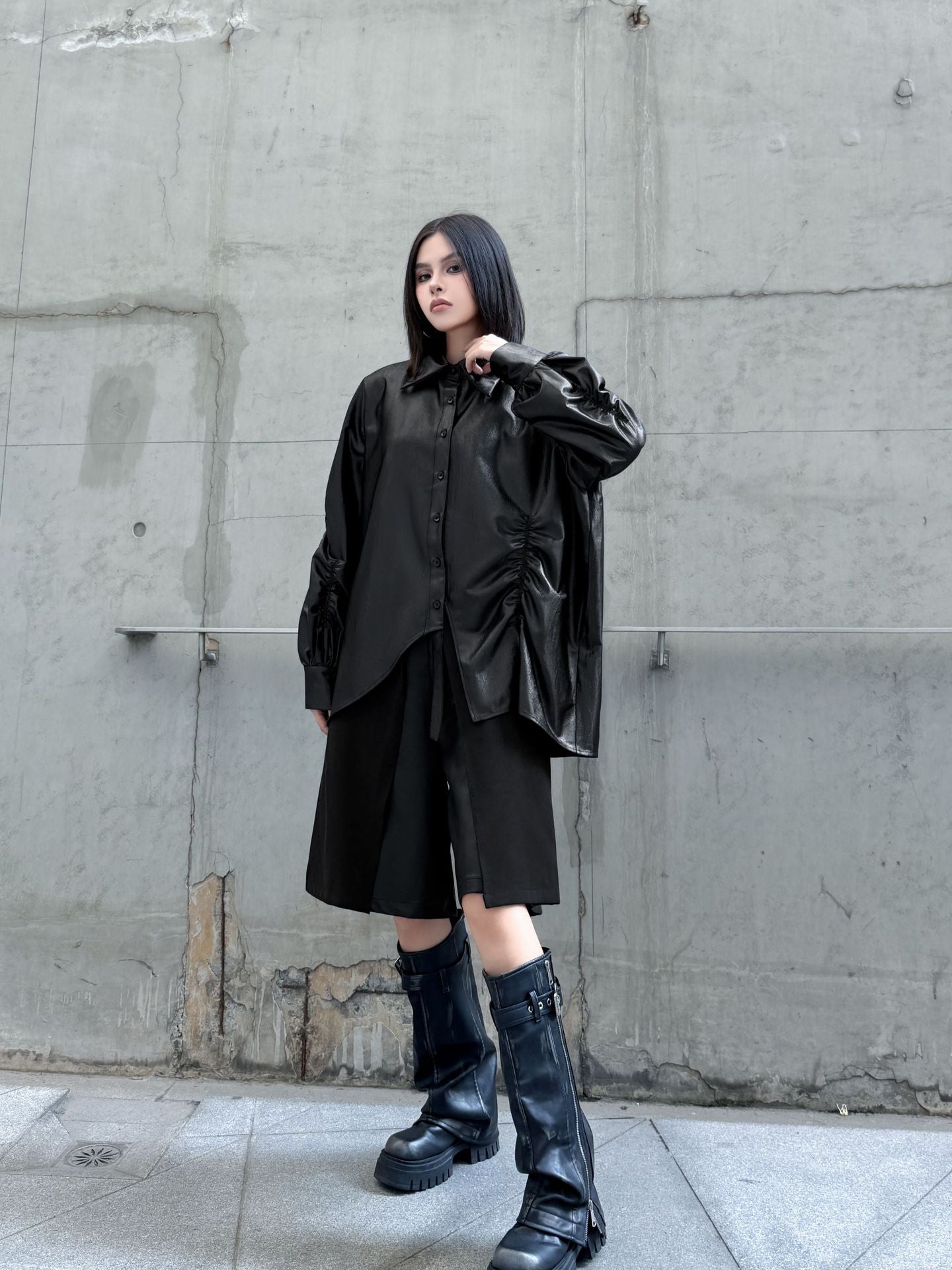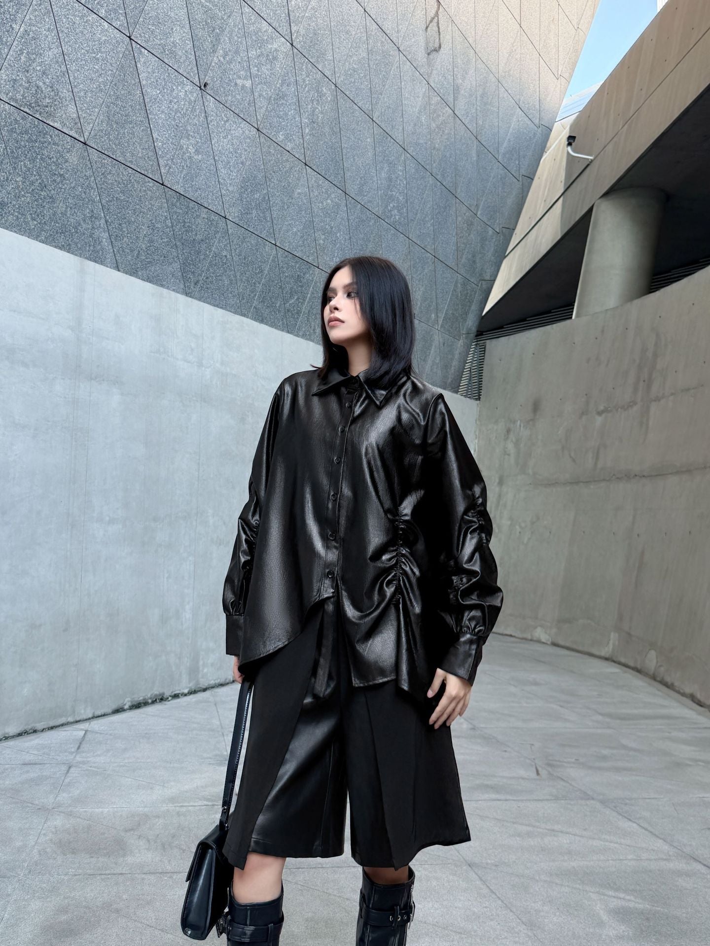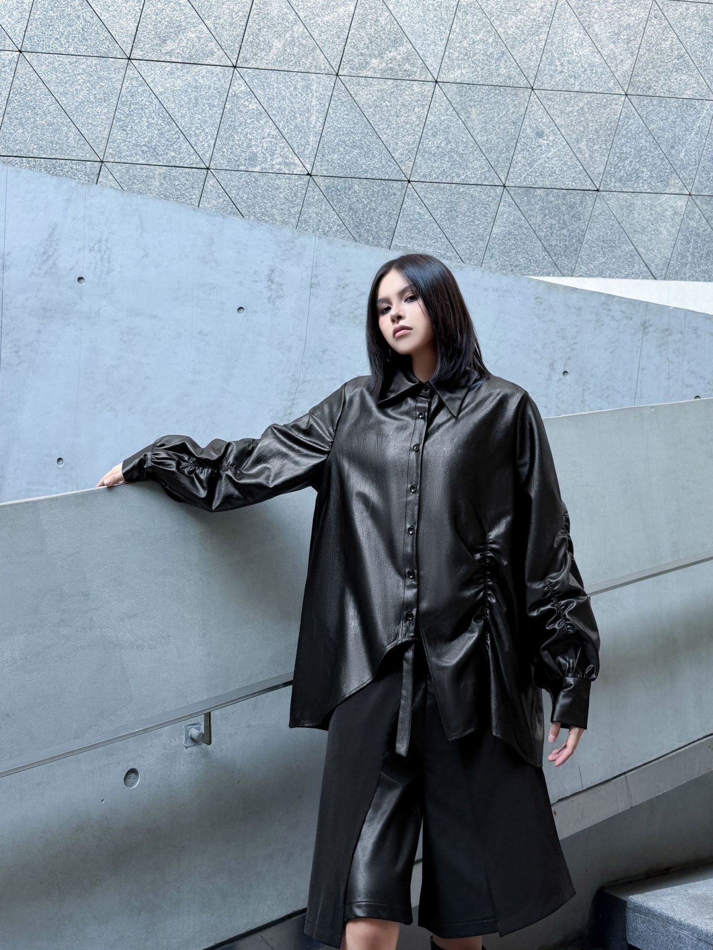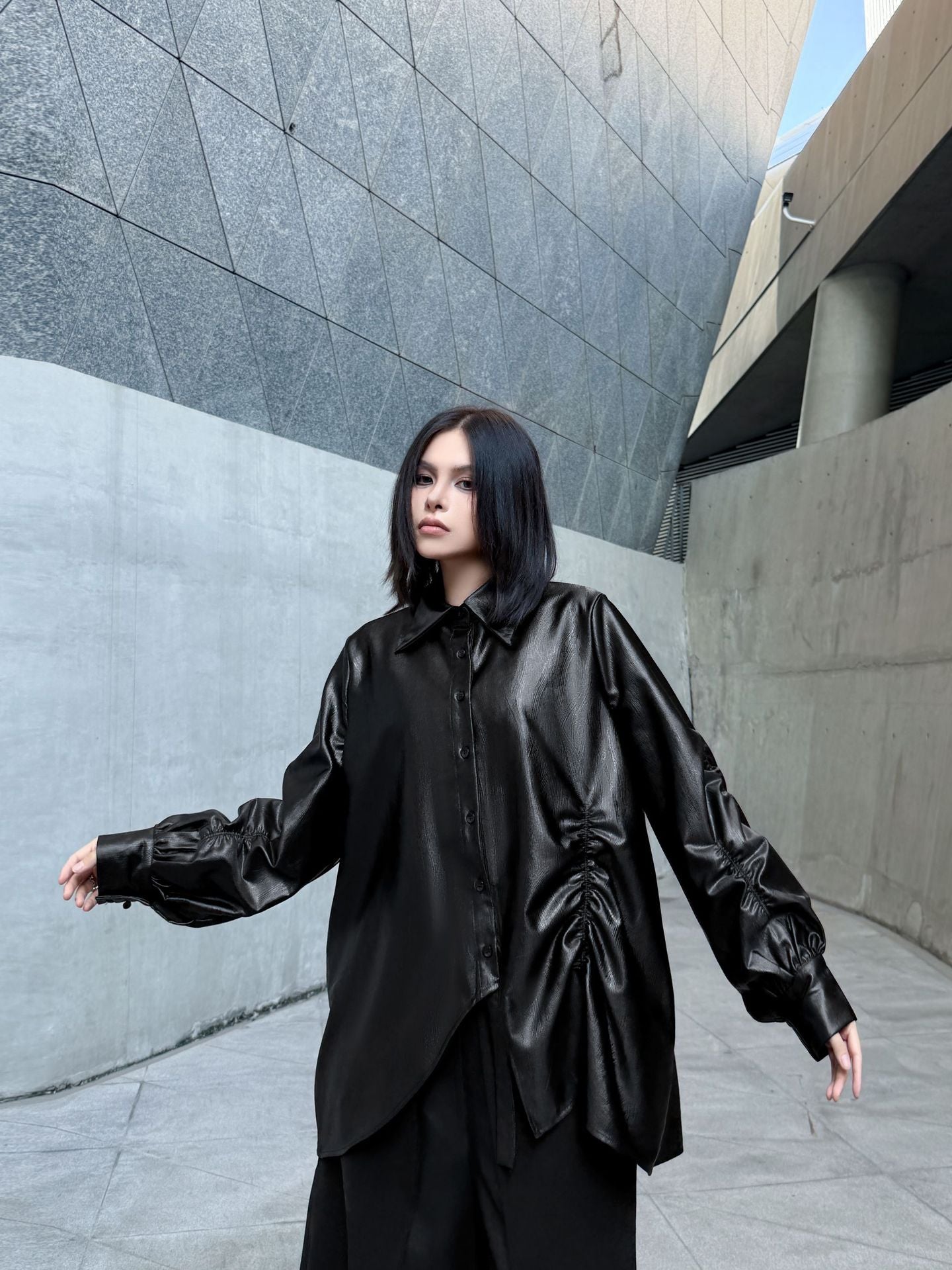 微光沢のある質感が特徴のシャツブラウス。立体的なギャザーを袖口とウエストラインに施し、自然なドレープを描くアートのような構築シルエットに仕上げた。リラックス感のあるオーバーフォルムが身体を包み、光の角度で陰影が変化する。シャープな襟と長めの袖バランスが洗練された存在感を引き立てる。単品でもレイヤードにも対応し、モードなスタイリングを演出。