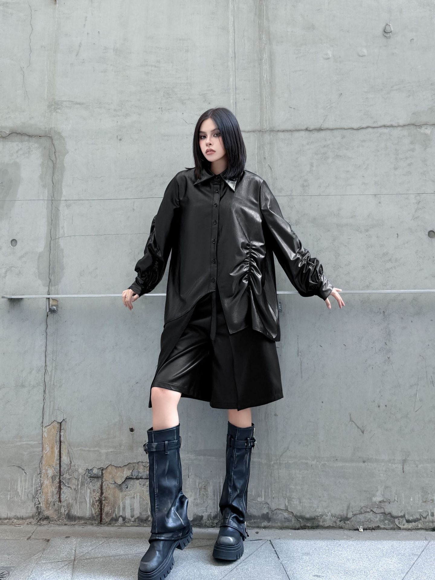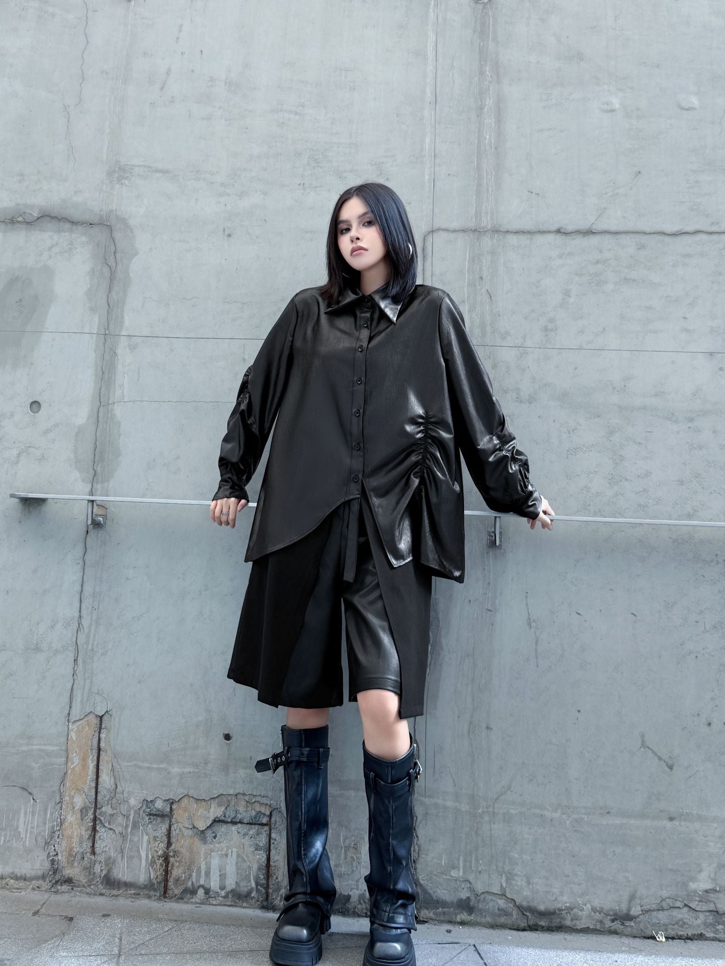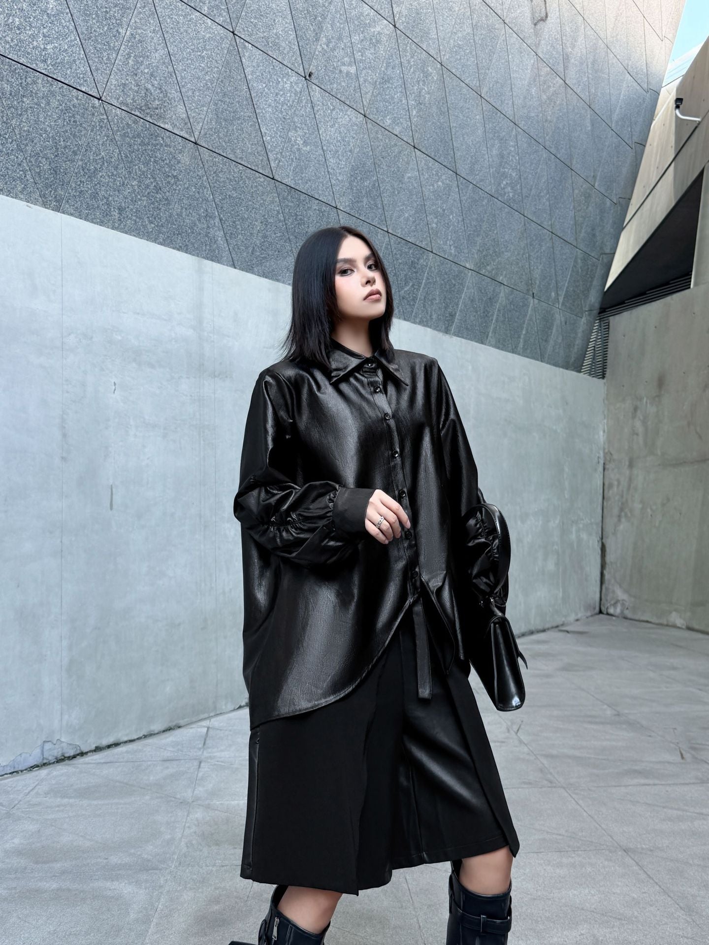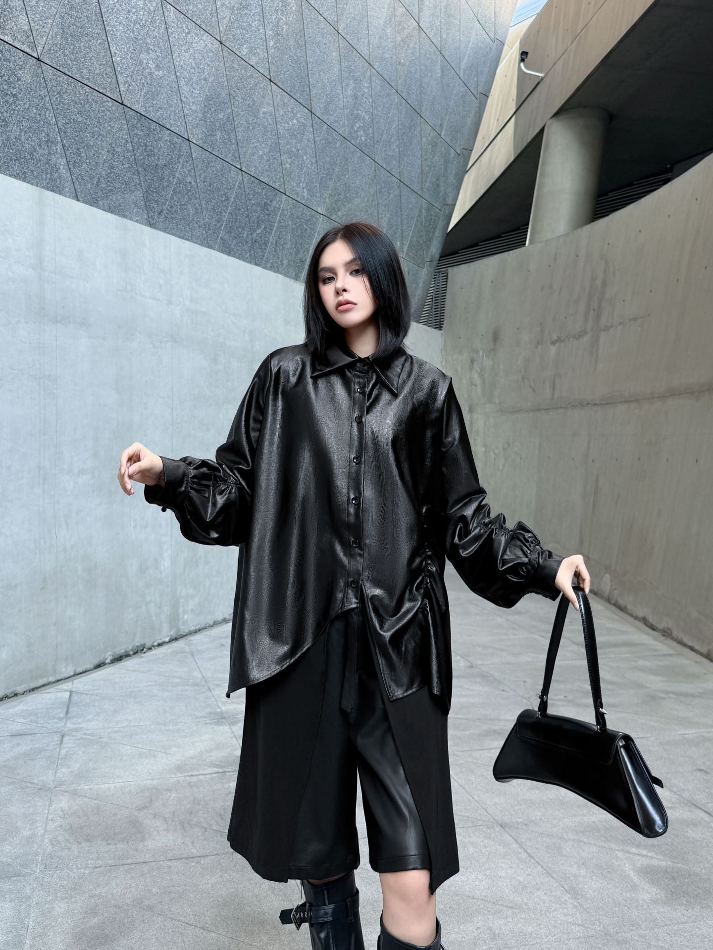 微光沢のある質感が特徴のシャツブラウス。立体的なギャザーを袖口とウエストラインに施し、自然なドレープを描くアートのような構築シルエットに仕上げた。リラックス感のあるオーバーフォルムが身体を包み、光の角度で陰影が変化する。シャープな襟と長めの袖バランスが洗練された存在感を引き立てる。単品でもレイヤードにも対応し、モードなスタイリングを演出。