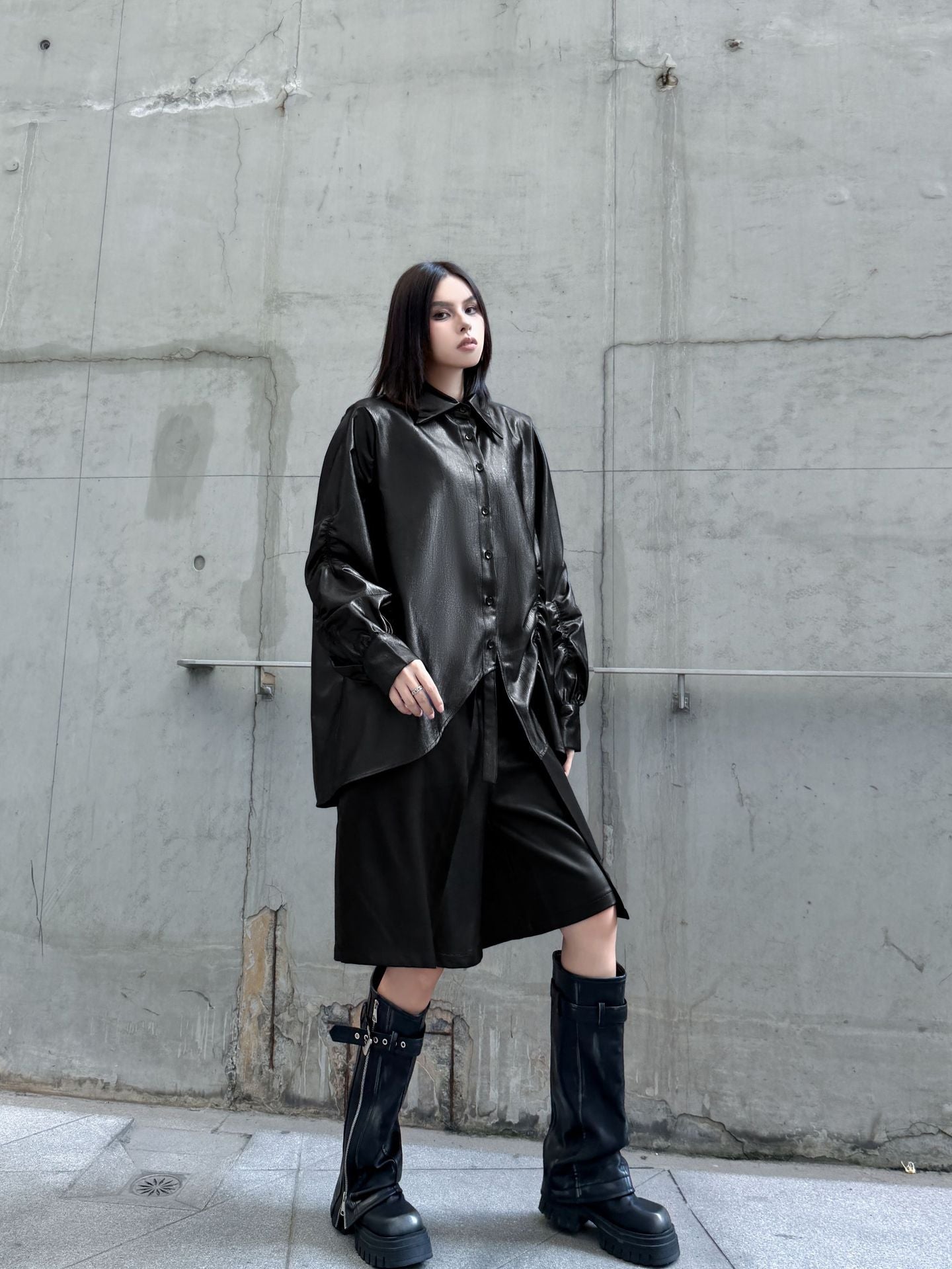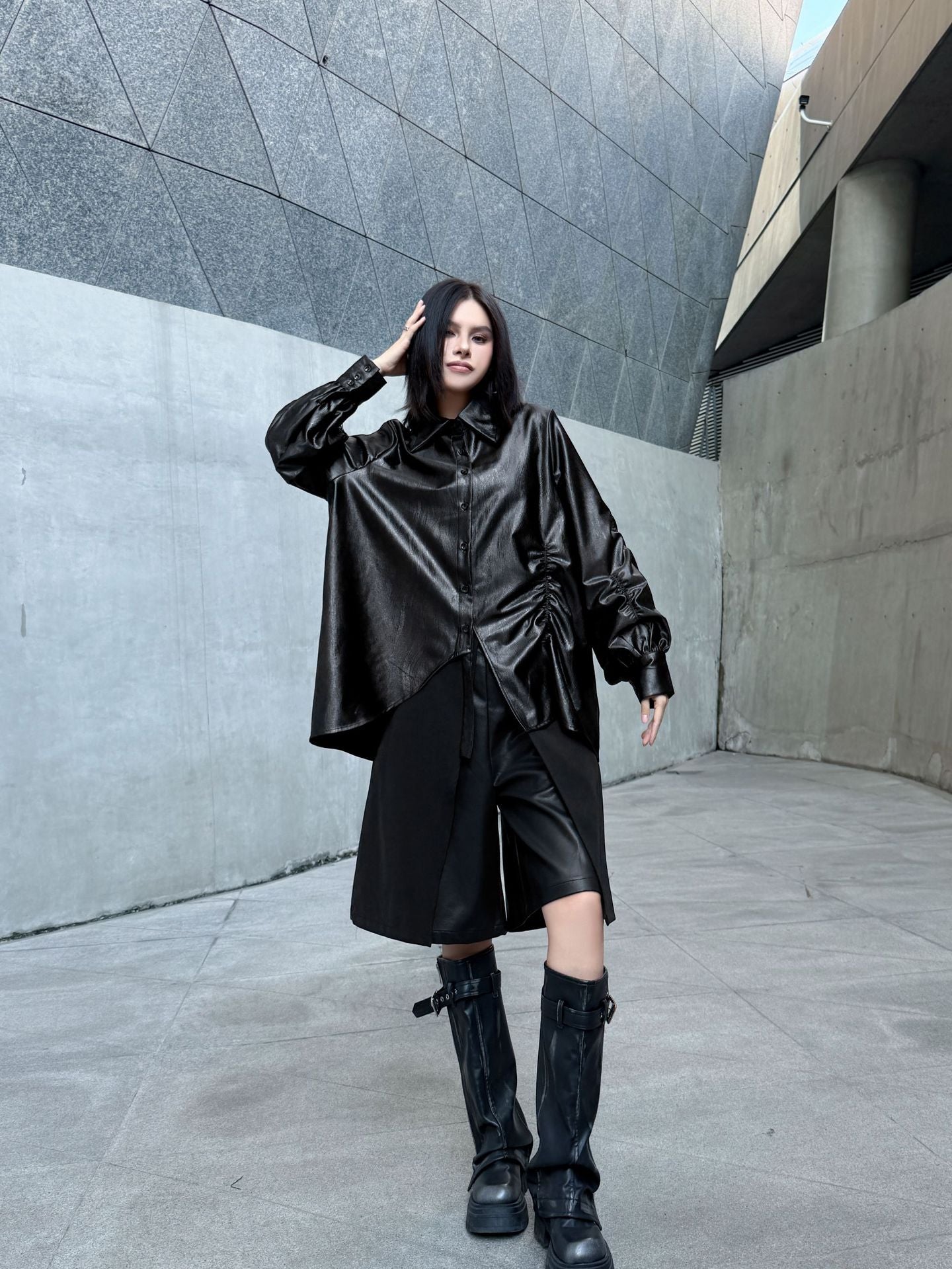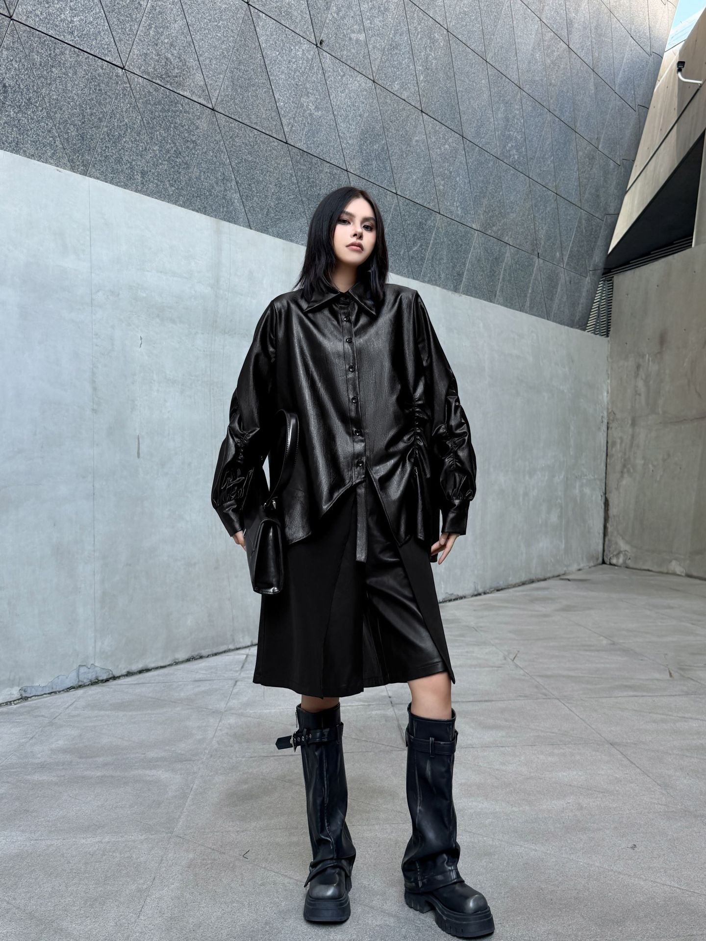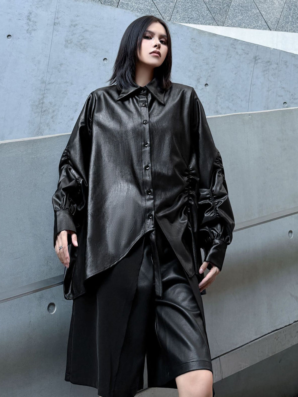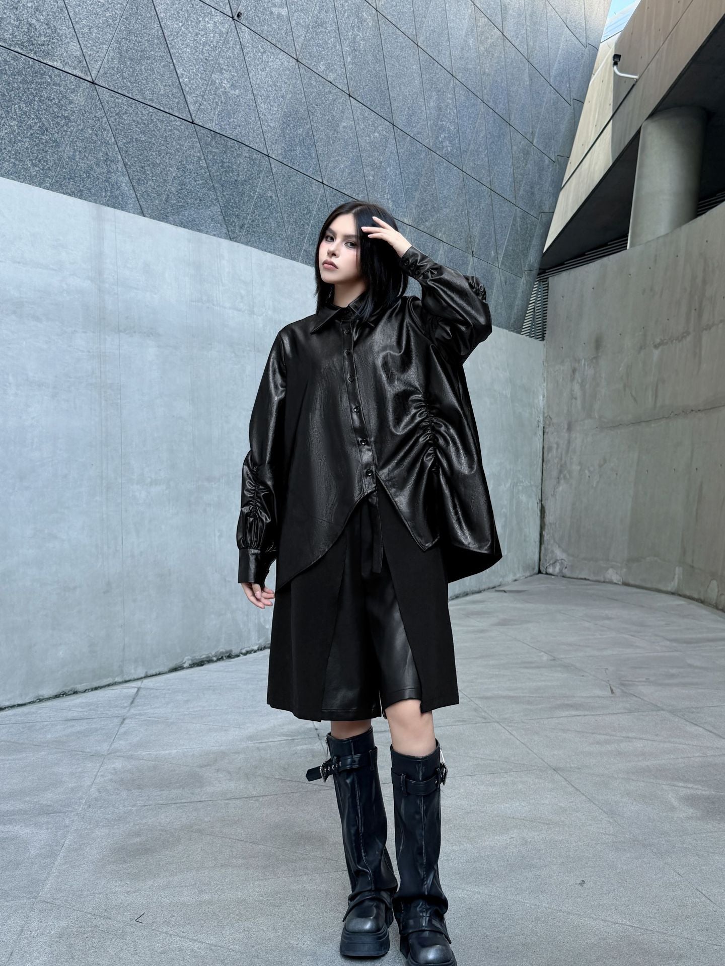 微光沢のある質感が特徴のシャツブラウス。立体的なギャザーを袖口とウエストラインに施し、自然なドレープを描くアートのような構築シルエットに仕上げた。リラックス感のあるオーバーフォルムが身体を包み、光の角度で陰影が変化する。シャープな襟と長めの袖バランスが洗練された存在感を引き立てる。単品でもレイヤードにも対応し、モードなスタイリングを演出。