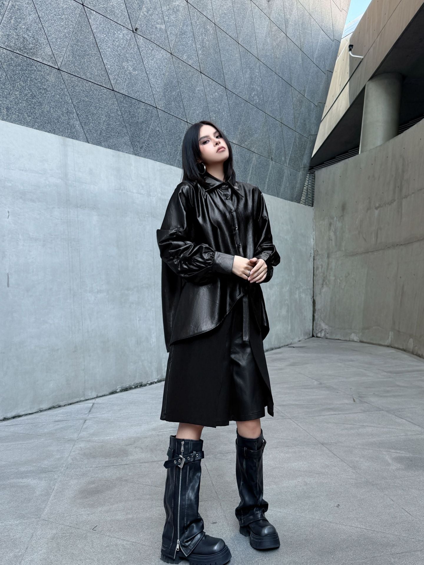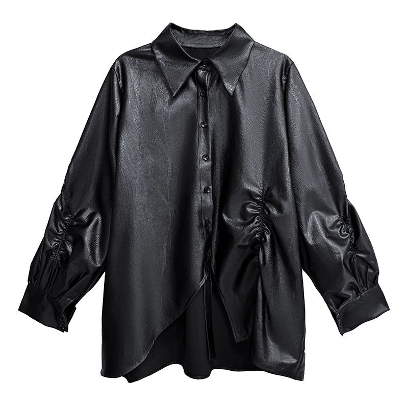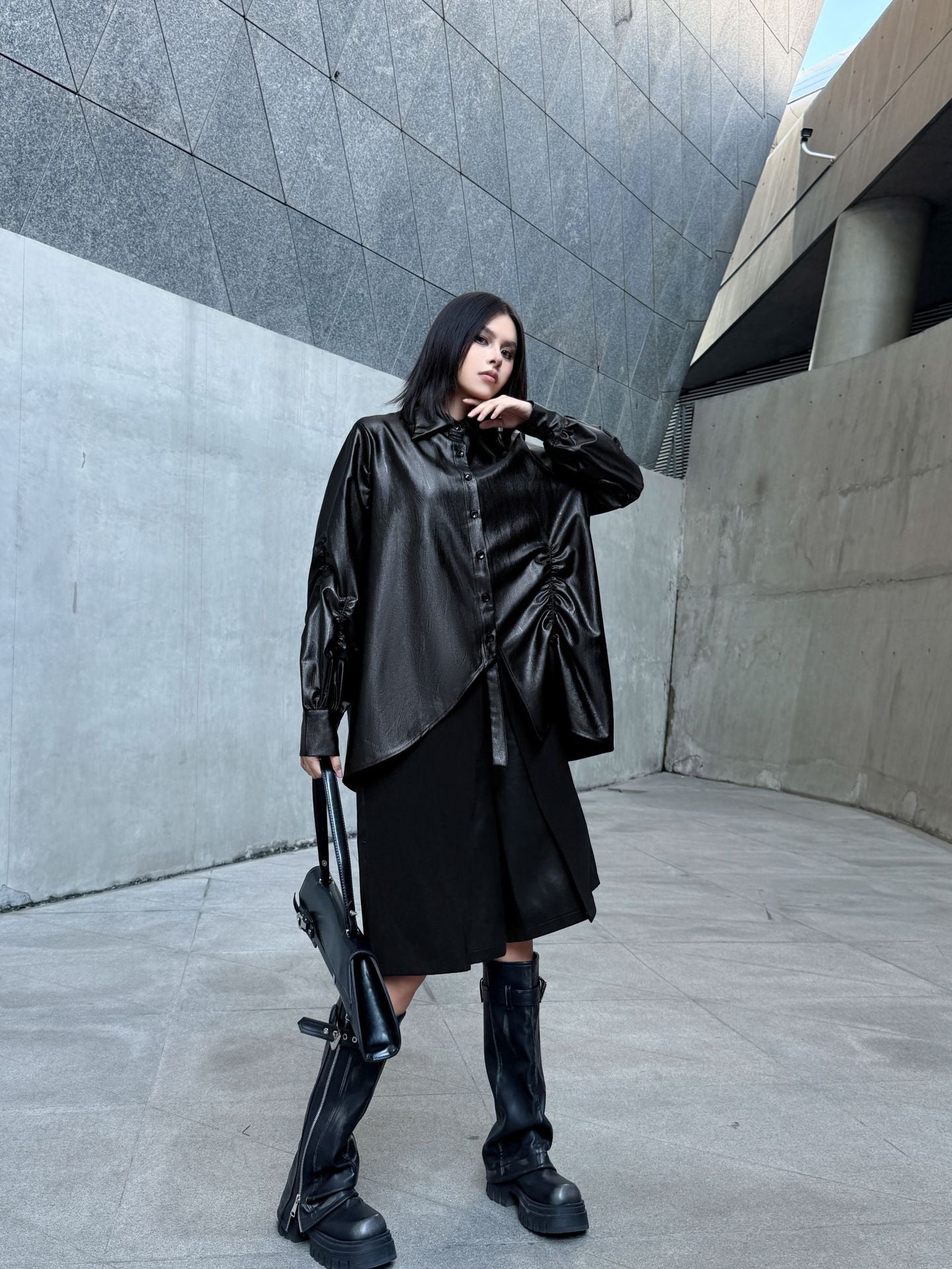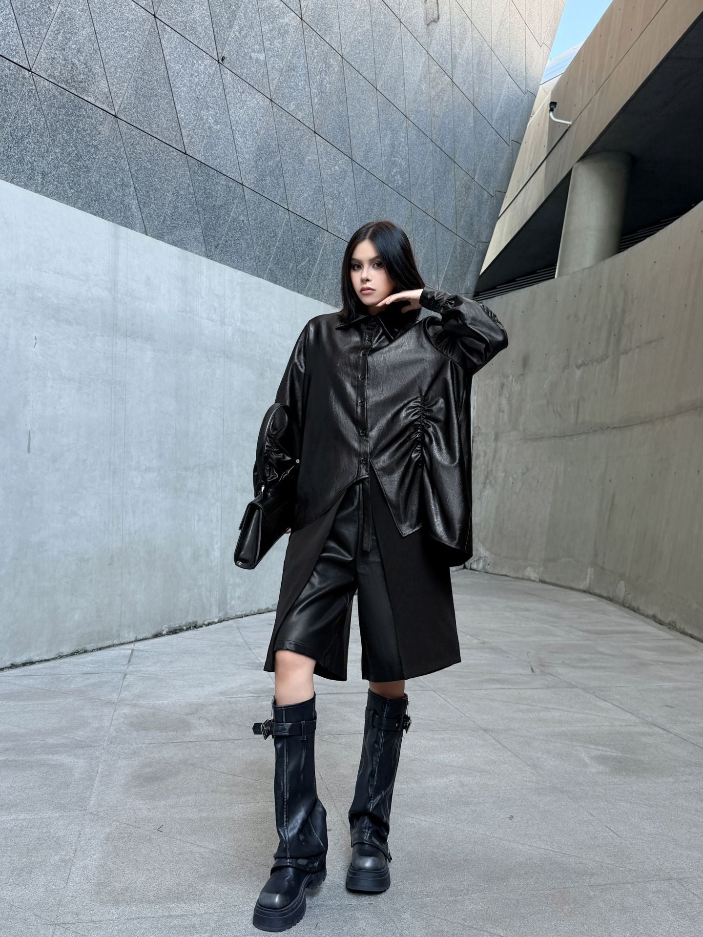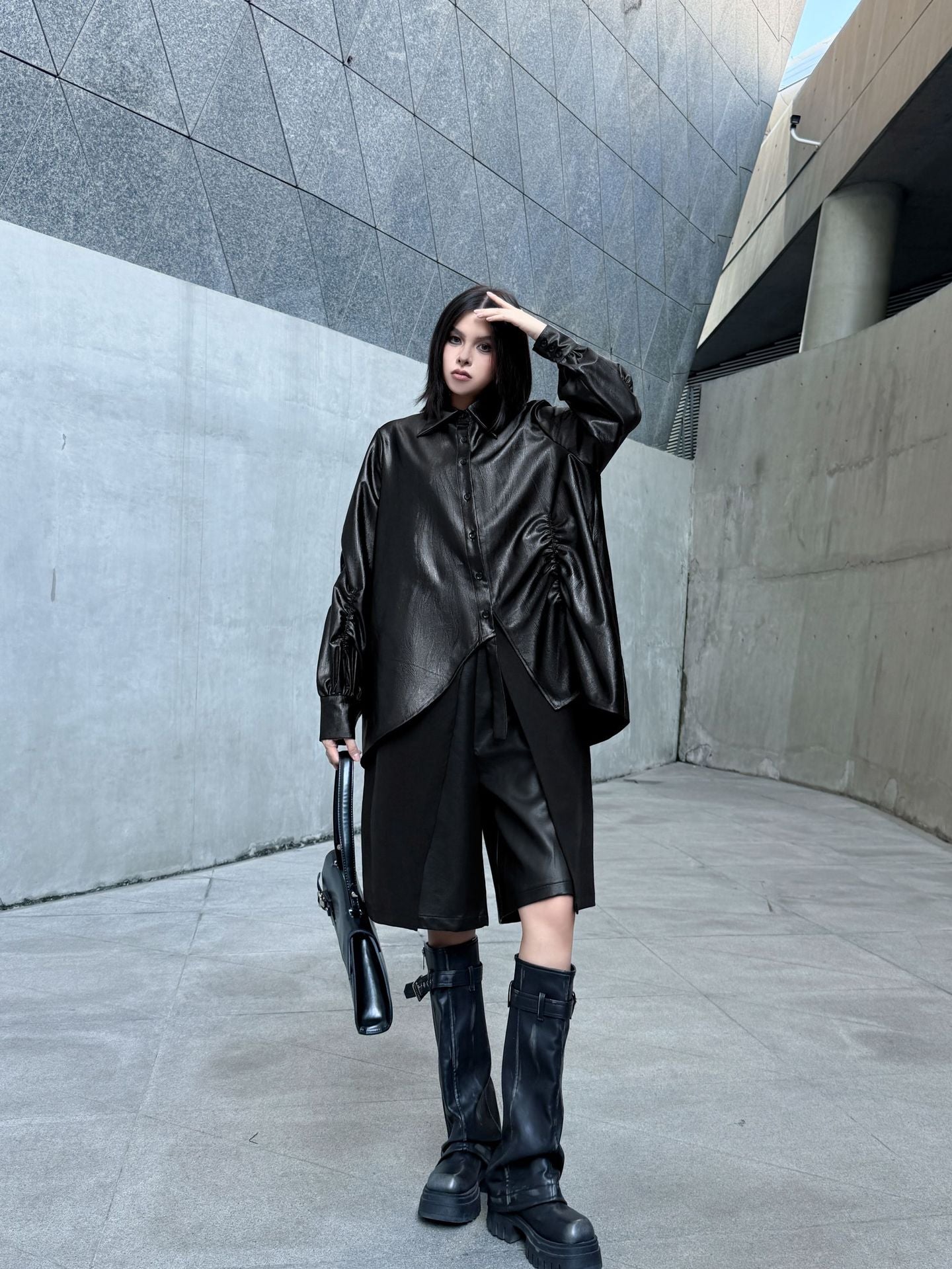 微光沢のある質感が特徴のシャツブラウス。立体的なギャザーを袖口とウエストラインに施し、自然なドレープを描くアートのような構築シルエットに仕上げた。リラックス感のあるオーバーフォルムが身体を包み、光の角度で陰影が変化する。シャープな襟と長めの袖バランスが洗練された存在感を引き立てる。単品でもレイヤードにも対応し、モードなスタイリングを演出。