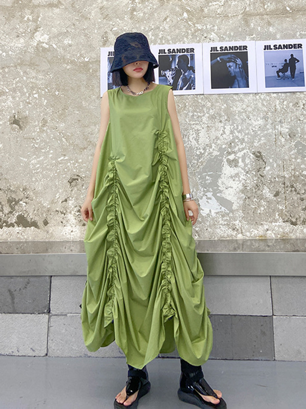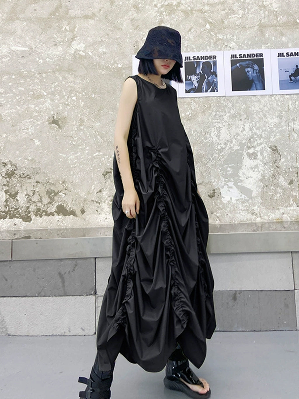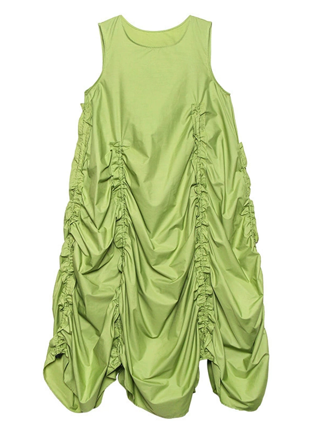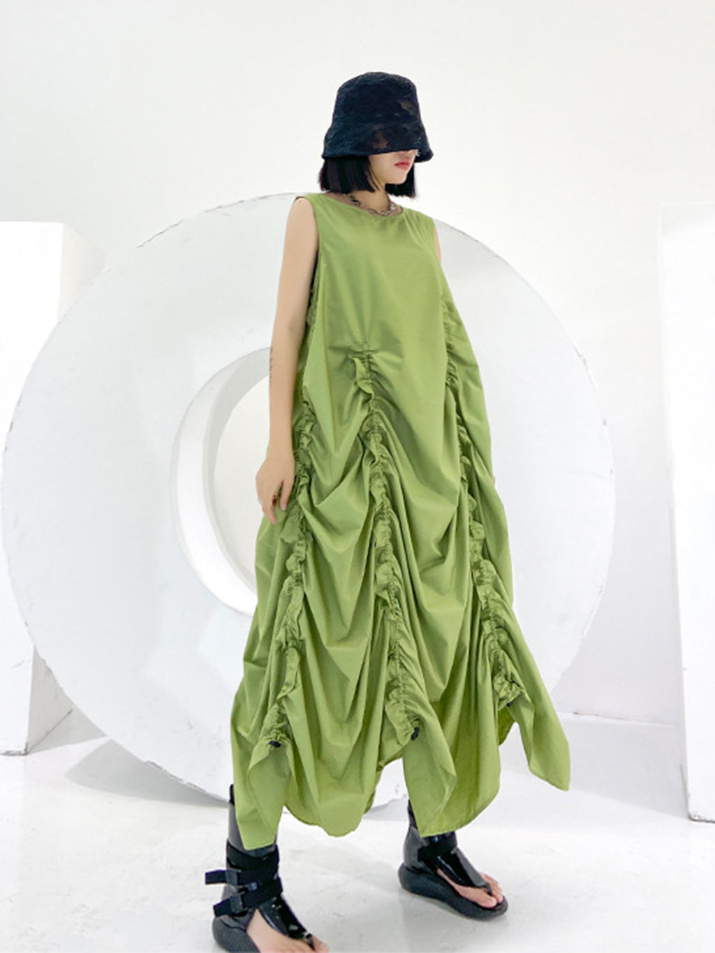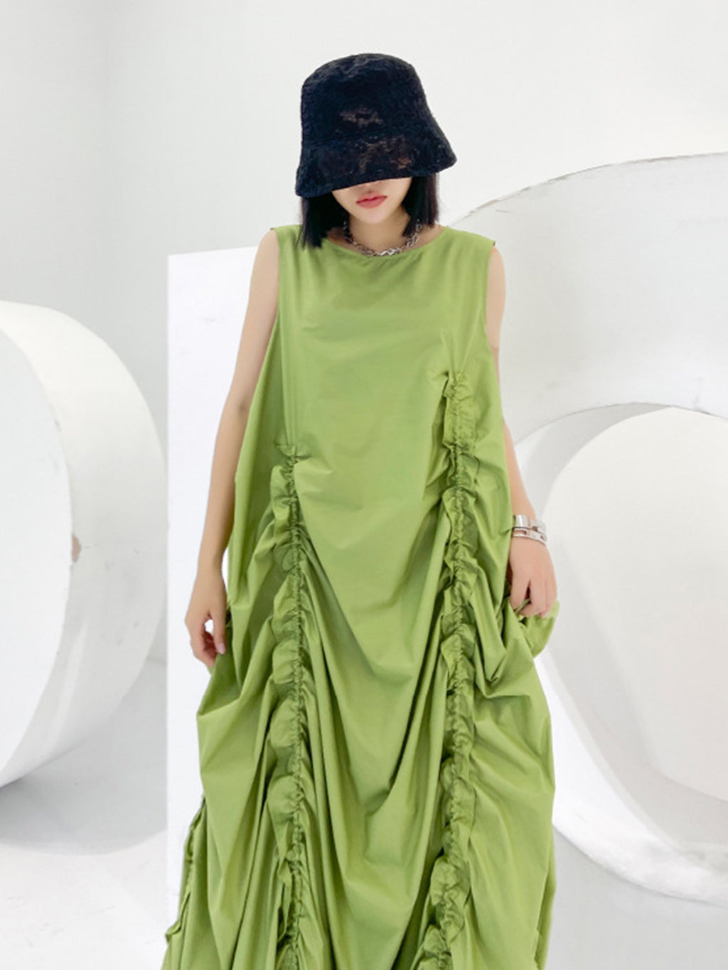 マットな質感の軽やかなファブリックに、前後4本のギャザードレープをたっぷりと施した立体構造。ノースリーブのシンプルな上半身と、裾にかけて大きく広がるボリュームラインが対照的なシルエットを描き、動きに合わせて表情を変えるデザイン。裾は自然なアーチを描きながら流れるように落ち、後ろ姿まで印象的に演出。軽やかな素材で夏場も涼しく、レイヤードや小物使いで多彩なスタイリングが楽しめる一着。