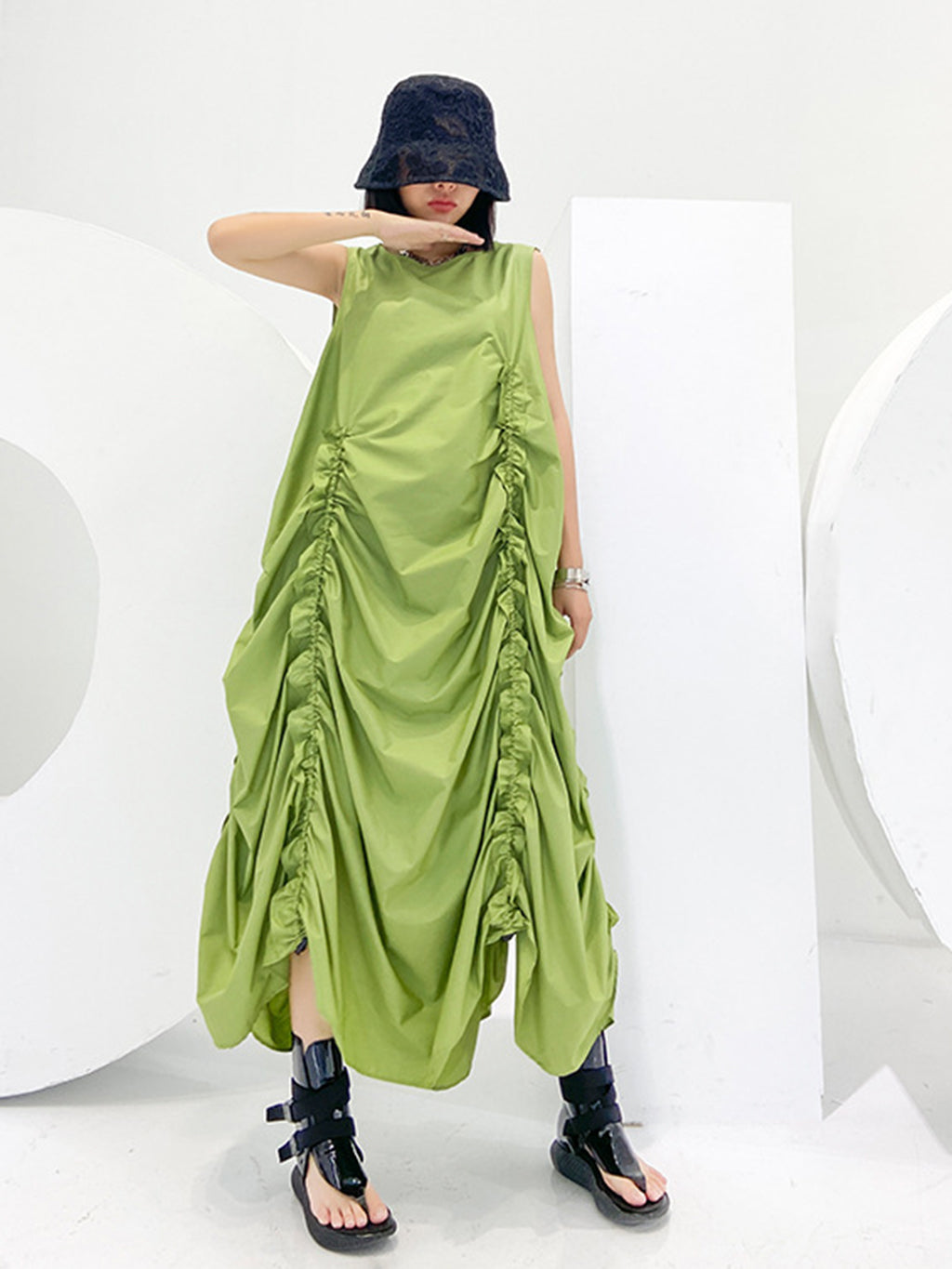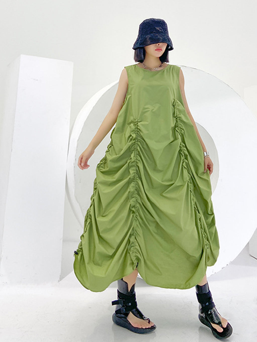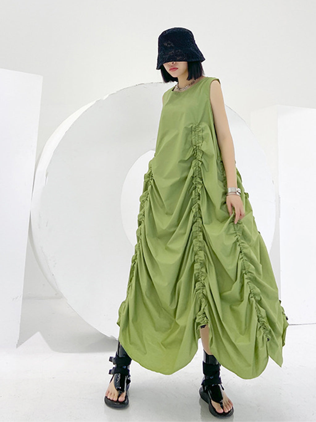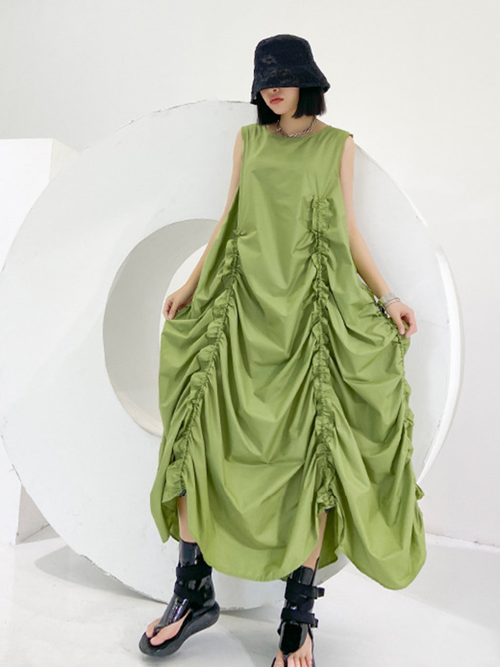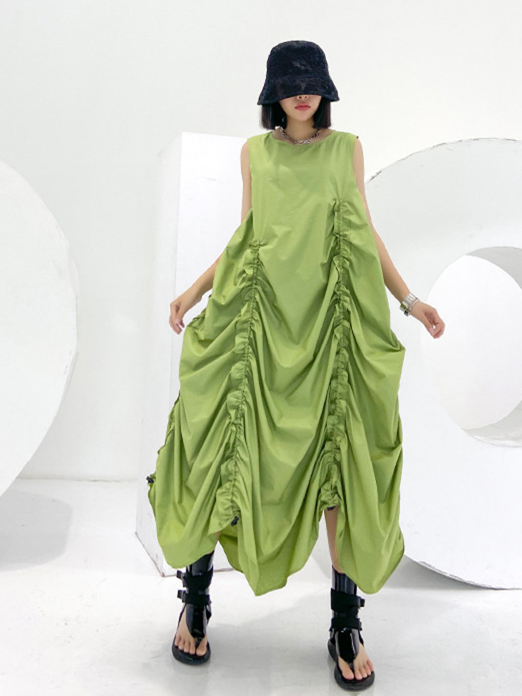 マットな質感の軽やかなファブリックに、前後4本のギャザードレープをたっぷりと施した立体構造。ノースリーブのシンプルな上半身と、裾にかけて大きく広がるボリュームラインが対照的なシルエットを描き、動きに合わせて表情を変えるデザイン。裾は自然なアーチを描きながら流れるように落ち、後ろ姿まで印象的に演出。軽やかな素材で夏場も涼しく、レイヤードや小物使いで多彩なスタイリングが楽しめる一着。