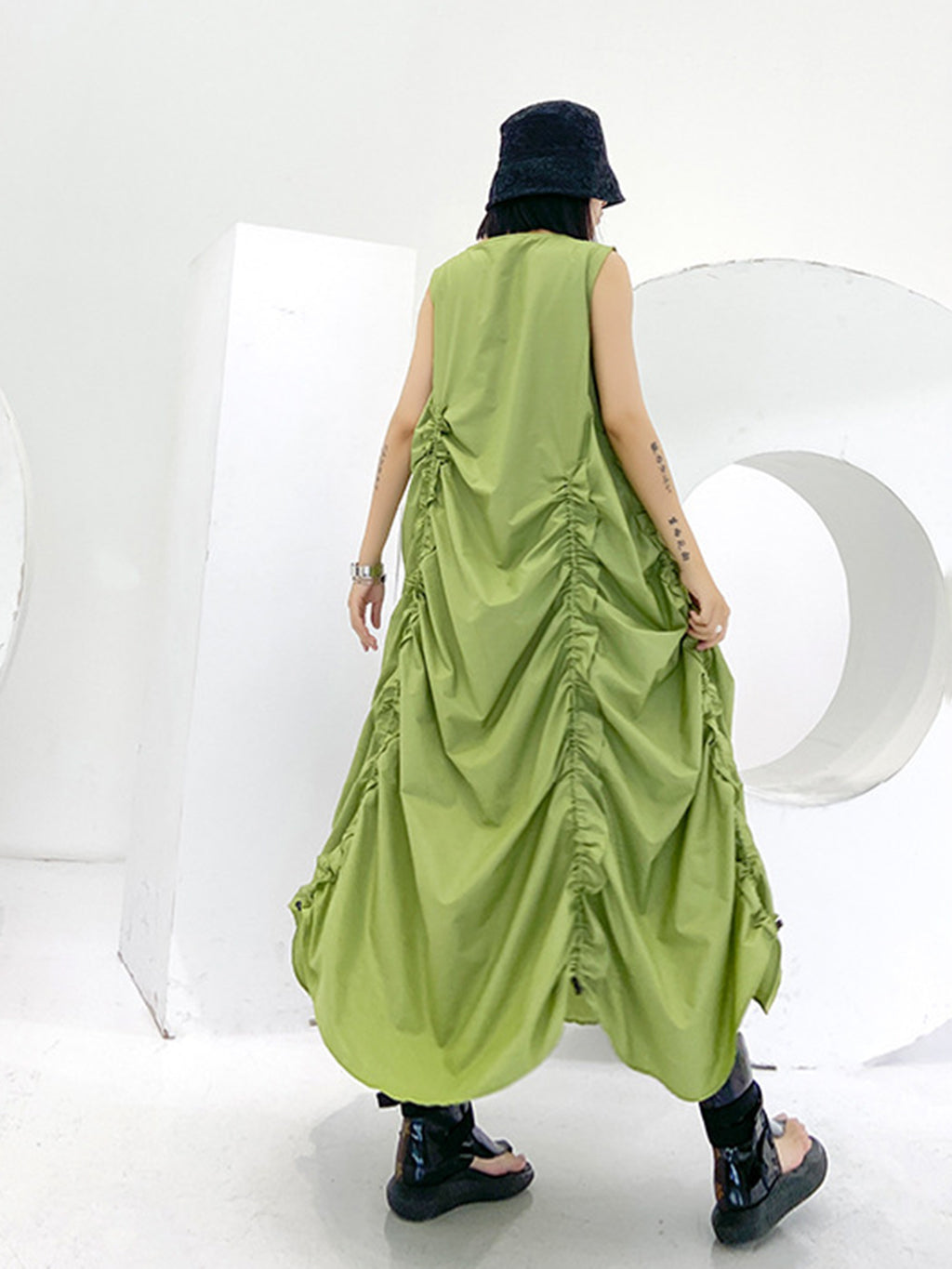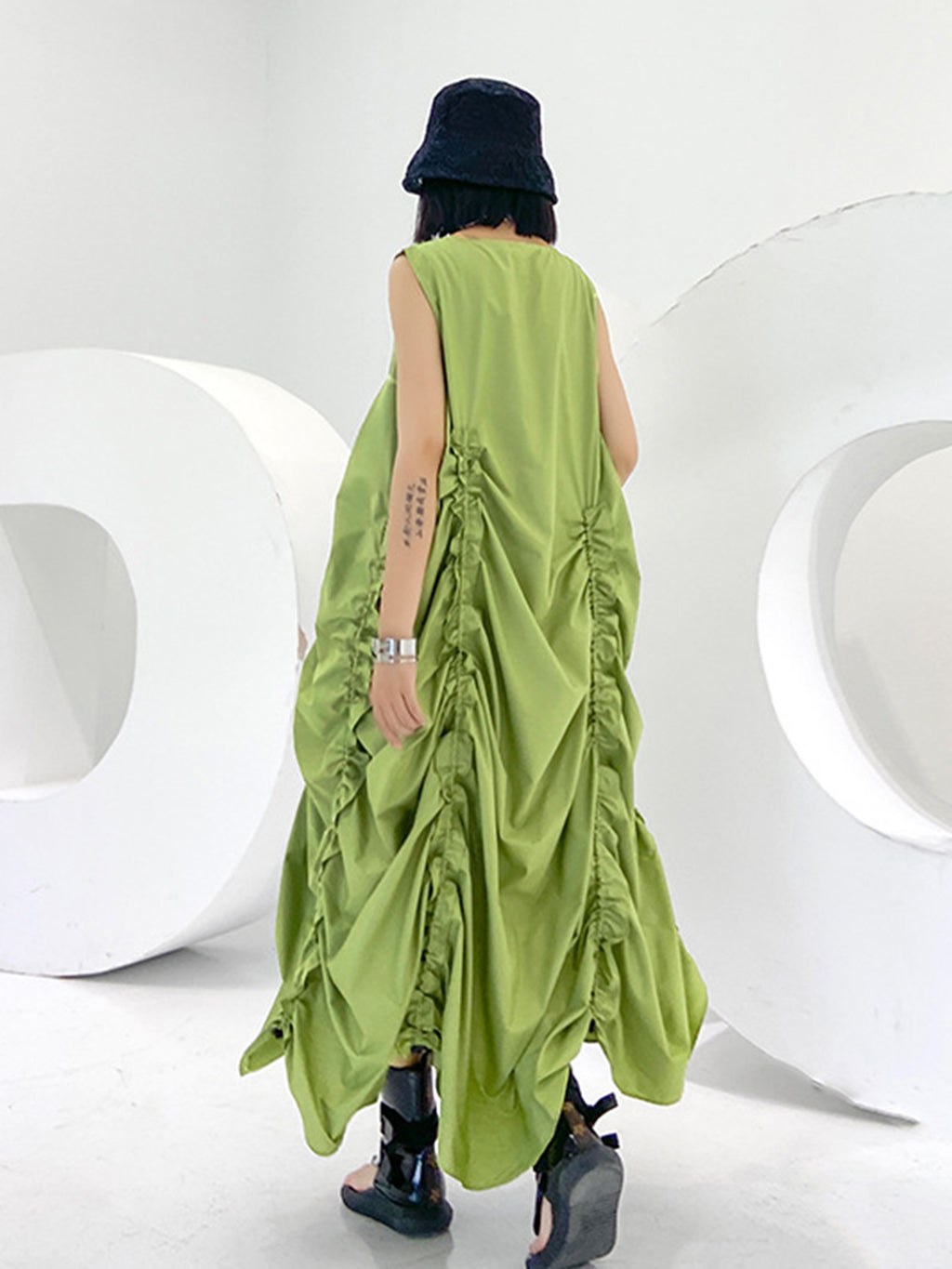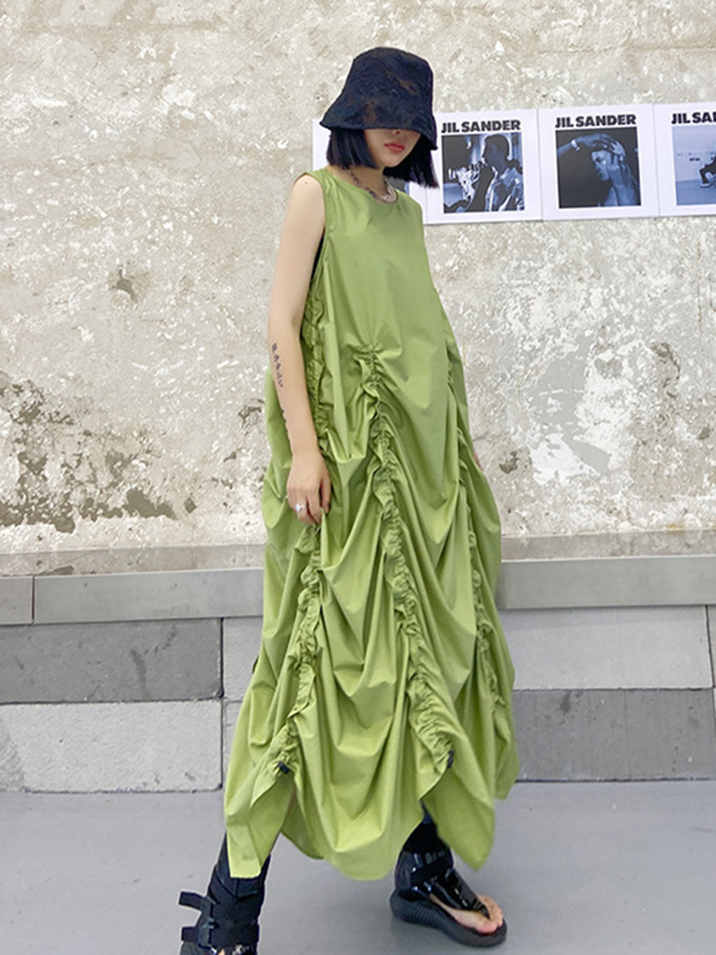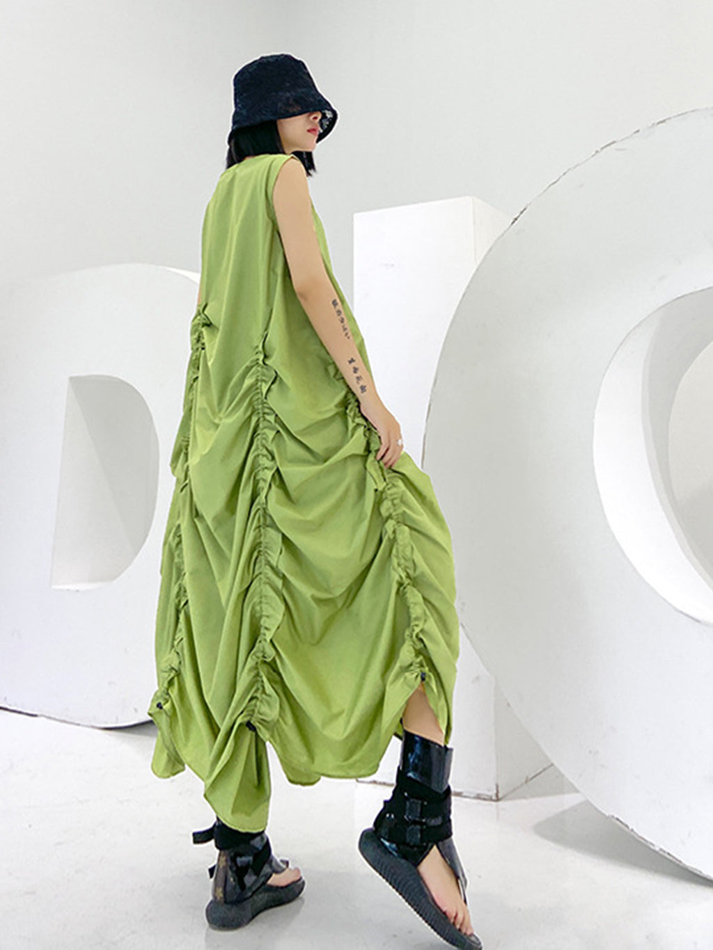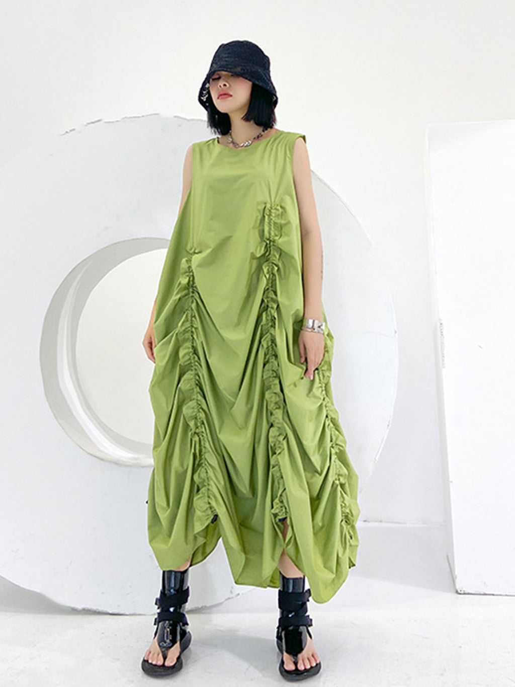 マットな質感の軽やかなファブリックに、前後4本のギャザードレープをたっぷりと施した立体構造。ノースリーブのシンプルな上半身と、裾にかけて大きく広がるボリュームラインが対照的なシルエットを描き、動きに合わせて表情を変えるデザイン。裾は自然なアーチを描きながら流れるように落ち、後ろ姿まで印象的に演出。軽やかな素材で夏場も涼しく、レイヤードや小物使いで多彩なスタイリングが楽しめる一着。