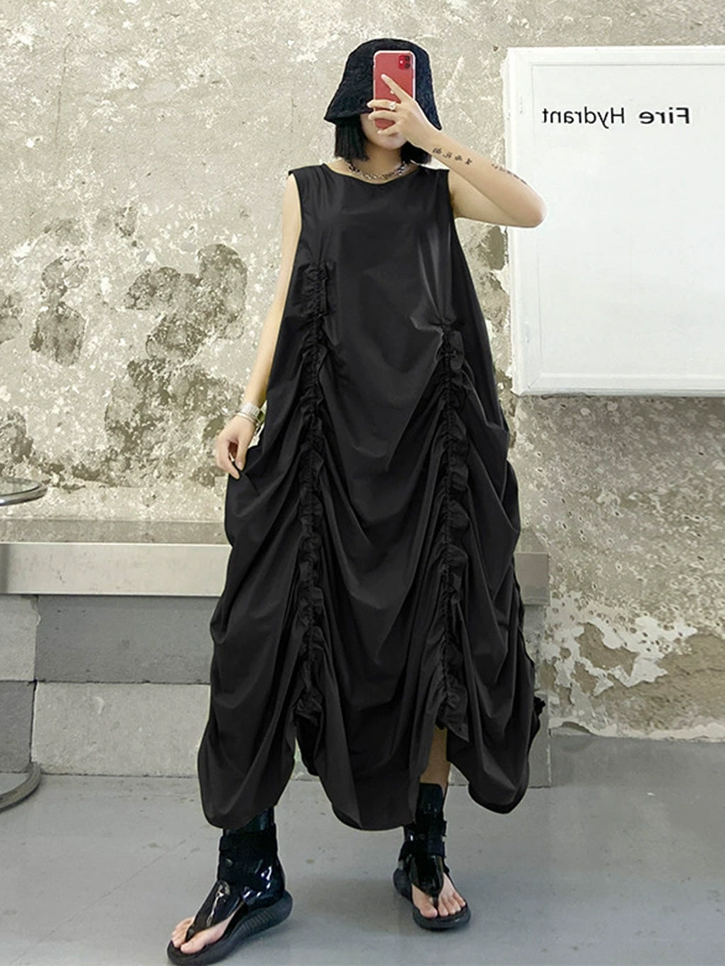 マットな質感の軽やかなファブリックに、前後4本のギャザードレープをたっぷりと施した立体構造。ノースリーブのシンプルな上半身と、裾にかけて大きく広がるボリュームラインが対照的なシルエットを描き、動きに合わせて表情を変えるデザイン。裾は自然なアーチを描きながら流れるように落ち、後ろ姿まで印象的に演出。軽やかな素材で夏場も涼しく、レイヤードや小物使いで多彩なスタイリングが楽しめる一着。