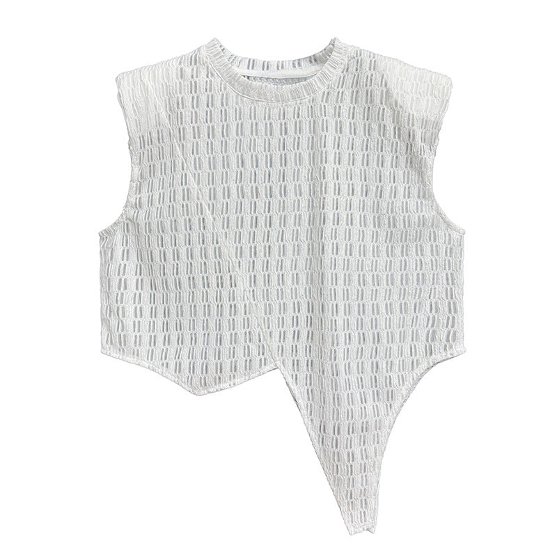 幾何柄のような透かし織りが特徴のノースリーブトップ。裾を大胆にカットした独自のカーブラインが視線を引き寄せる。軽やかな薄手素材が涼感を生み、レイヤードのアクセントとしても活躍。フレンチスリーブ寄りのショルダーラインが肩周りを自然にカバーし、モード感と抜け感を両立。ベーシックカラー展開で着回し力にも優れる。