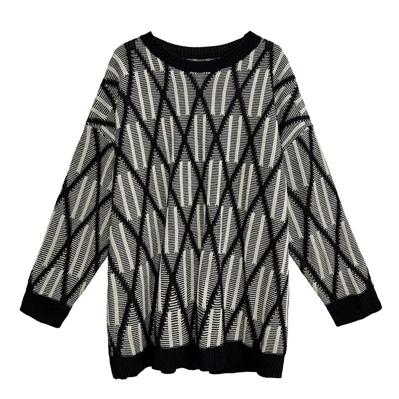 立体感のあるジオメトリック柄をジャカード編みで構築したニットプルオーバー。肩を落としたリラックスシルエットと長めの着丈がモダンなバランスを生み出す。リブ仕様の襟・袖・裾が全体を引き締め、グラフィカルな編地との対比が印象的。軽量で柔らかな風合いのコットンニット素材が心地よく、単品でもレイヤードでも存在感を発揮する。