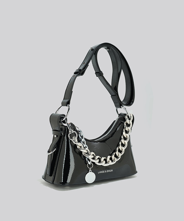艶やかな表面感のボディに存在感のあるチェーンを重ねたミニショルダー。間口は緩やかなカーブで開閉しやすいファスナー仕様。底面にメタルスタッズを配置し、置いたときの安定感とキズつきにくさを確保。丸チャームが揺れるフロントチェーンはアクセント。ストラップは長さ調整可能で肩掛けにもクロスボディにも対応。小ぶりながらマチを確保し、必需品をすっきり収納できる設計。