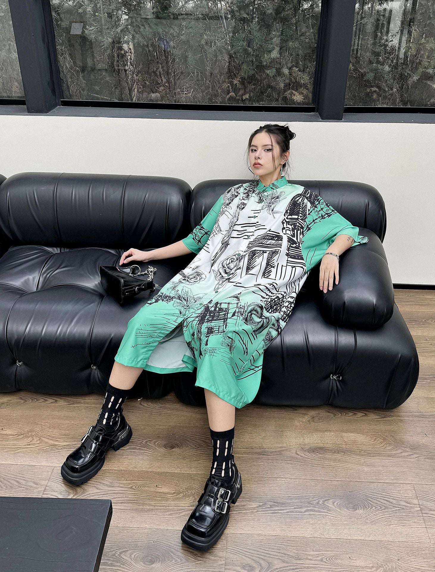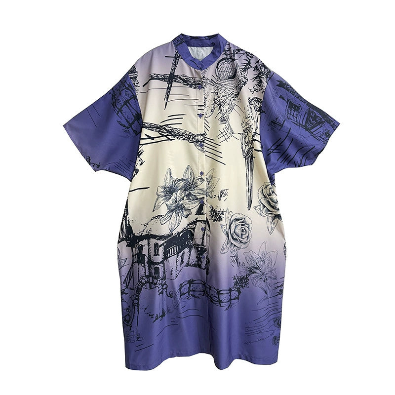 光沢感のある素材に大胆なラインアートのグラフィックと花柄を重ねたデザインが印象的なドレス。ストンと落ちるゆとりのあるシルエットが体のラインを拾わず、着心地は軽やか。襟元はコンパクトな立ち襟風に仕立て、モードな雰囲気を漂わせる。半袖の程よい抜け感とミドル丈がバランス良く、パンツとのレイヤードも映える。アートとファッションを融合させた存在感のある一枚。