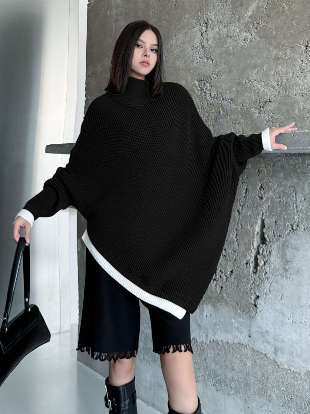 ケープのような広がりを持つ立体ニットトップ。ハイネックとシャープなカラーデザインがバランスを取り、首元から肩にかけてのラインを美しく見せる。裾にかけて流れるように広がるフォルムが軽やかな動きを生み、ホワイトの縁取りがコントラストを添える。厚みのあるリブ編みで仕立てられ、体を包み込むようなシルエットが特徴。単体でもレイヤードでもスタイルを引き立てる構築的な一着。
