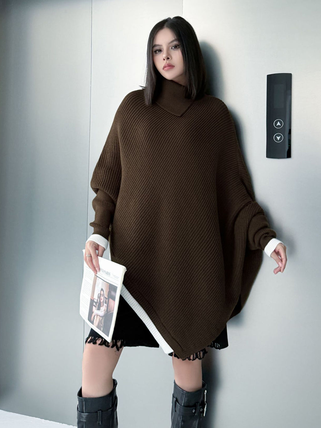 ケープのような広がりを持つ立体ニットトップ。ハイネックとシャープなカラーデザインがバランスを取り、首元から肩にかけてのラインを美しく見せる。裾にかけて流れるように広がるフォルムが軽やかな動きを生み、ホワイトの縁取りがコントラストを添える。厚みのあるリブ編みで仕立てられ、体を包み込むようなシルエットが特徴。単体でもレイヤードでもスタイルを引き立てる構築的な一着。
