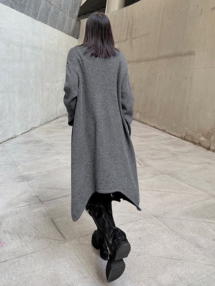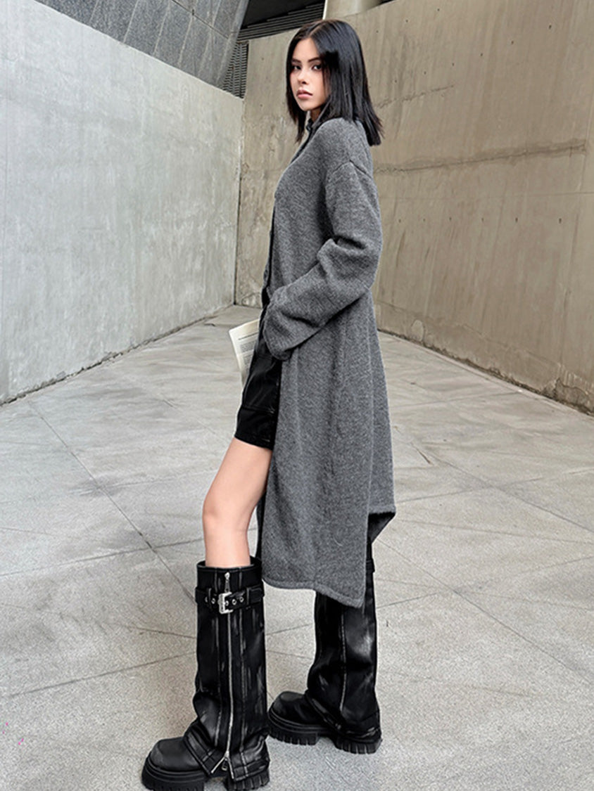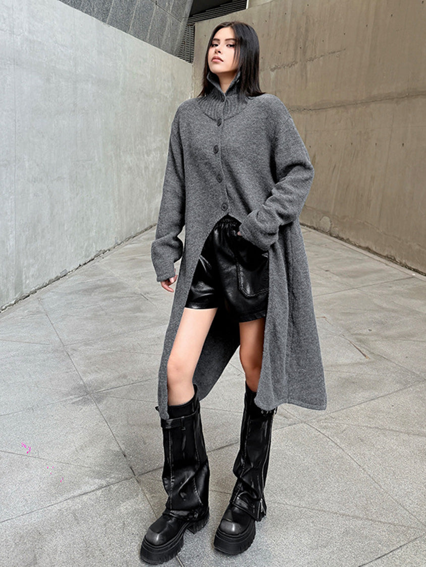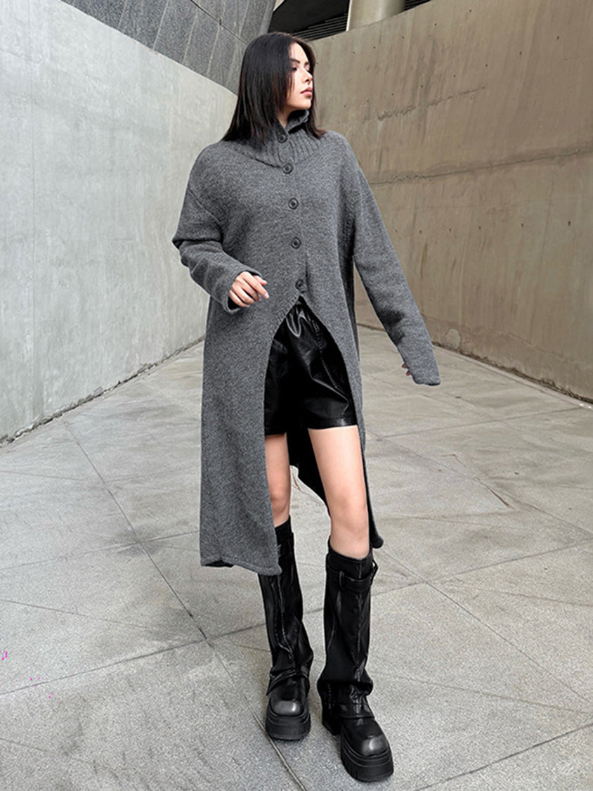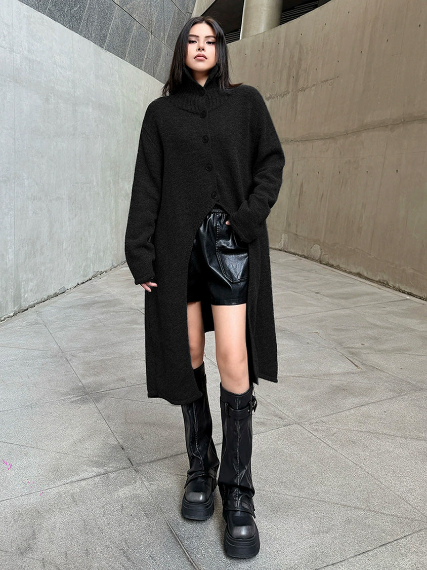 立ち上がるリブネックから続くボタン配置が上部を引き締め、前方に向けて開くスリットが流れを生むロングニット構成。肩を落としたフォルムが輪郭を柔らげ、重なり合う編地が下方へ向かうほどゆとりを強める。歩きに合わせて揺れる裾が縦方向の印象を整え、全体を軽快にまとめるデザイン。