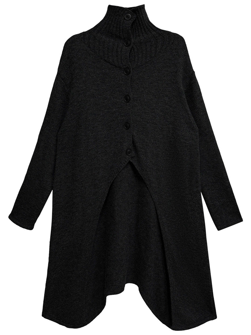 立ち上がるリブネックから続くボタン配置が上部を引き締め、前方に向けて開くスリットが流れを生むロングニット構成。肩を落としたフォルムが輪郭を柔らげ、重なり合う編地が下方へ向かうほどゆとりを強める。歩きに合わせて揺れる裾が縦方向の印象を整え、全体を軽快にまとめるデザイン。