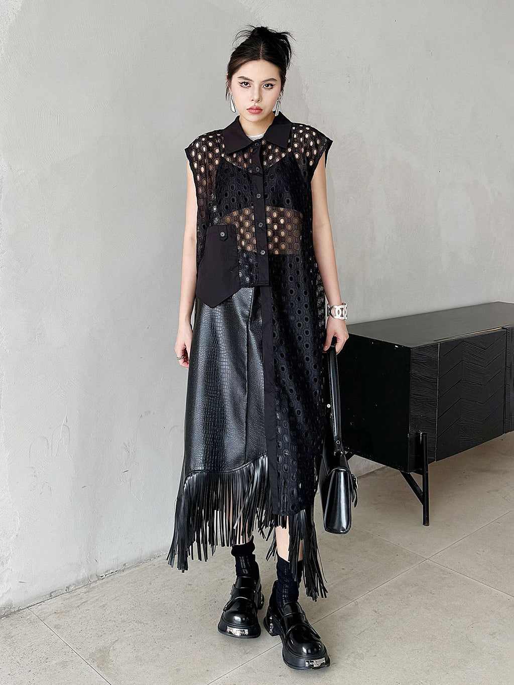 立体感のある丸型ホールが全体に施されたシアー素材のロングブラウス。アシンメトリックな着丈とスリットの効いたシルエットが動きに合わせて揺れ、レイヤードスタイルに映える構成。クラシカルなシャツ襟と片胸のポケットディテールが加わり、構築的ながら抜け感のある印象に仕上がる。ブラックとホワイトの2色展開で、スタイリング次第でモードからストリートまで自在に対応