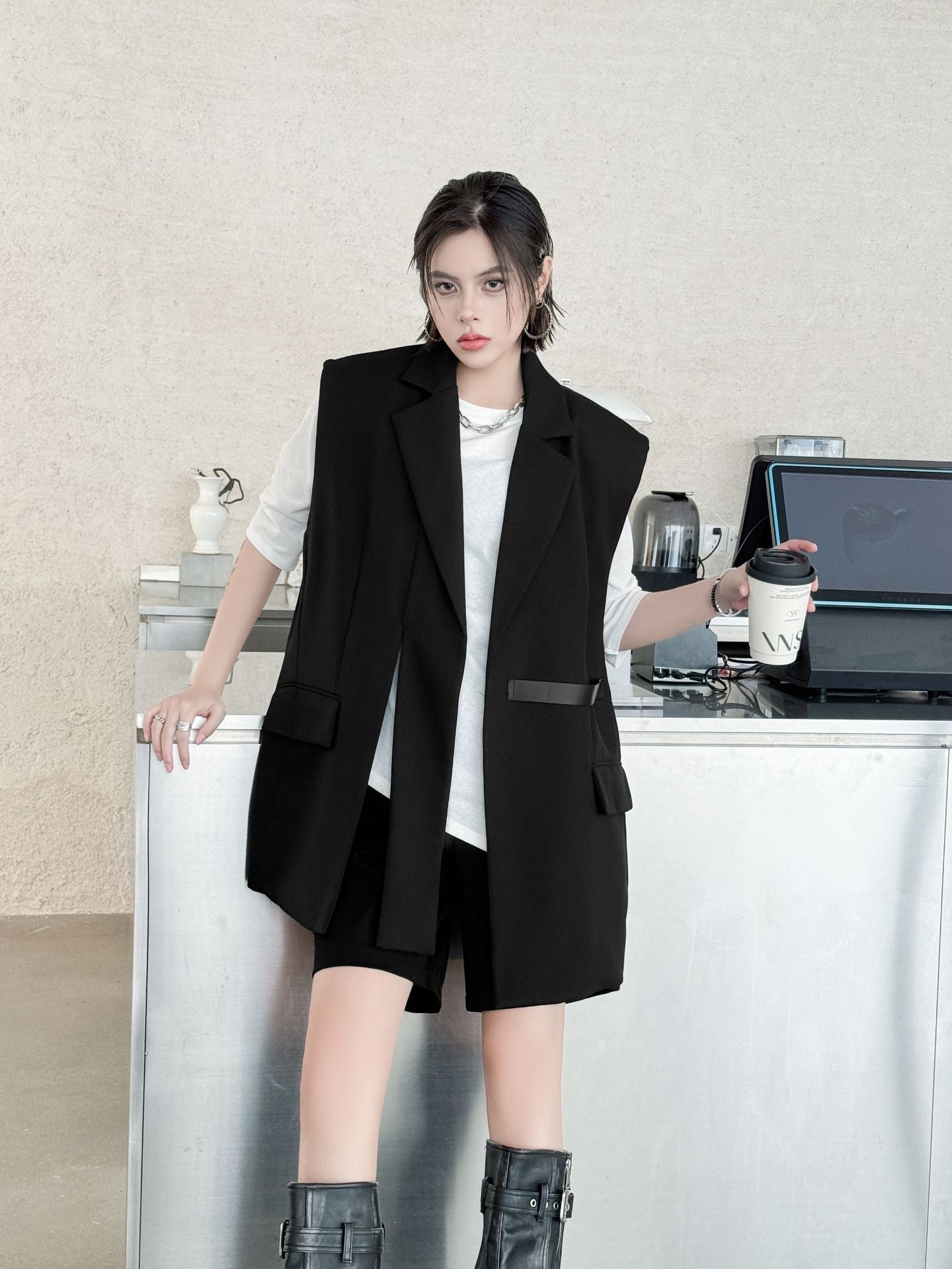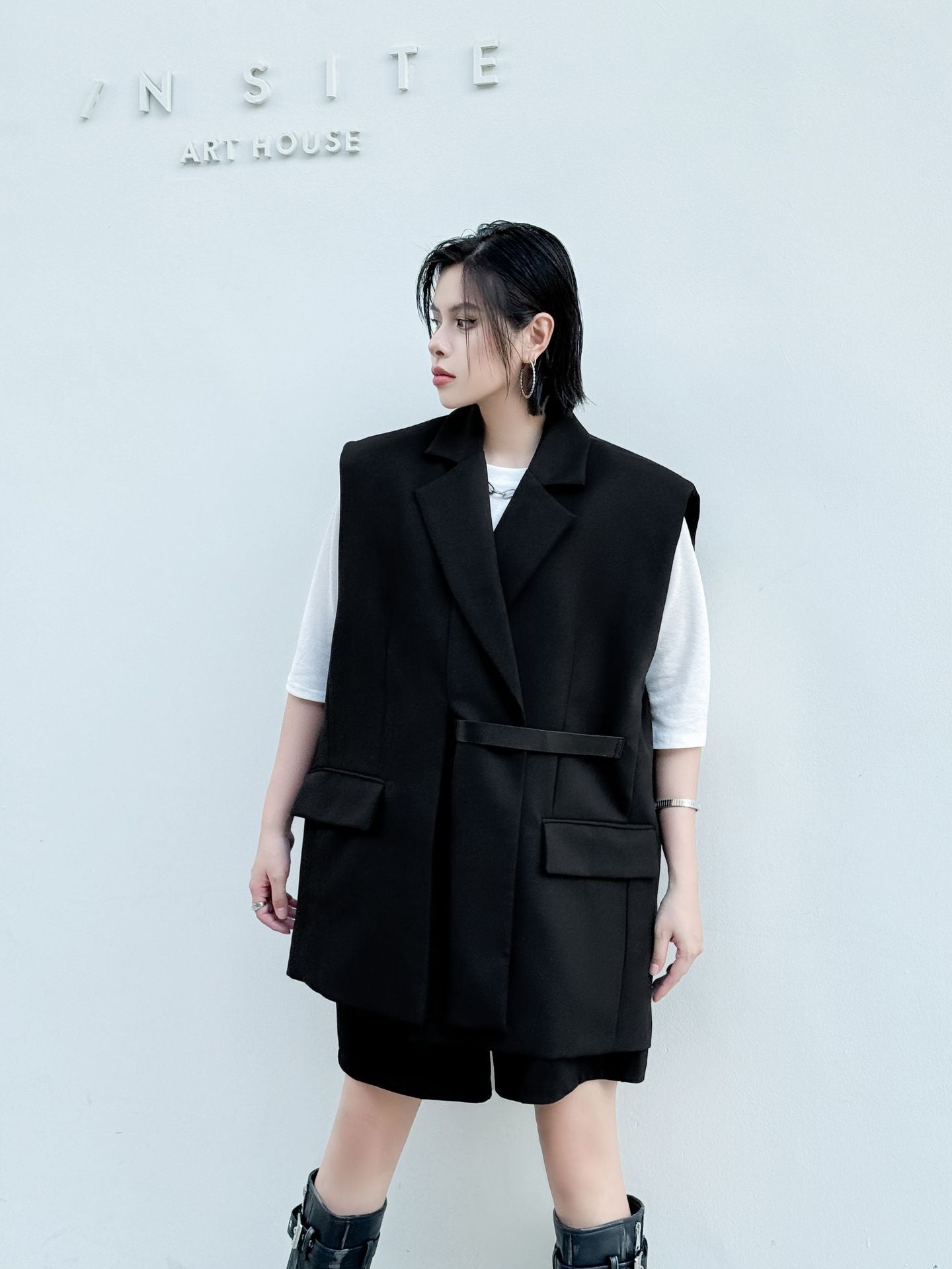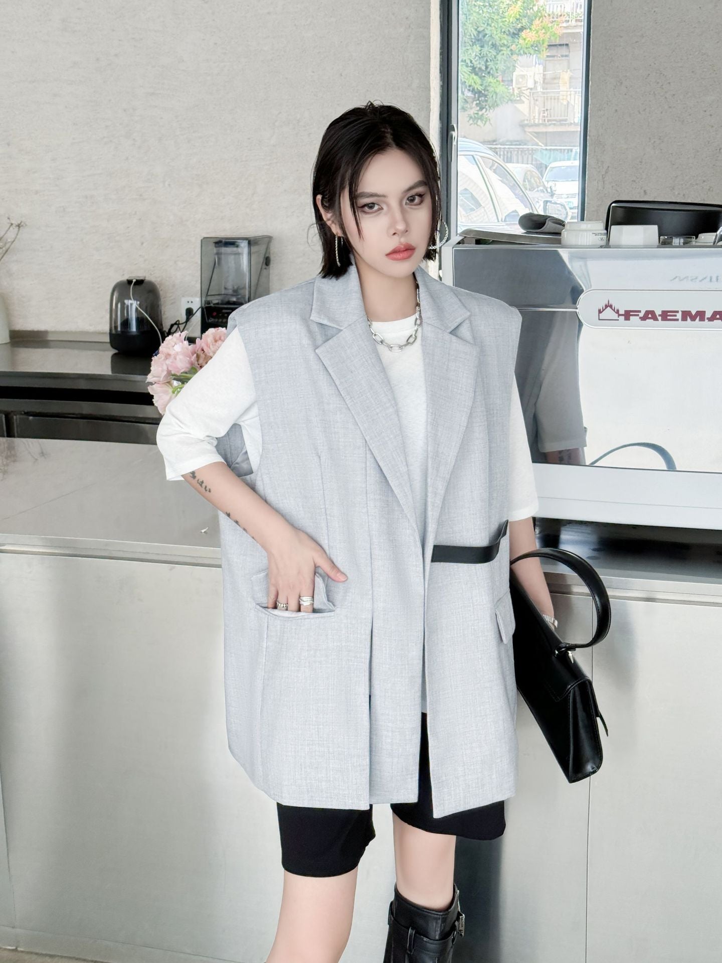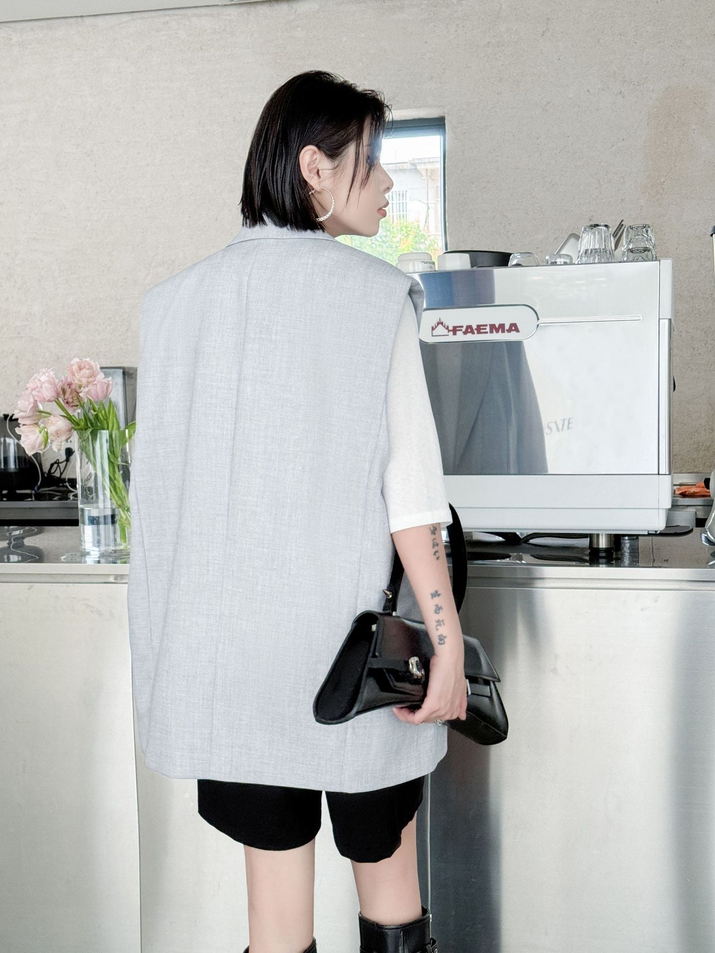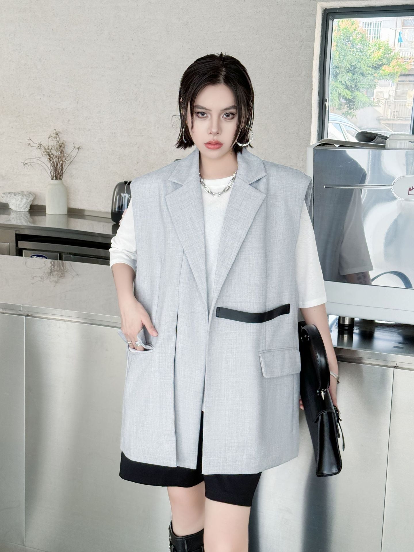 クラシカルなジャケットのムードを残しつつ、軽やかなノースリーブ仕立てで再構築したパッチワークベスト。