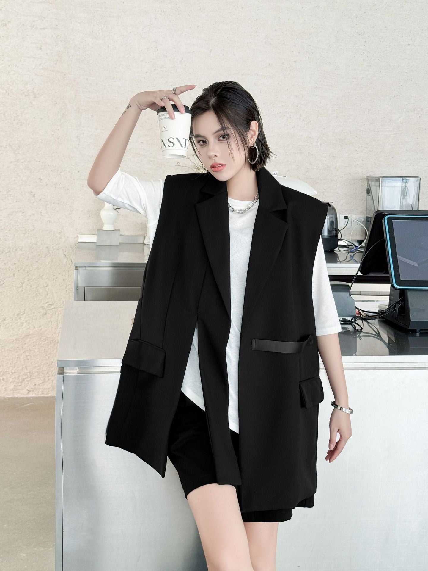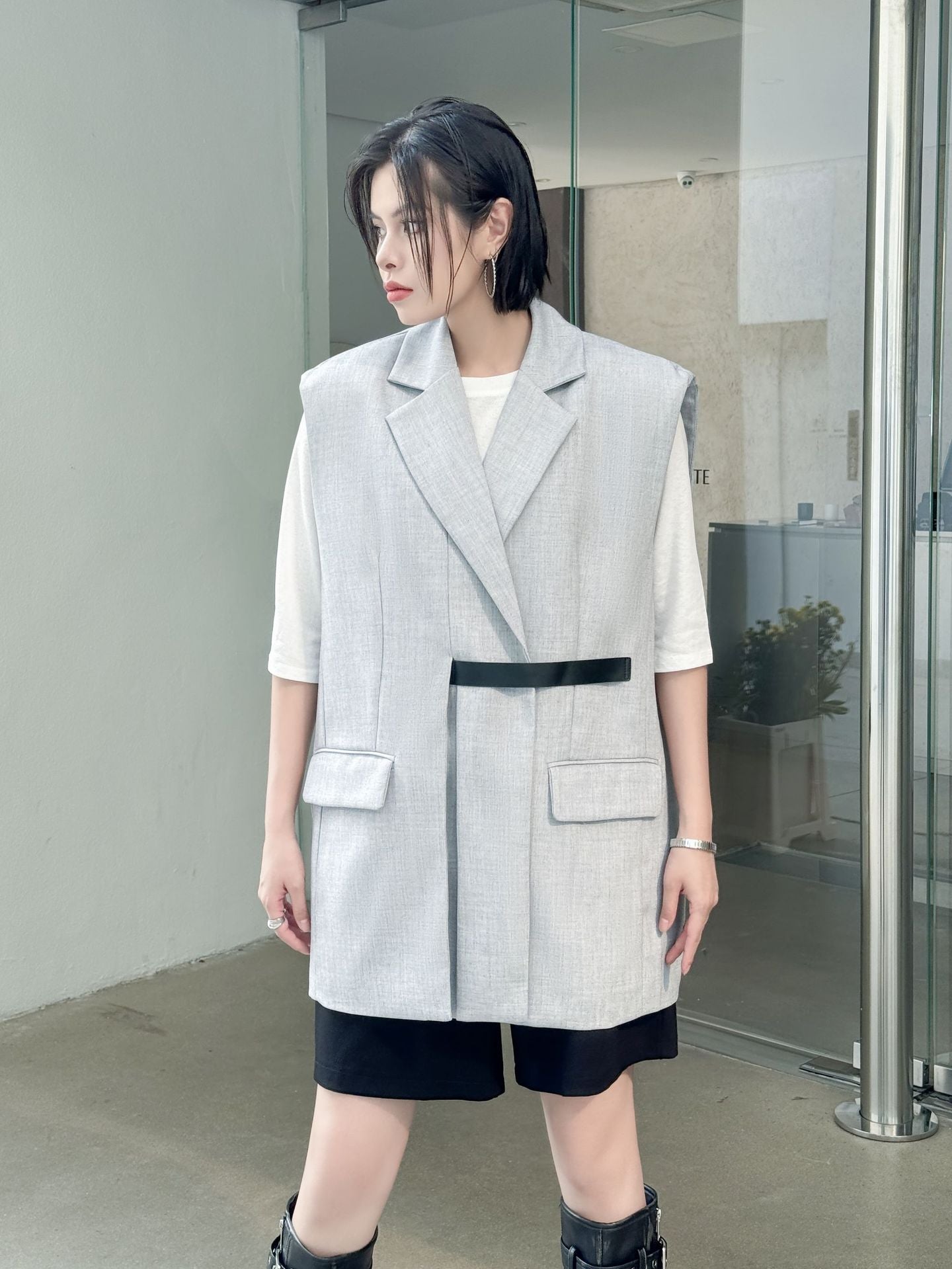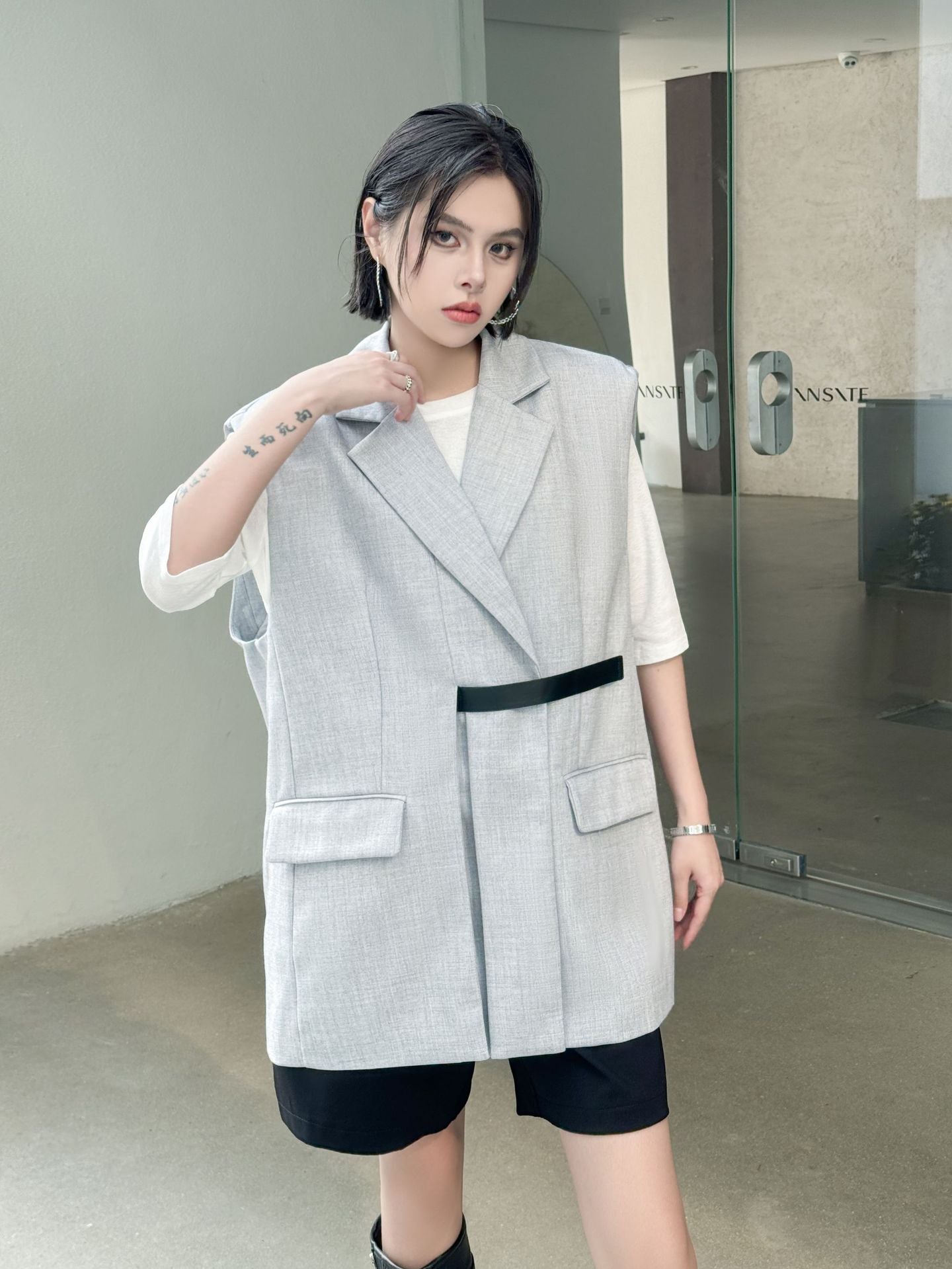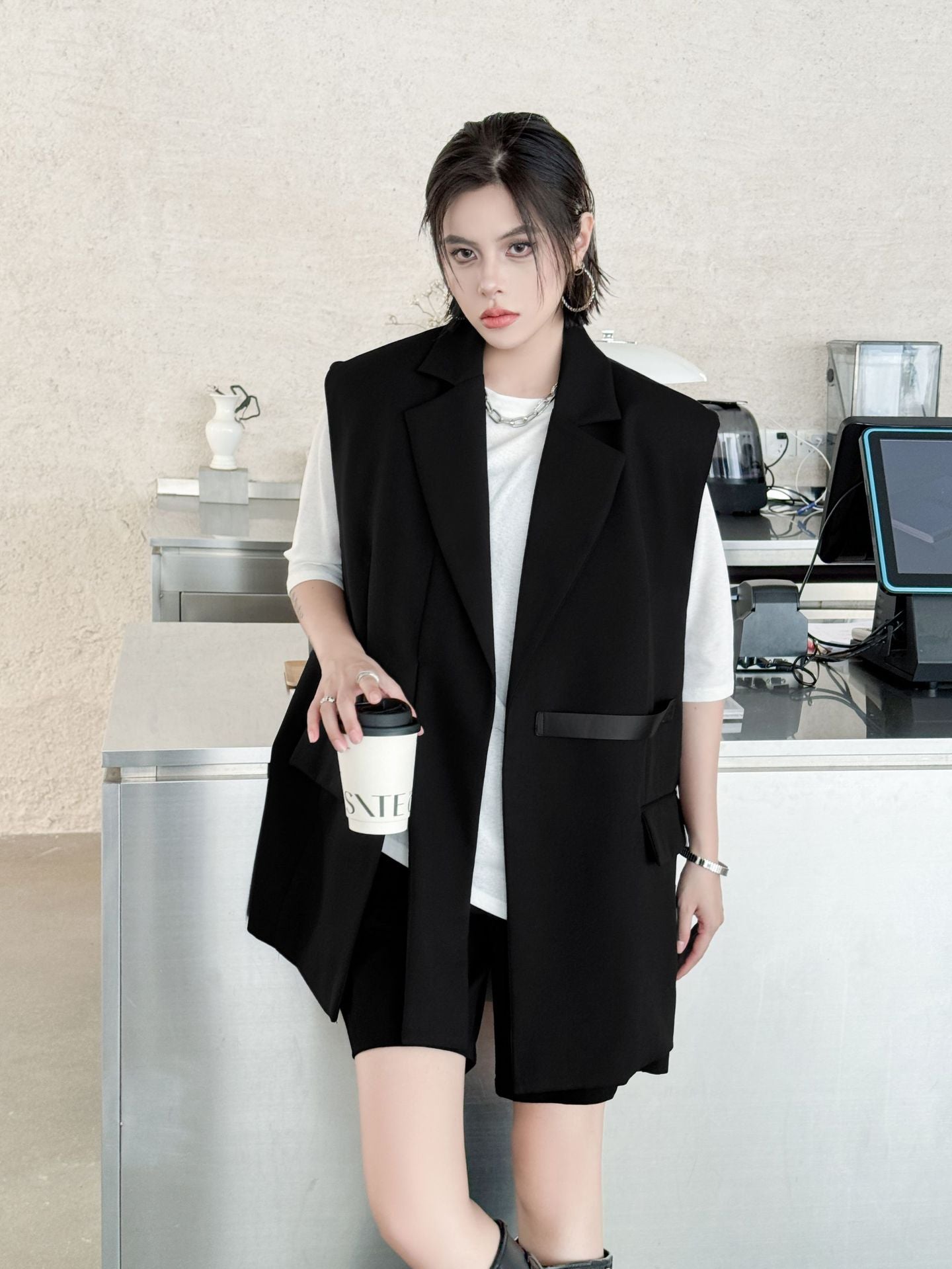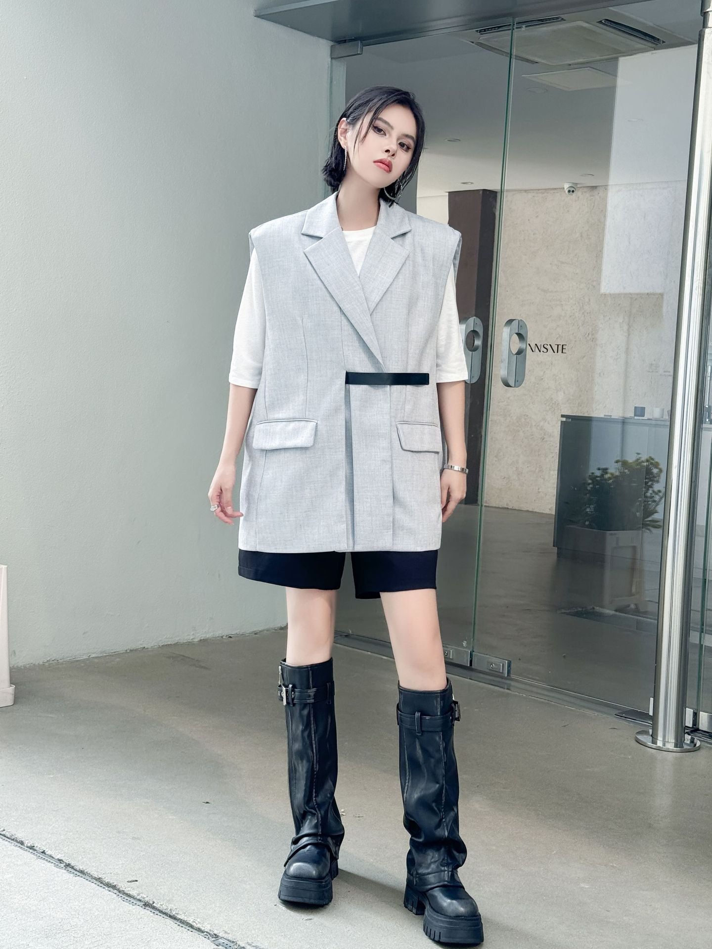 クラシカルなジャケットのムードを残しつつ、軽やかなノースリーブ仕立てで再構築したパッチワークベスト。