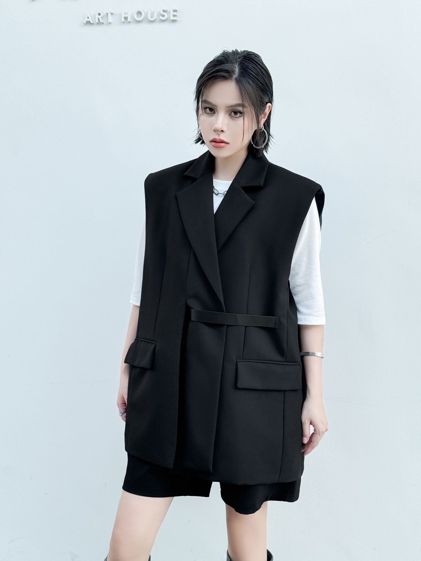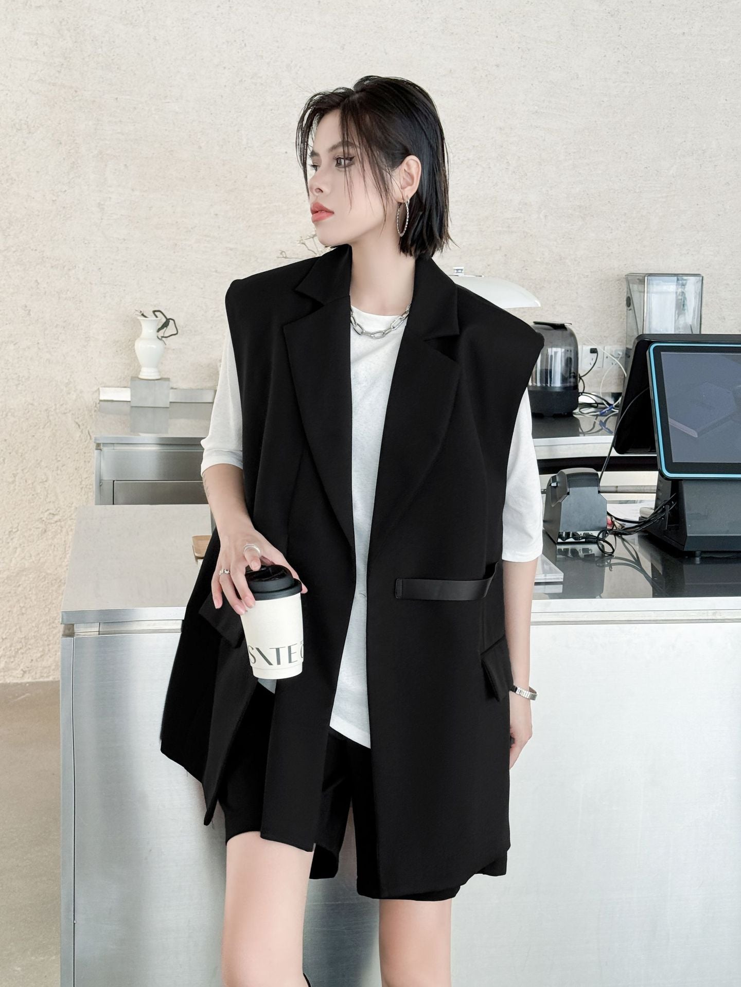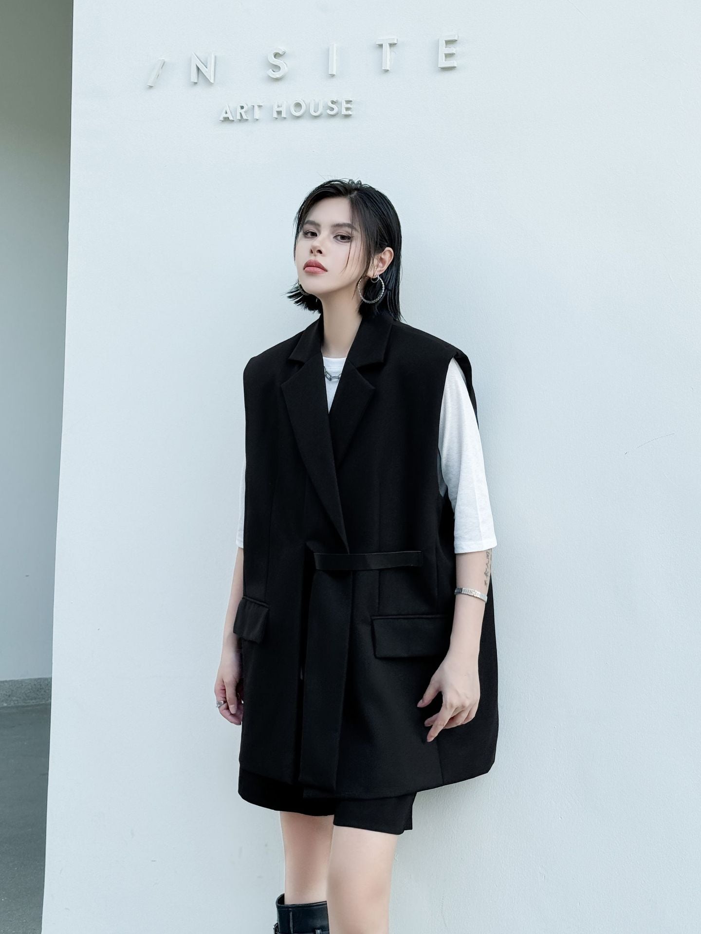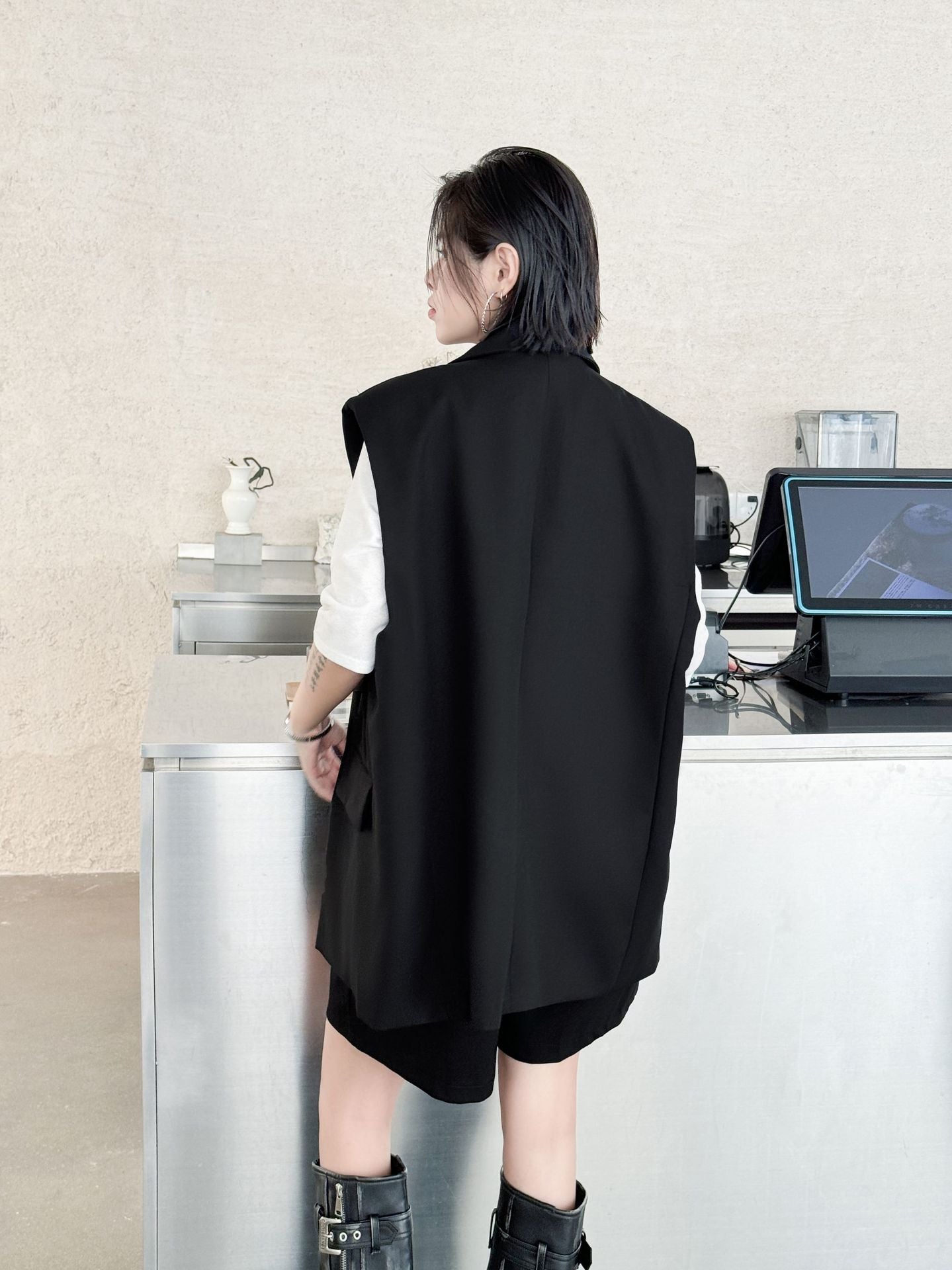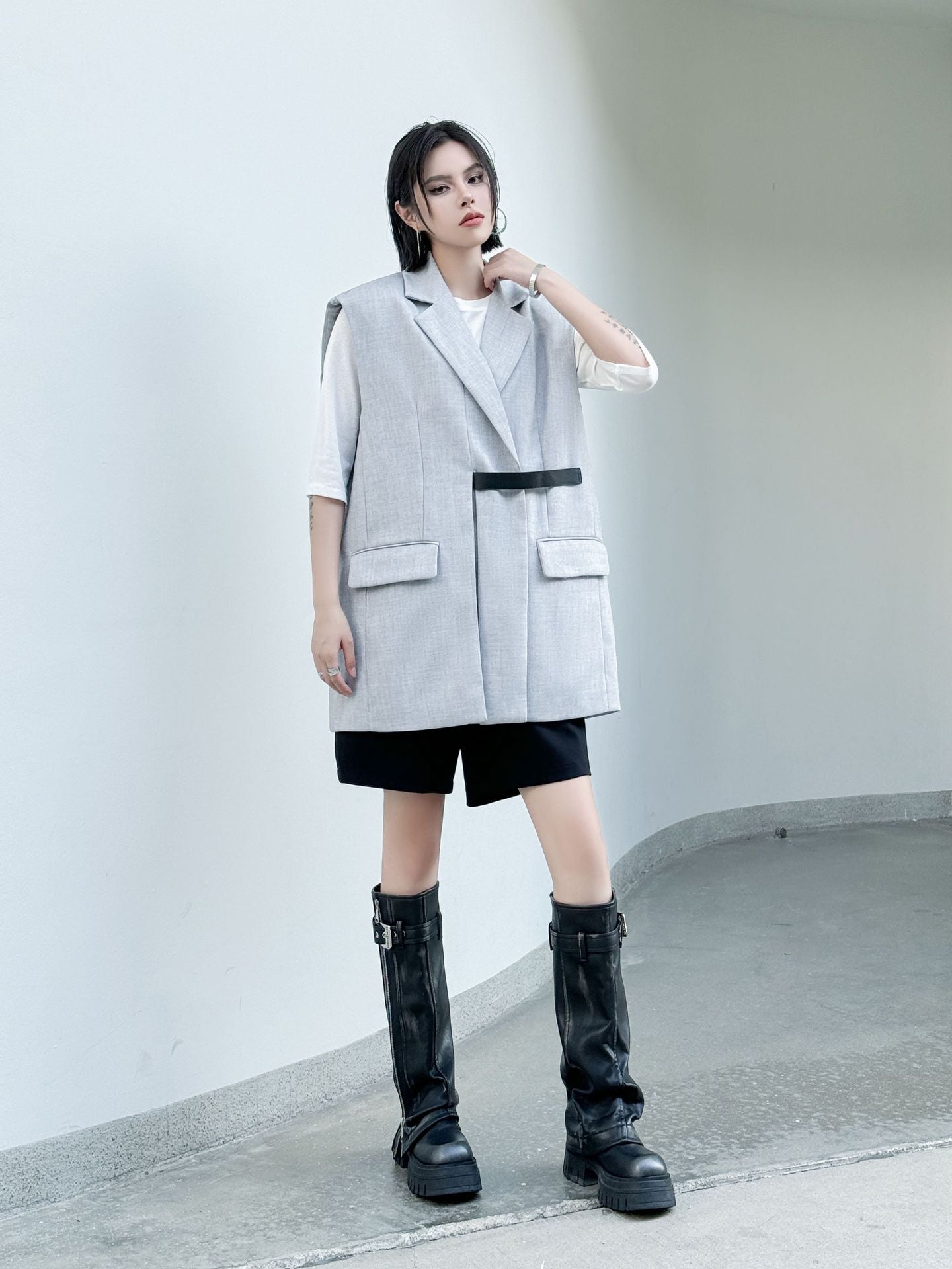 クラシカルなジャケットのムードを残しつつ、軽やかなノースリーブ仕立てで再構築したパッチワークベスト。