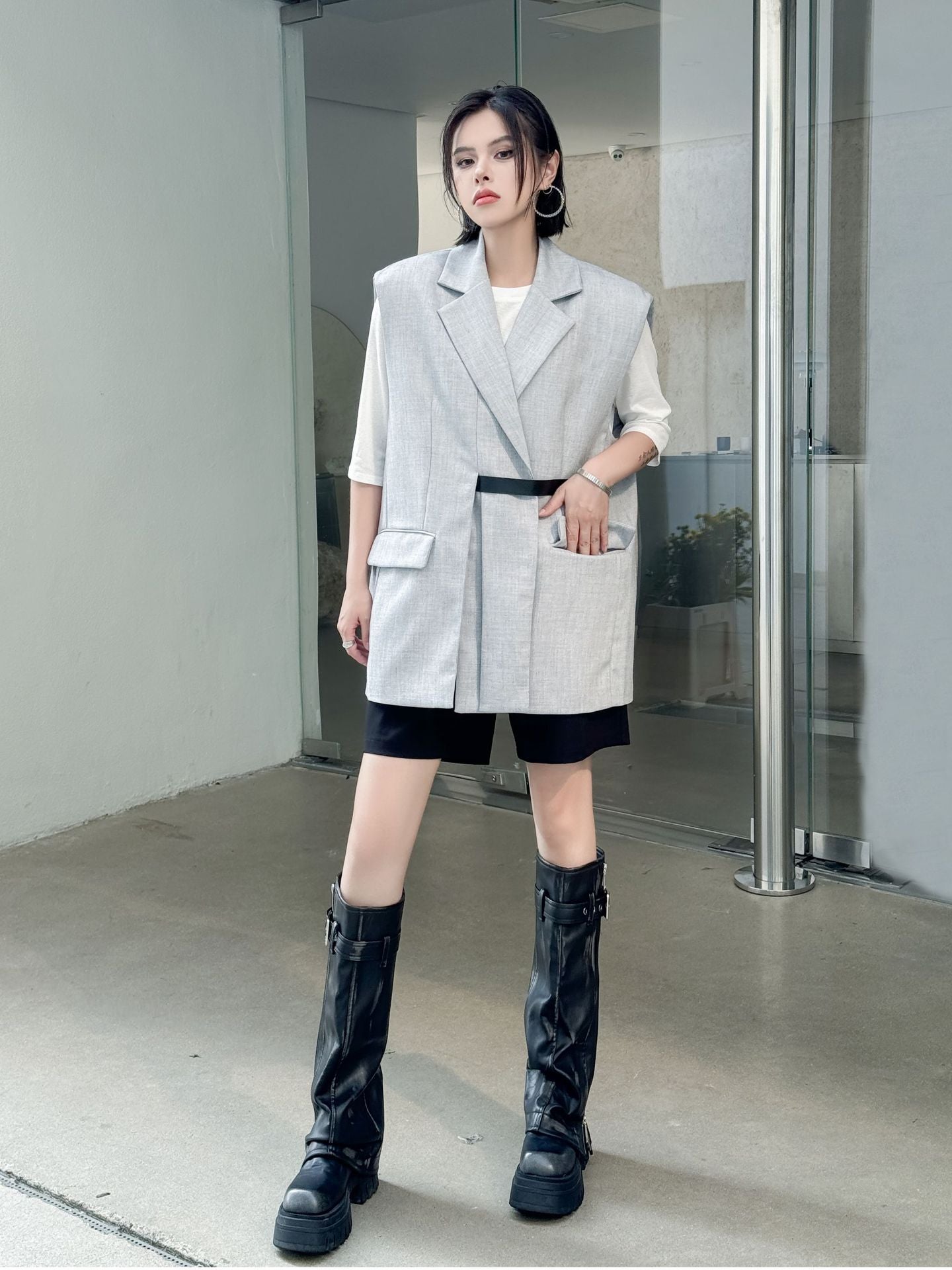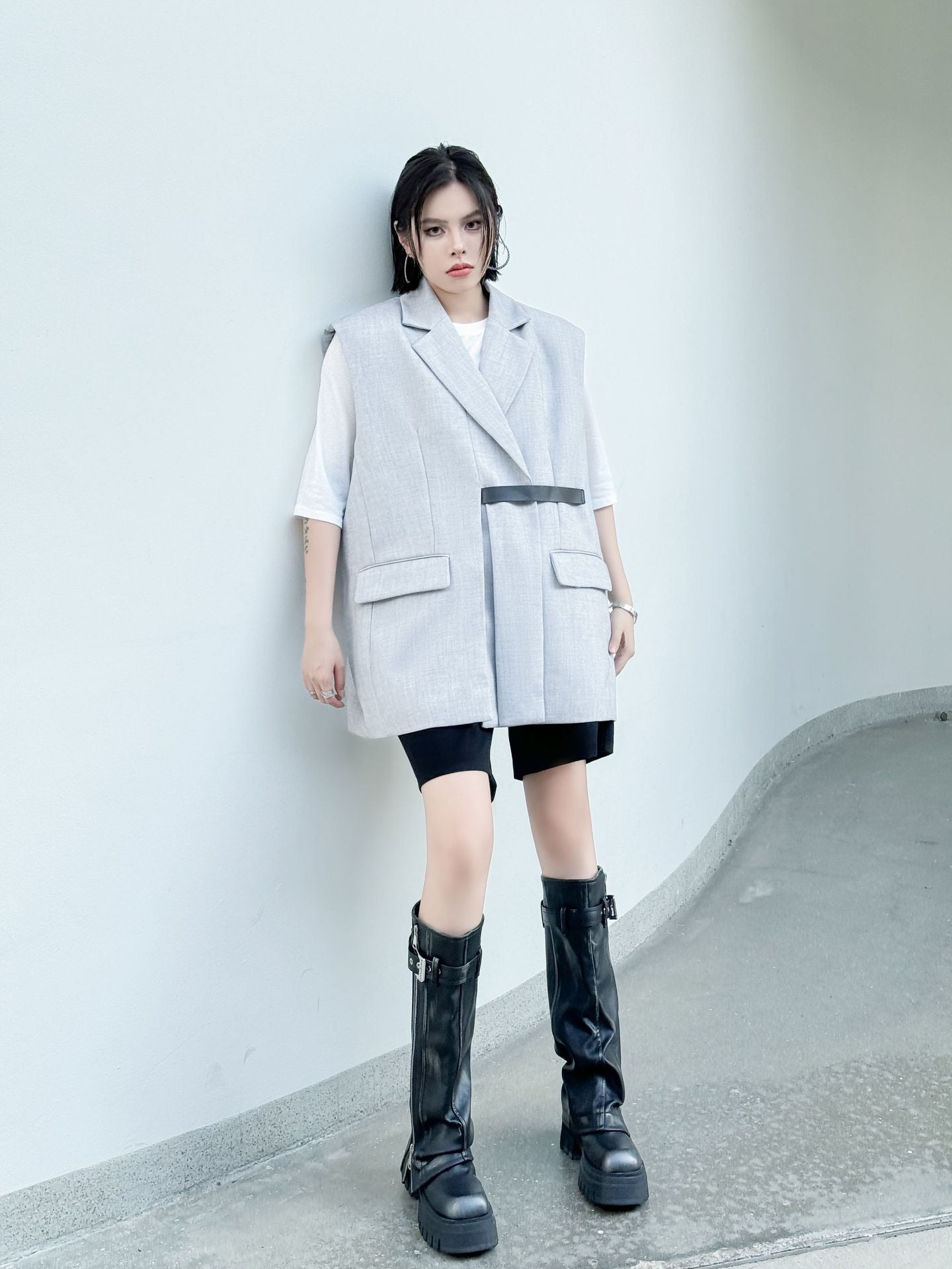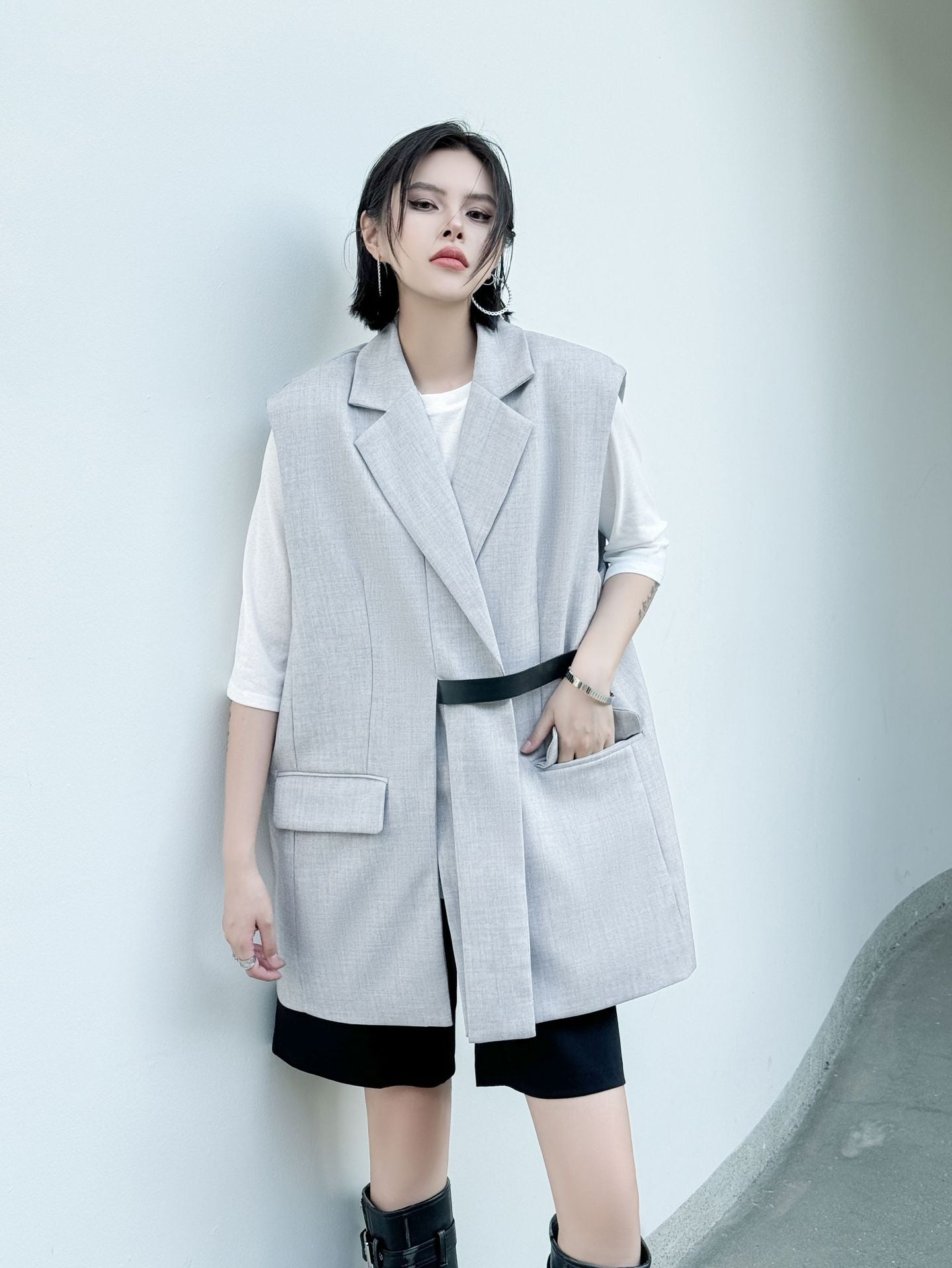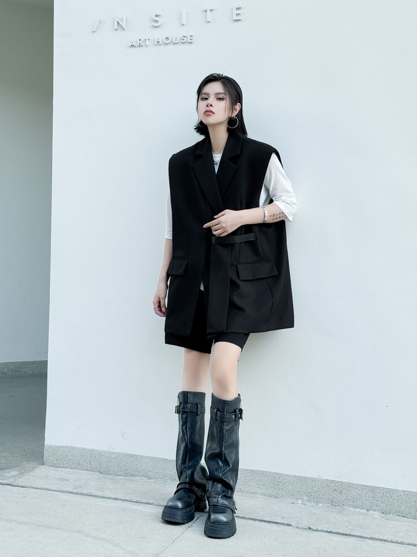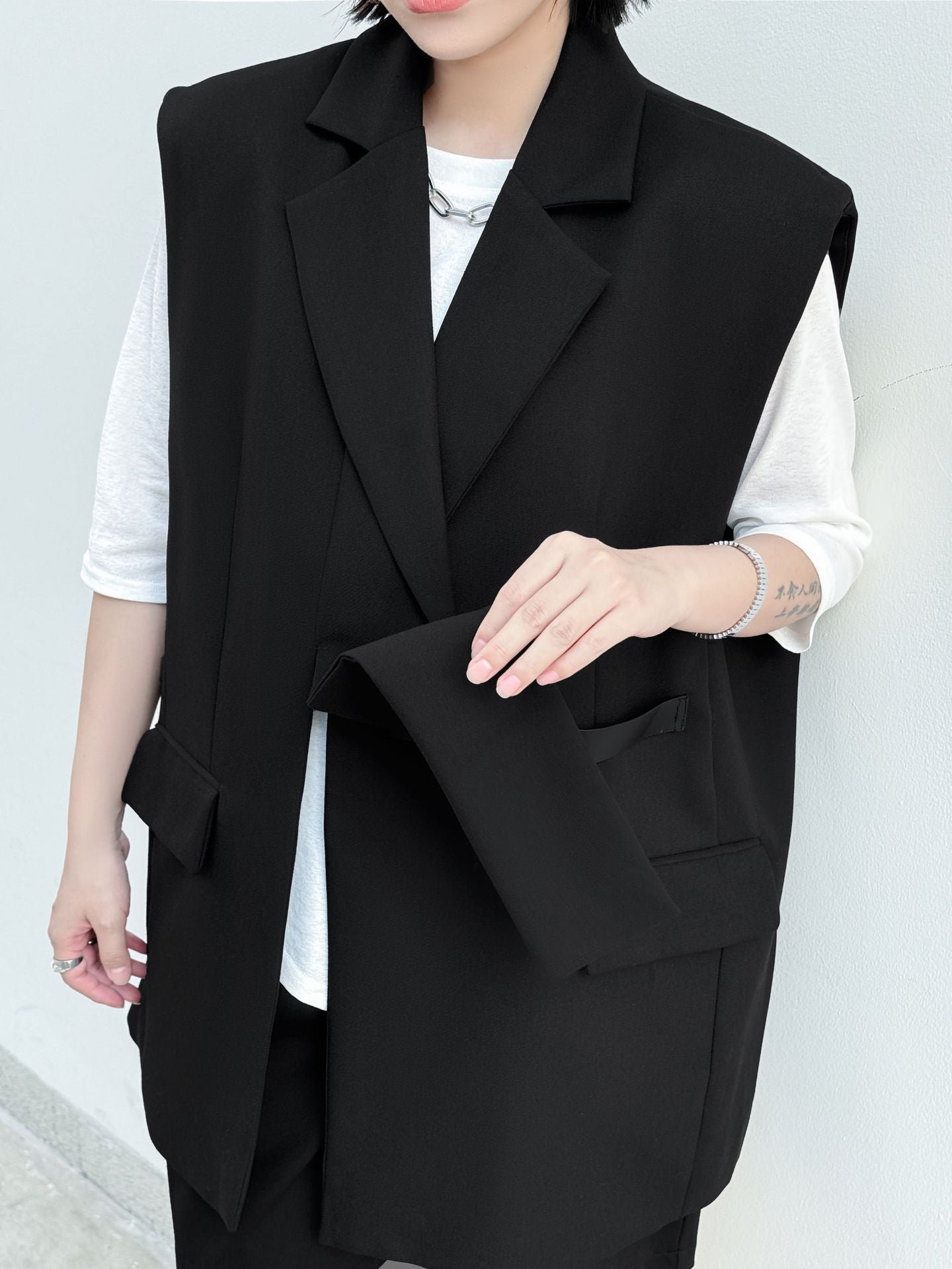 クラシカルなジャケットのムードを残しつつ、軽やかなノースリーブ仕立てで再構築したパッチワークベスト。