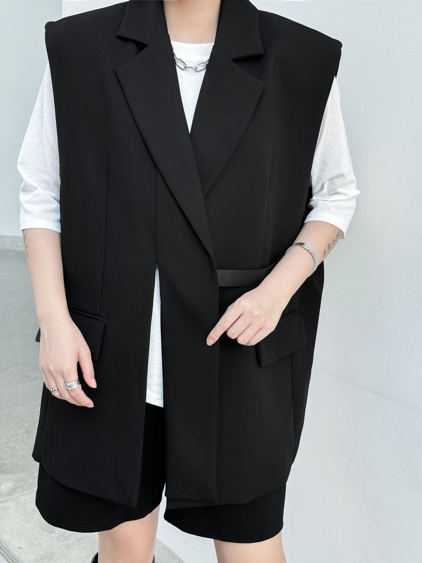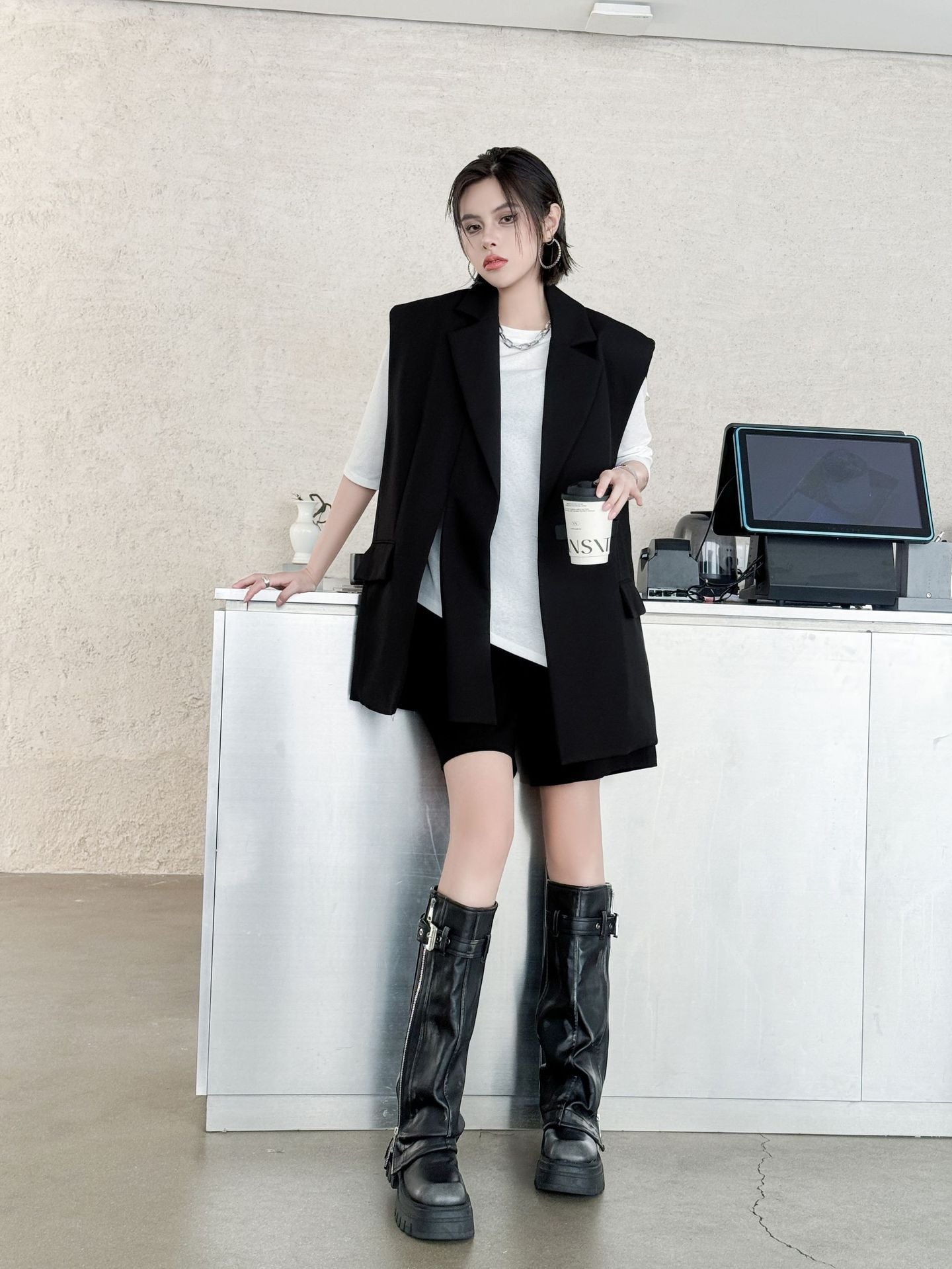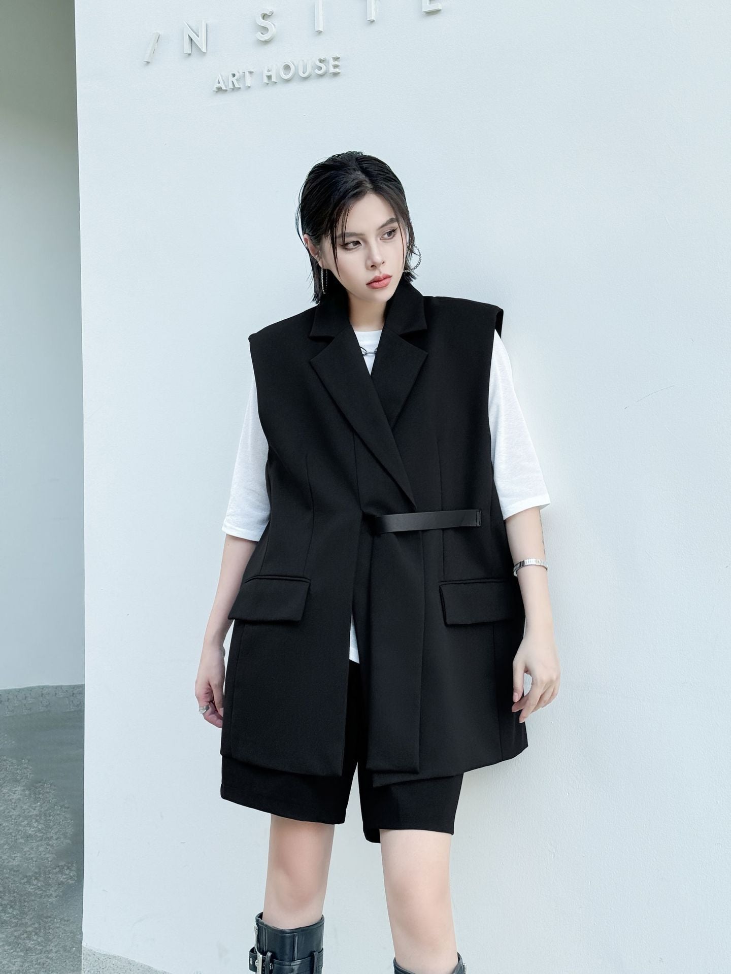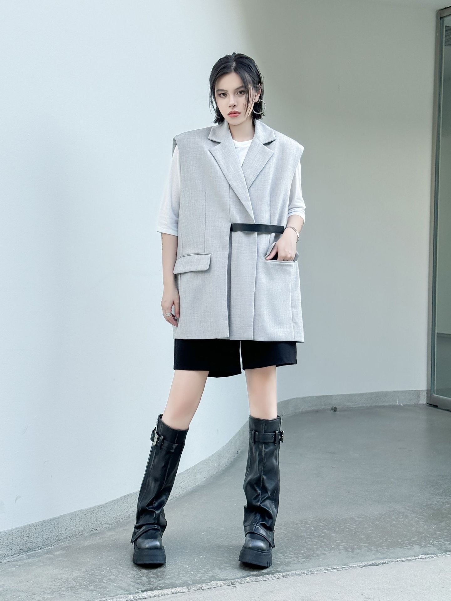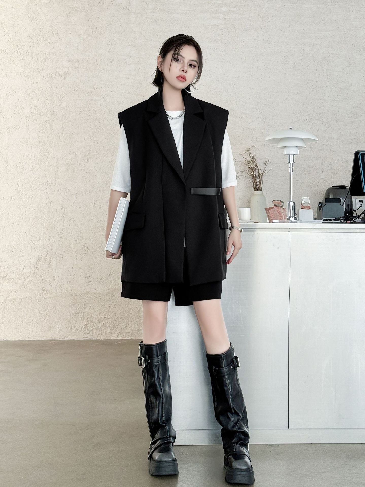 クラシカルなジャケットのムードを残しつつ、軽やかなノースリーブ仕立てで再構築したパッチワークベスト。