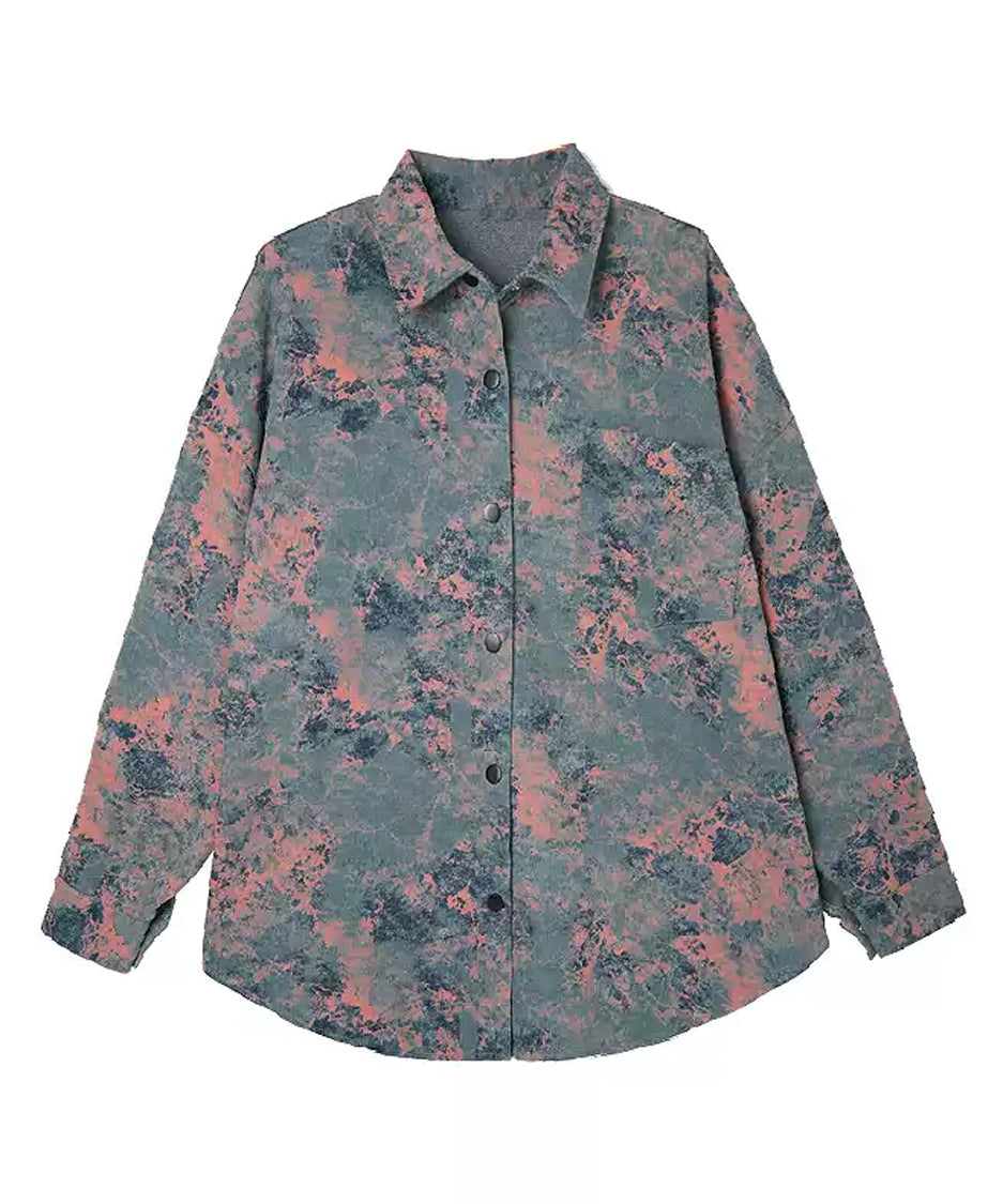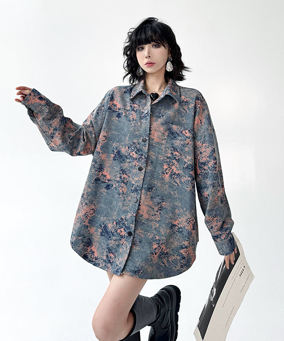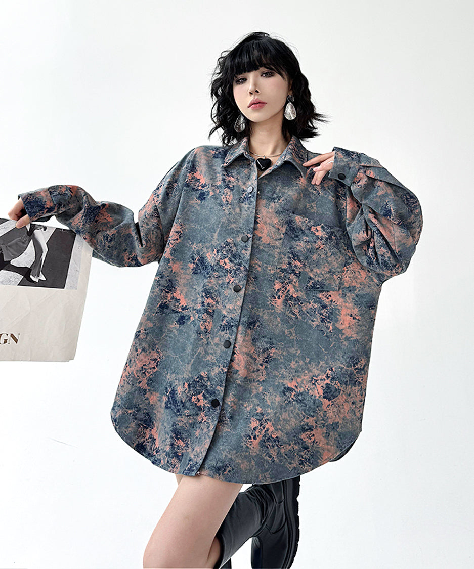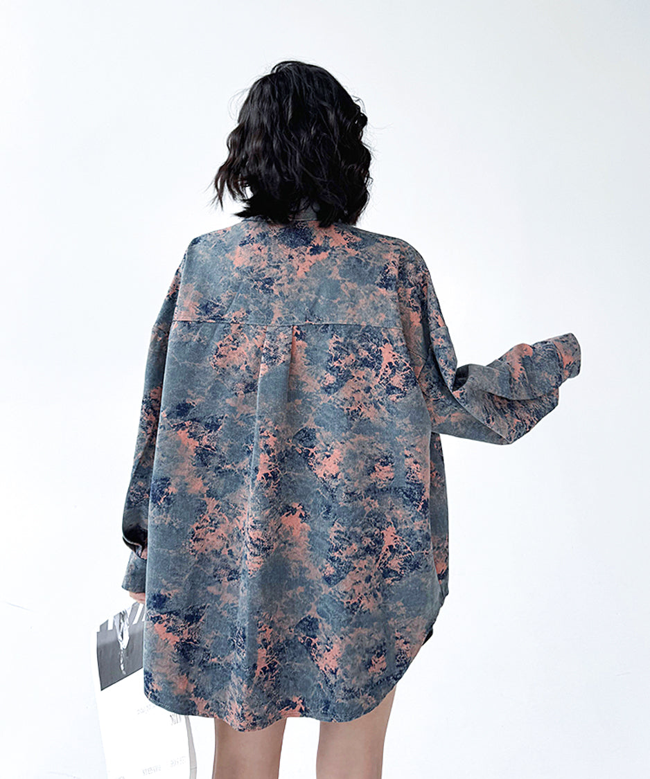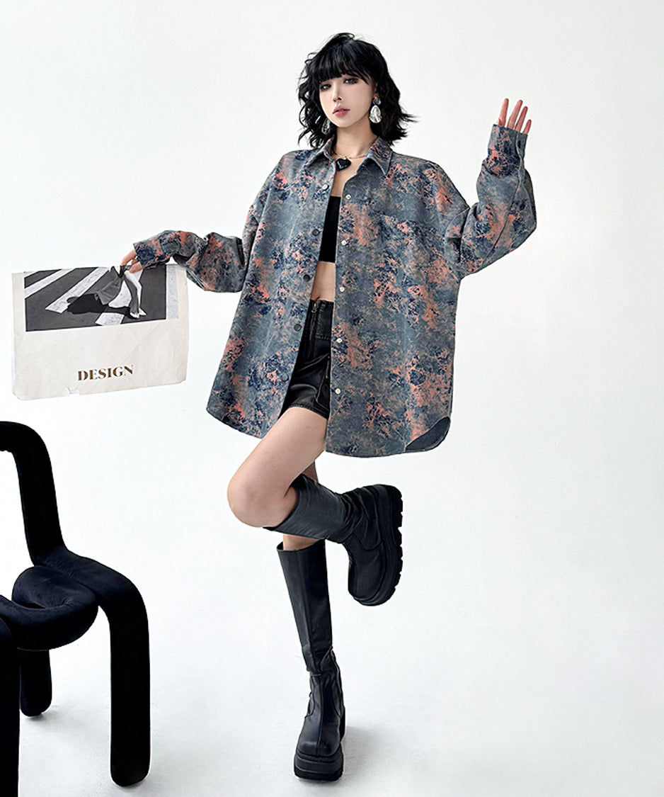 アーティスティックなムラ染め調のプリントと、構築的なオーバーサイズシルエットが印象的な一着。計算されたルーズ感が、抜け感と緊張感を同時に演出し、日常に溶け込みながらもスタイルに芯を与えます。