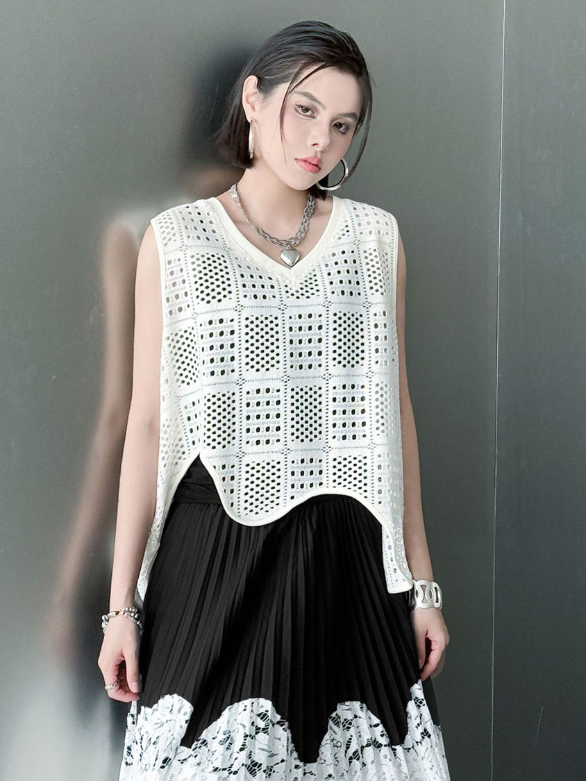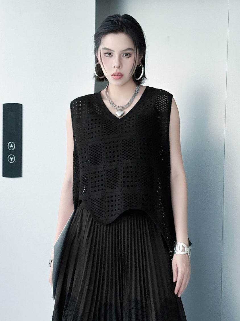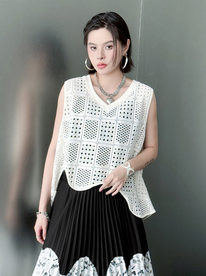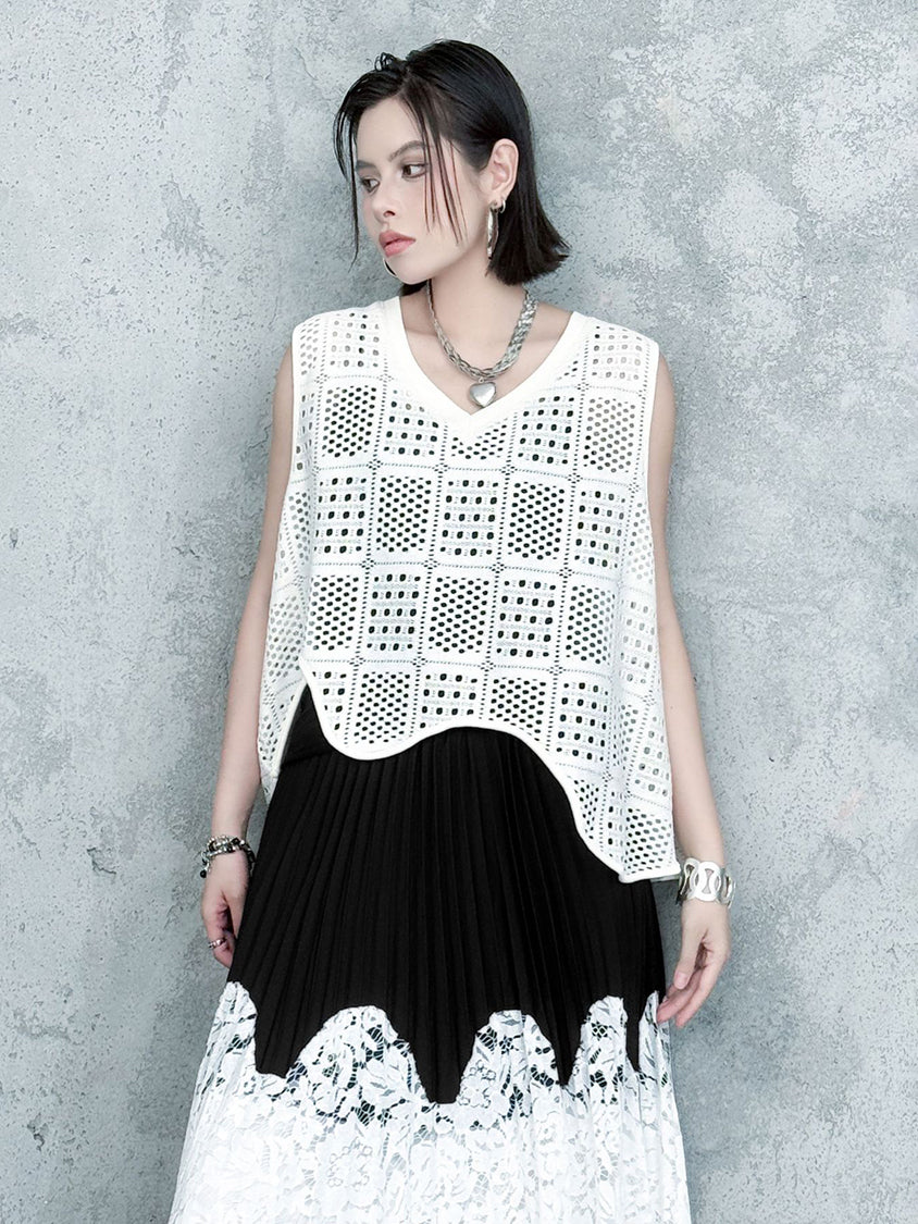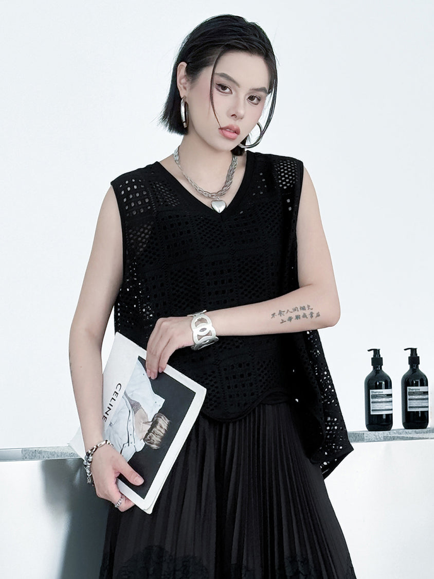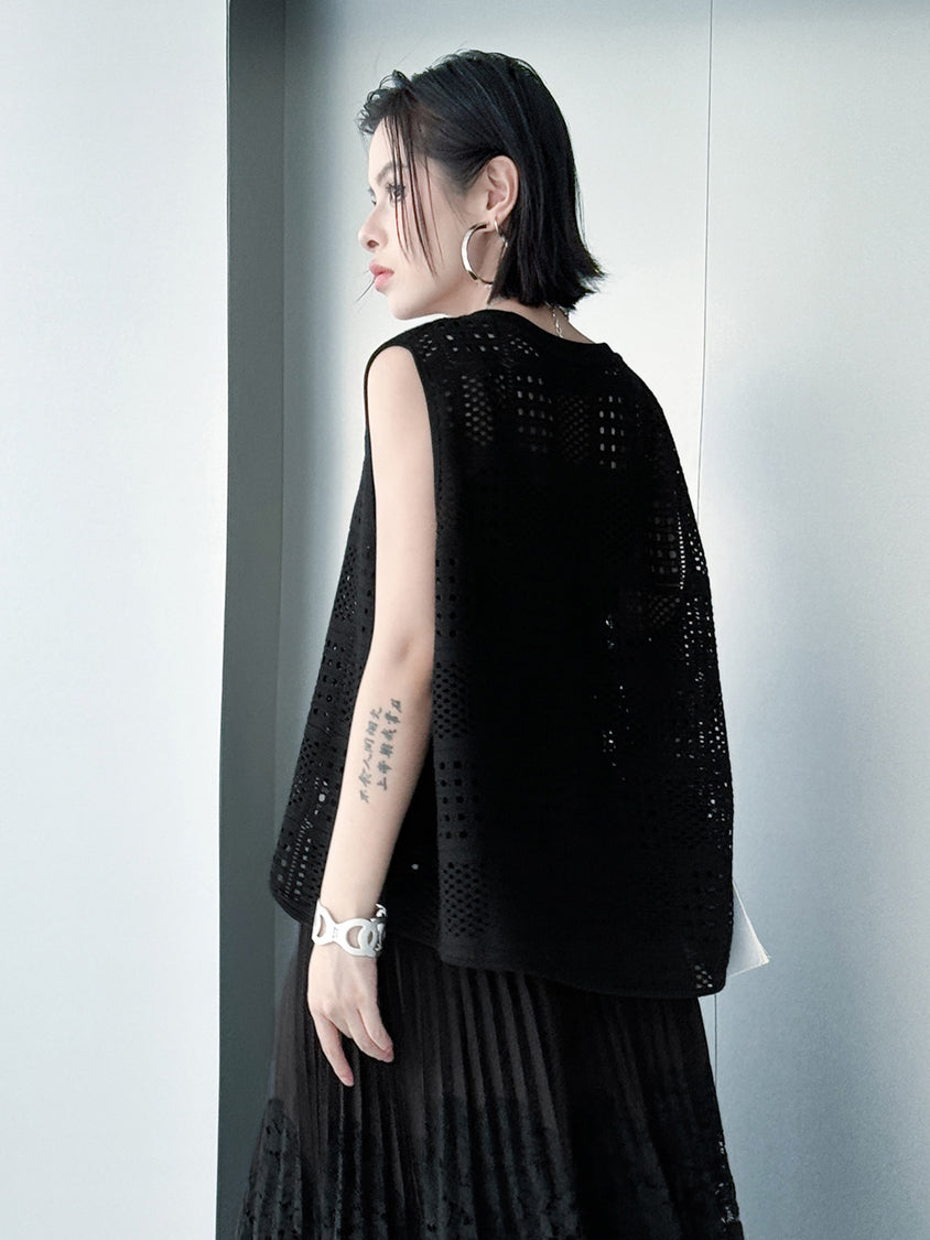 幾何学的なパンチングが映える、ミニマルモードなノースリーブトップス。