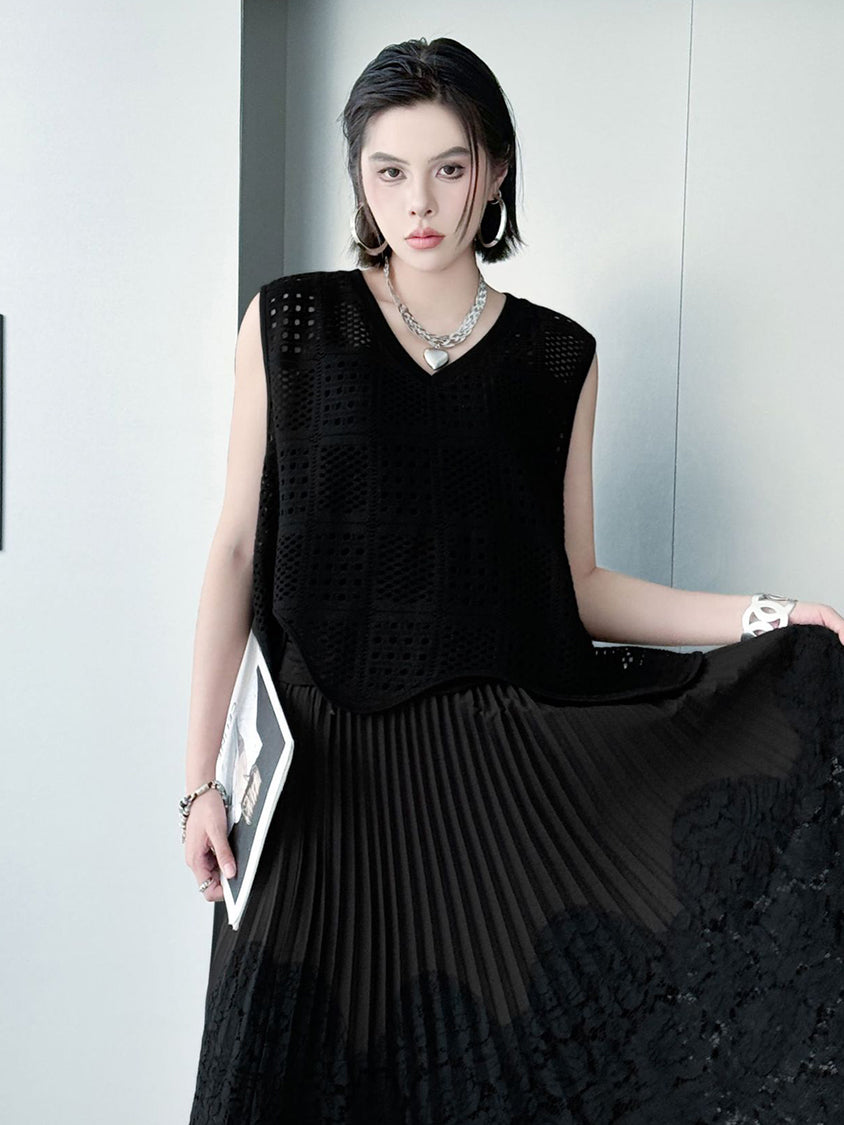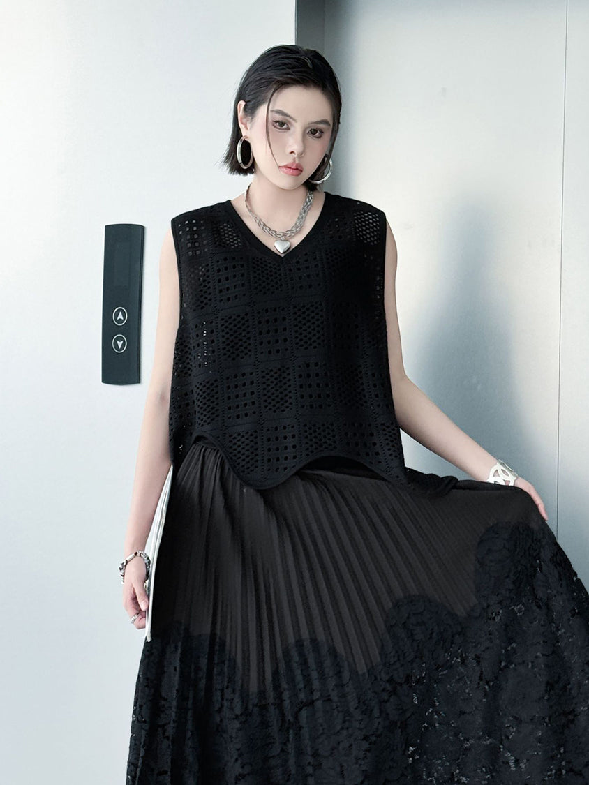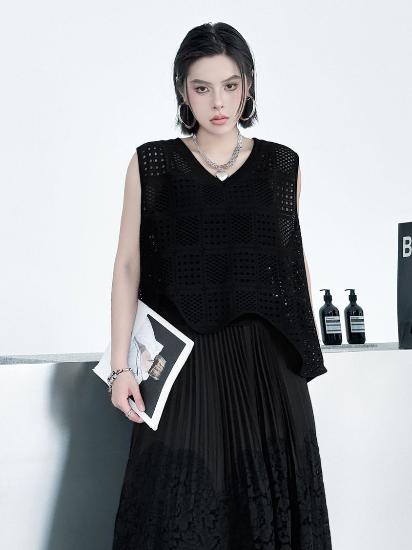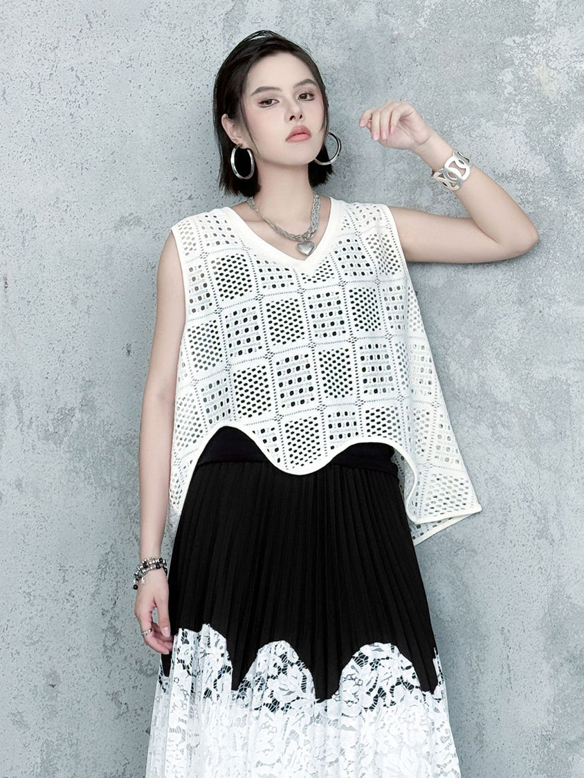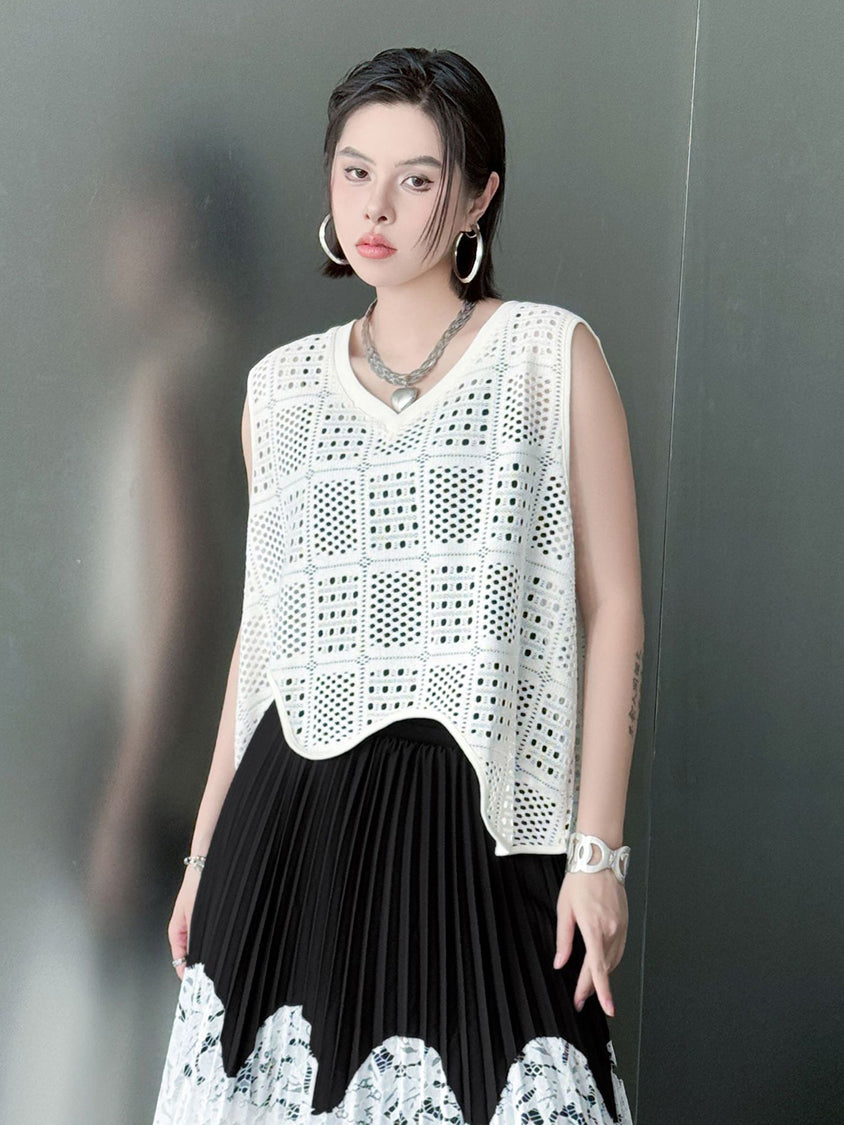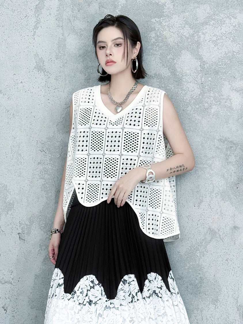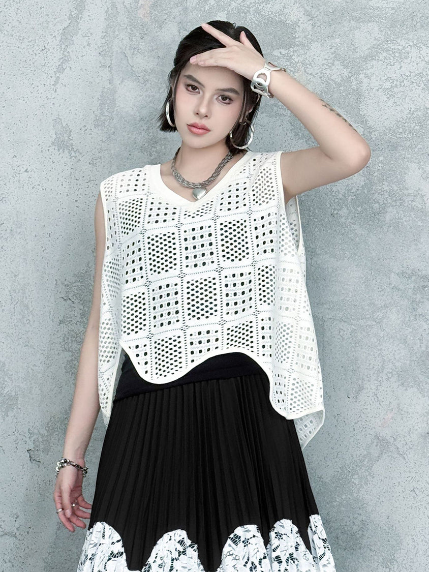 幾何学的なパンチングが映える、ミニマルモードなノースリーブトップス。