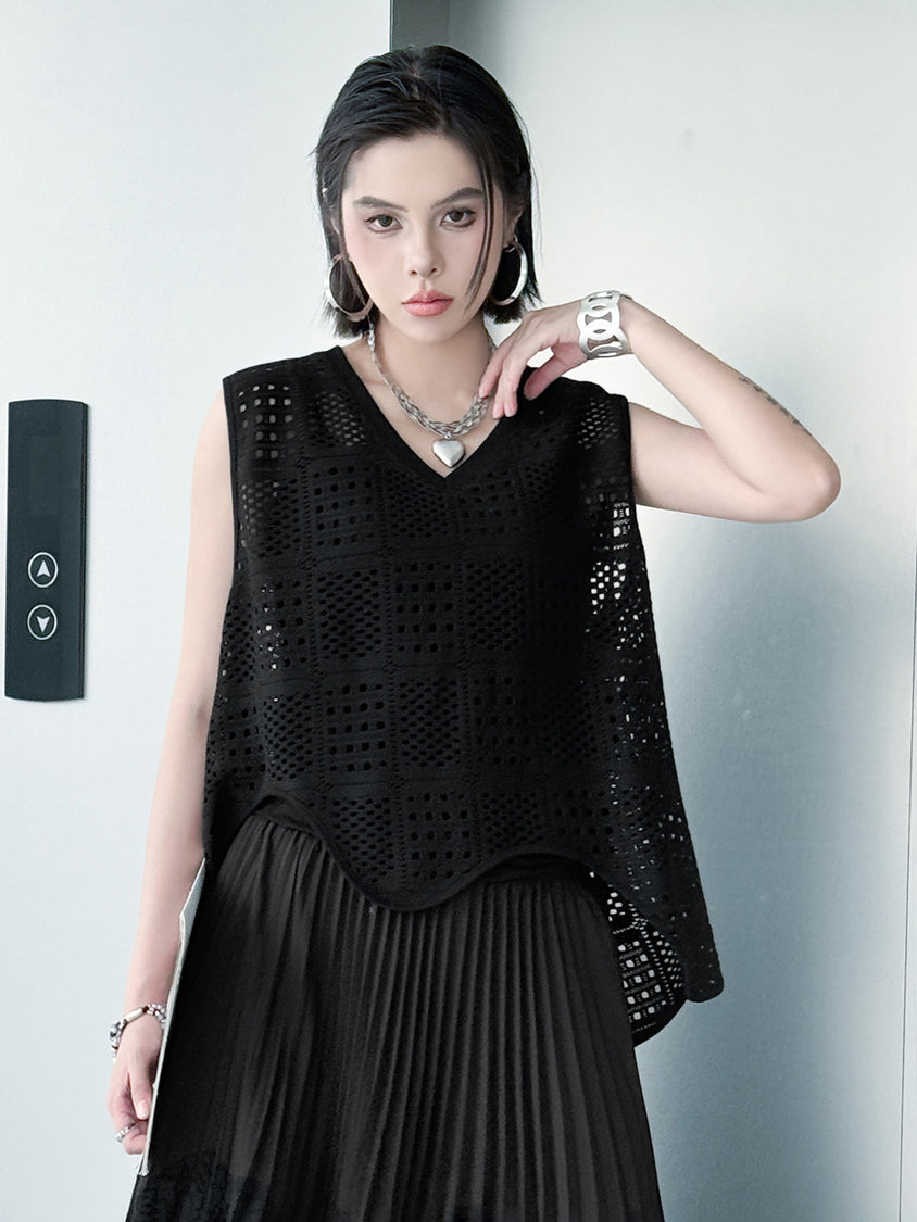 幾何学的なパンチングが映える、ミニマルモードなノースリーブトップス。