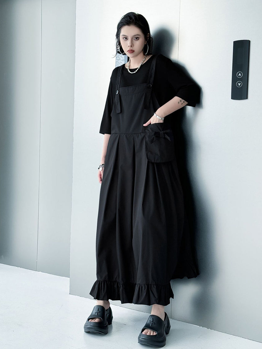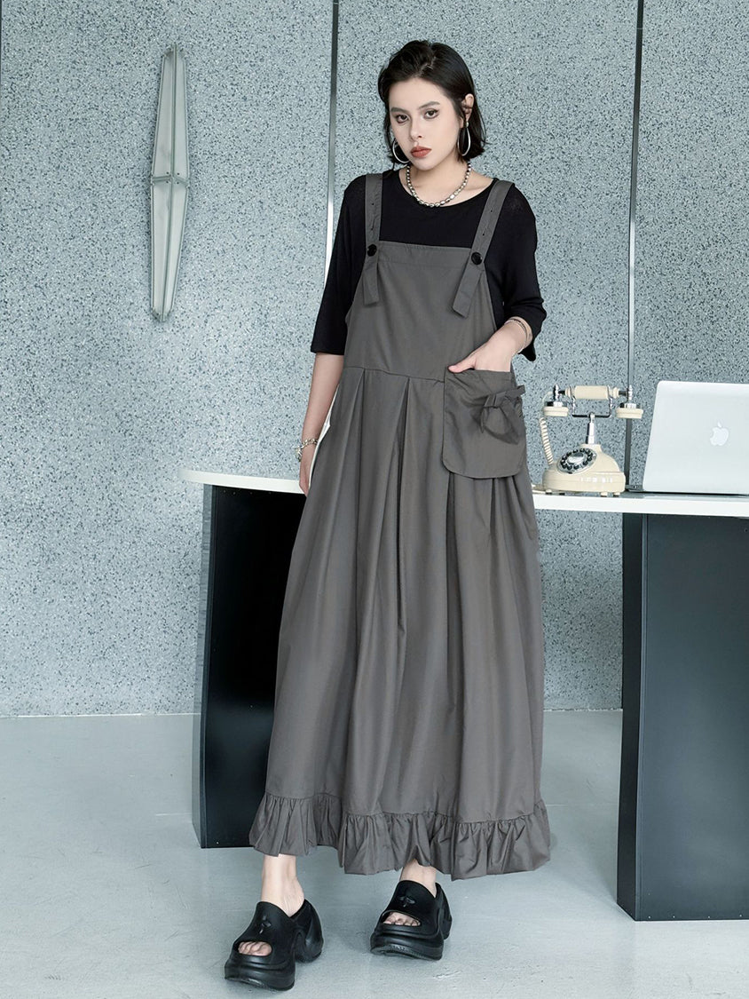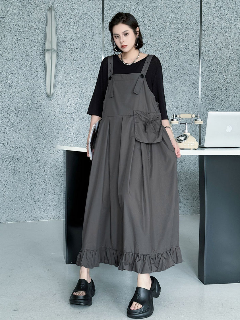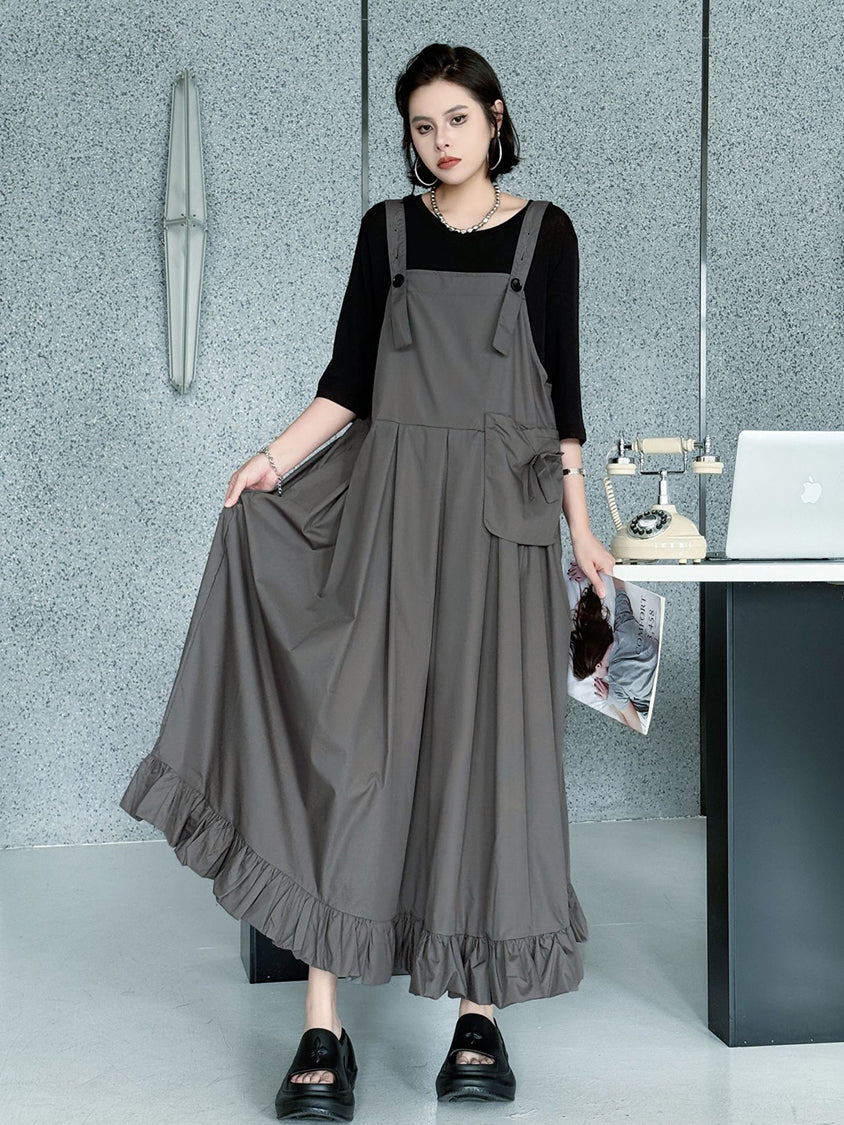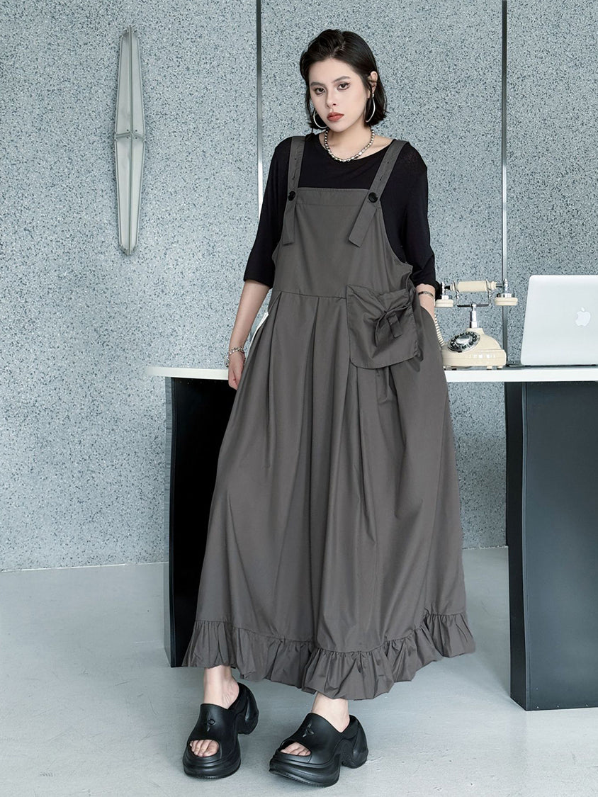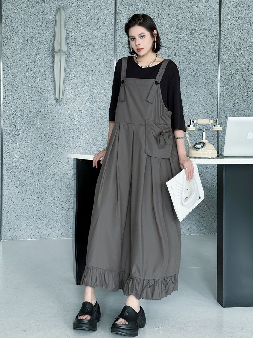 ストラップやボタン使いがワーク感を演出するジャンパードレス。