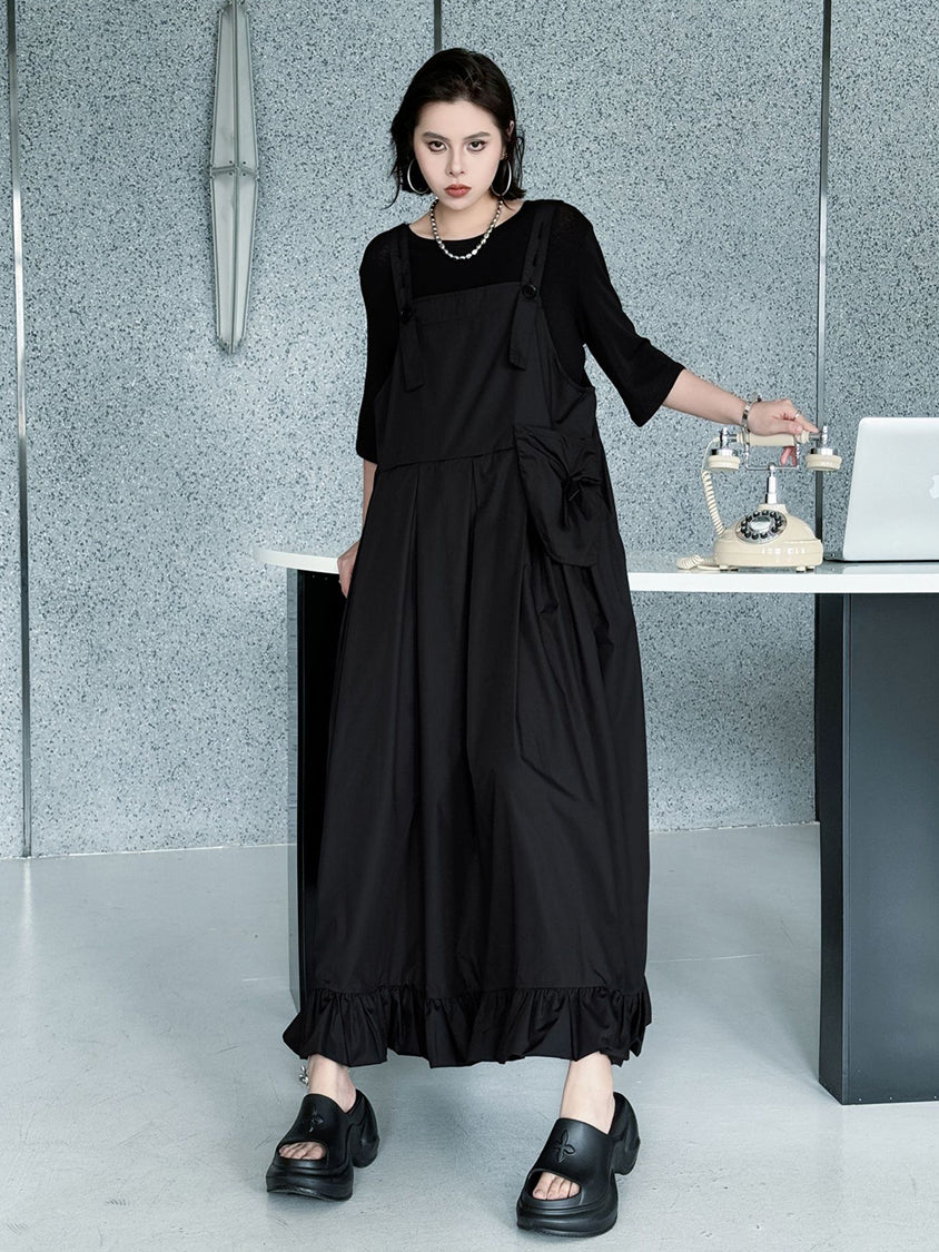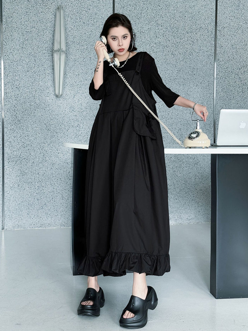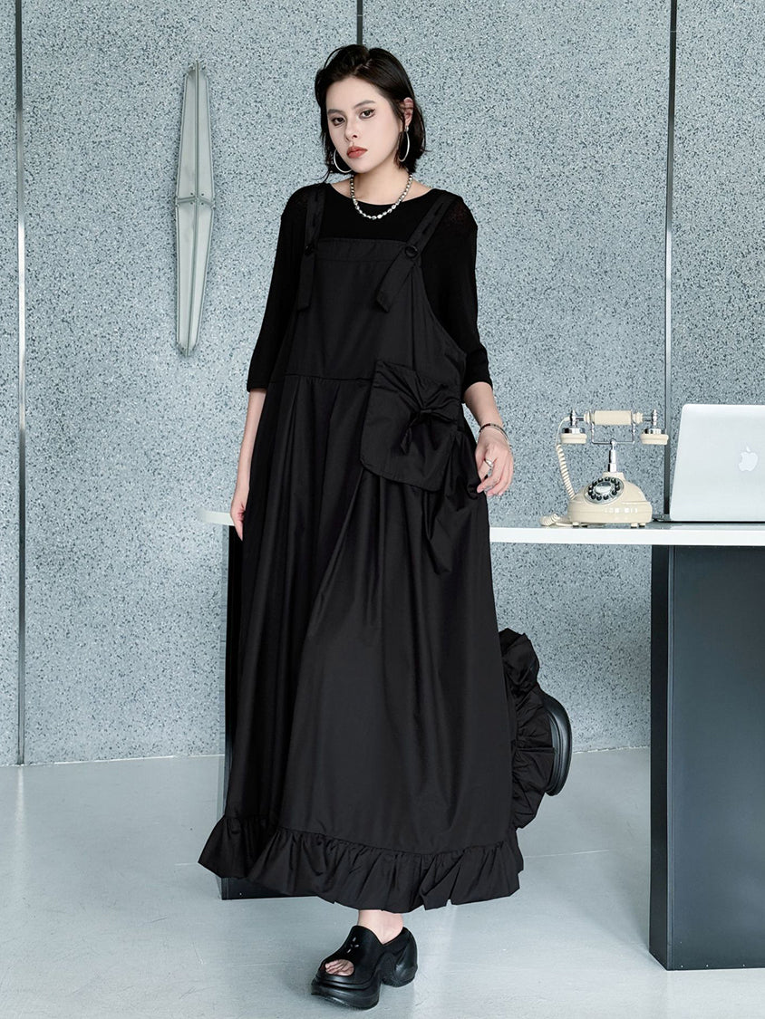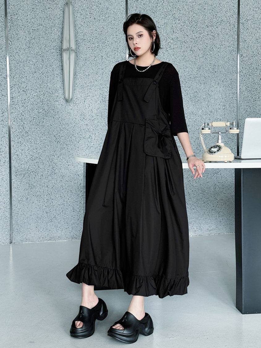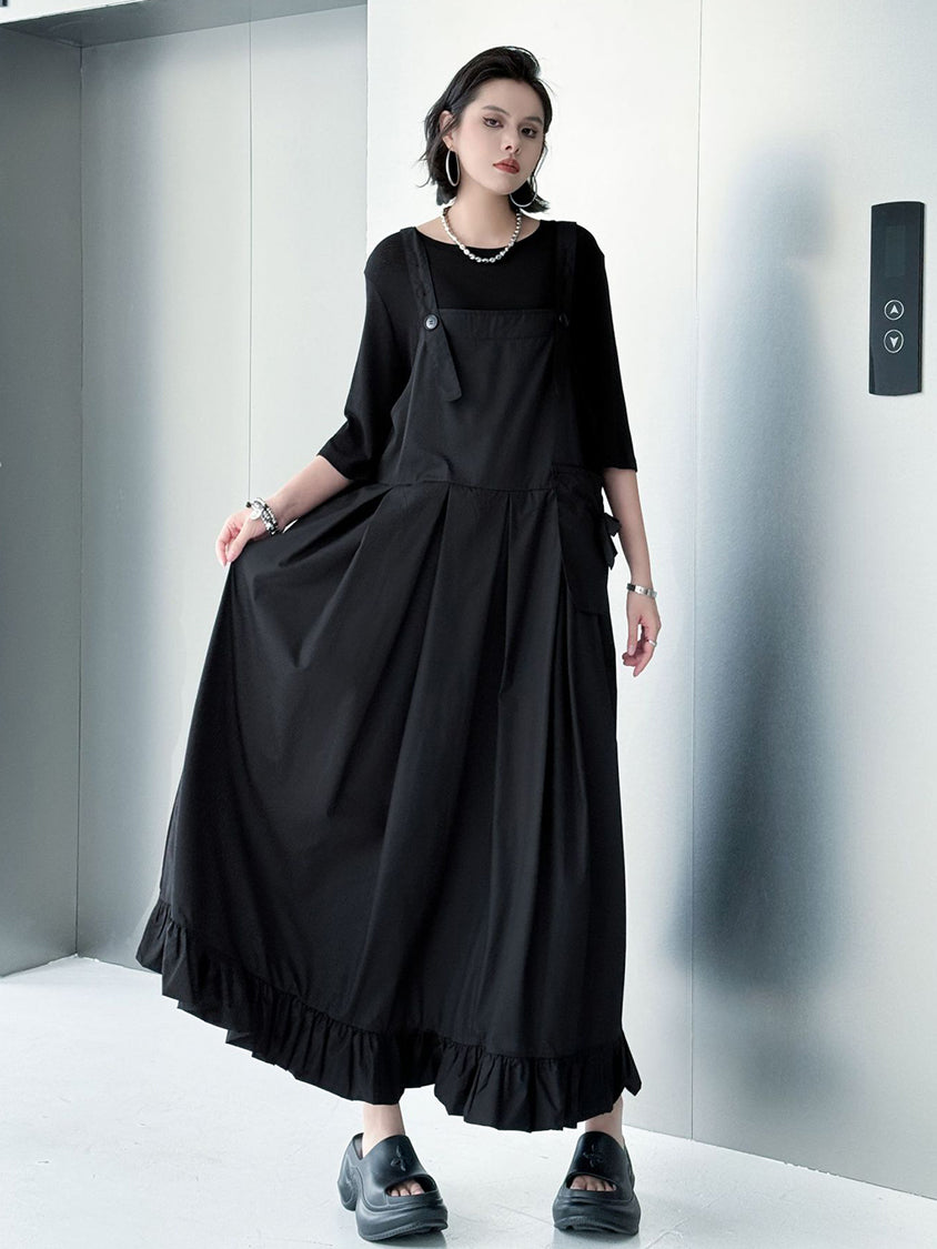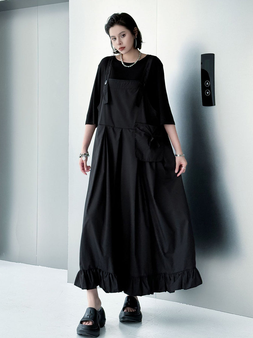 ストラップやボタン使いがワーク感を演出するジャンパードレス。
