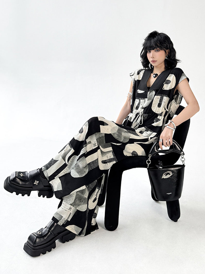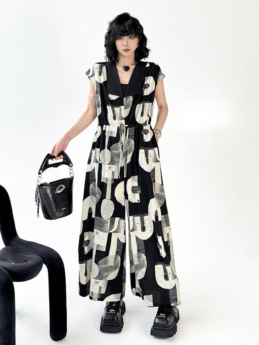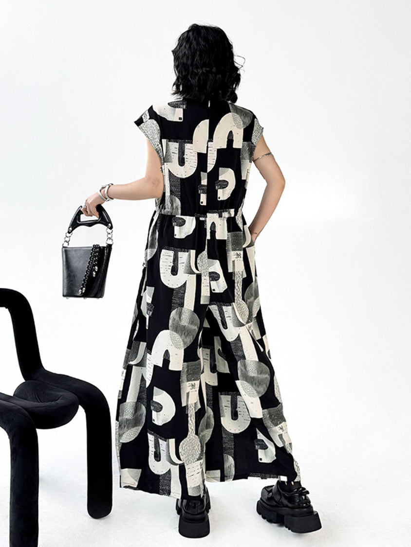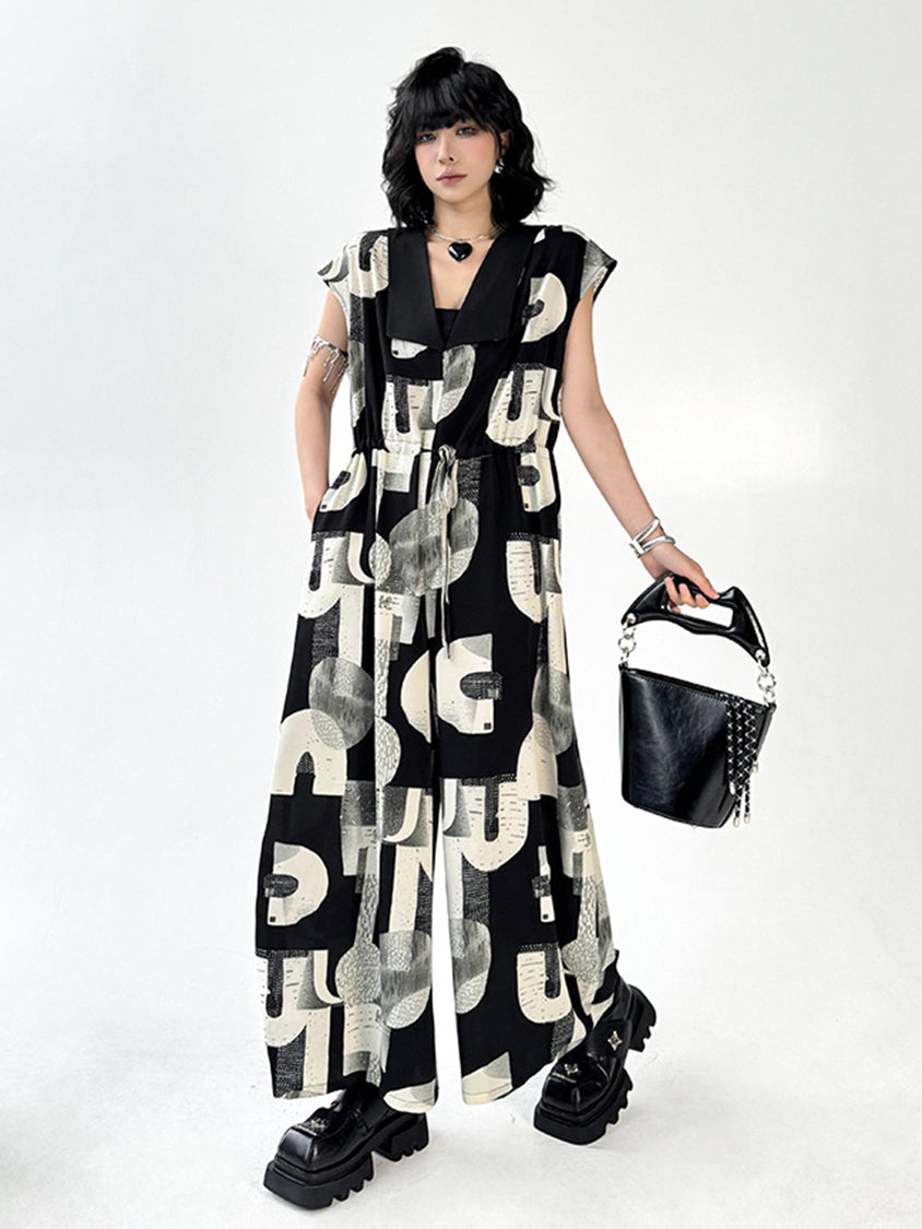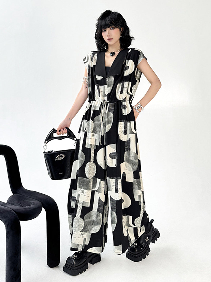 幾何学を思わせるモノトーンのグラフィックが、視線を惹きつけるジャンプスーツ。