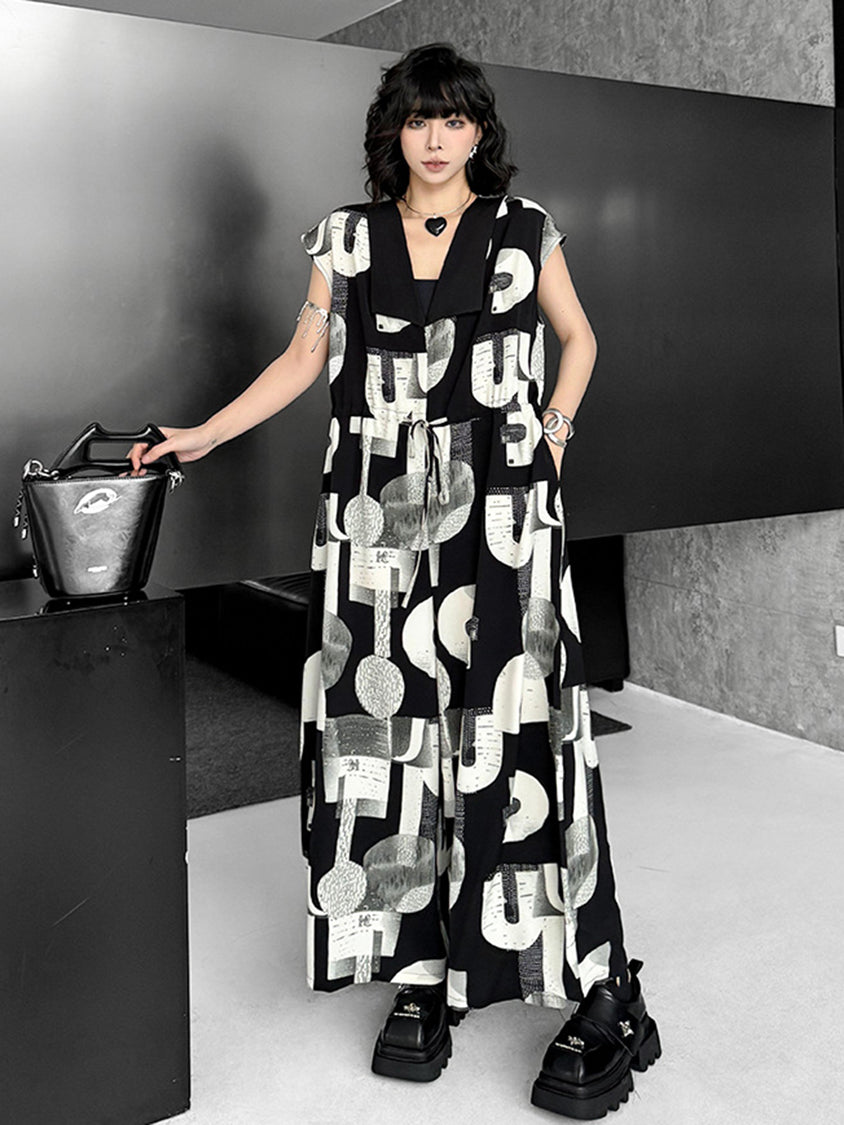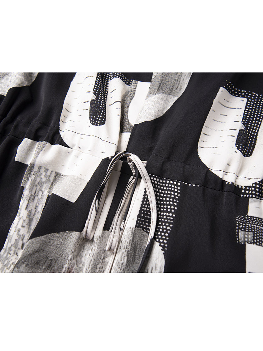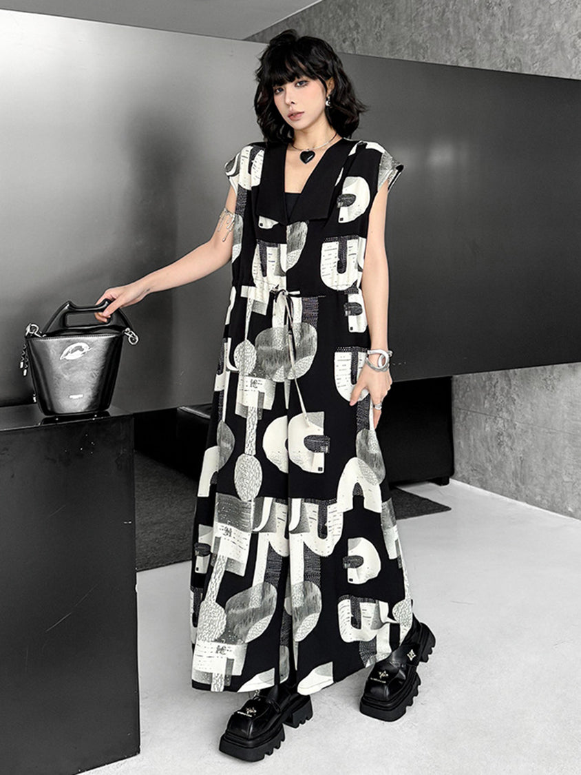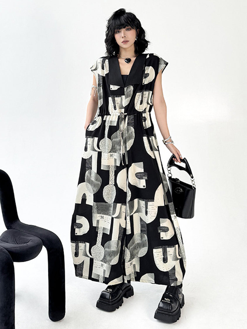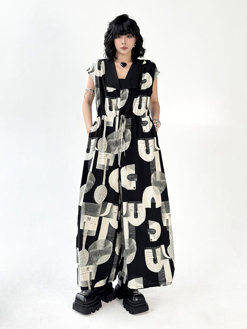 幾何学を思わせるモノトーンのグラフィックが、視線を惹きつけるジャンプスーツ。