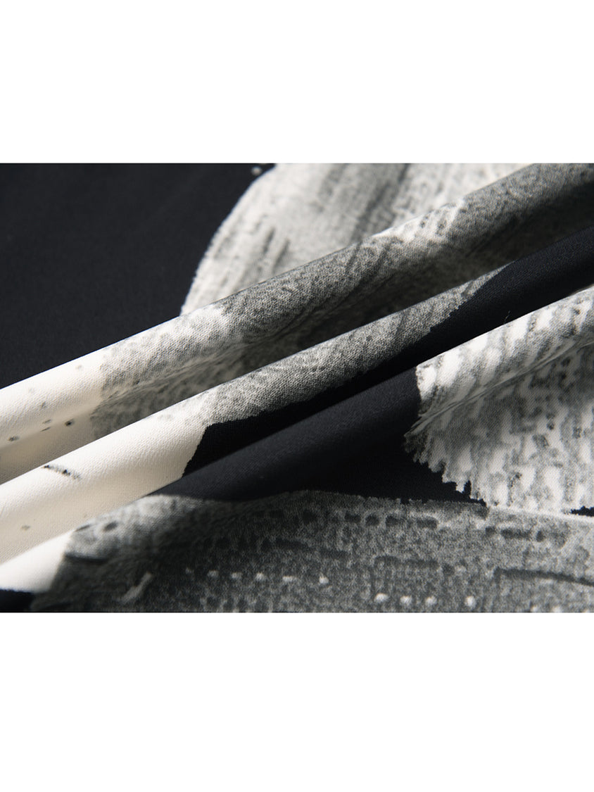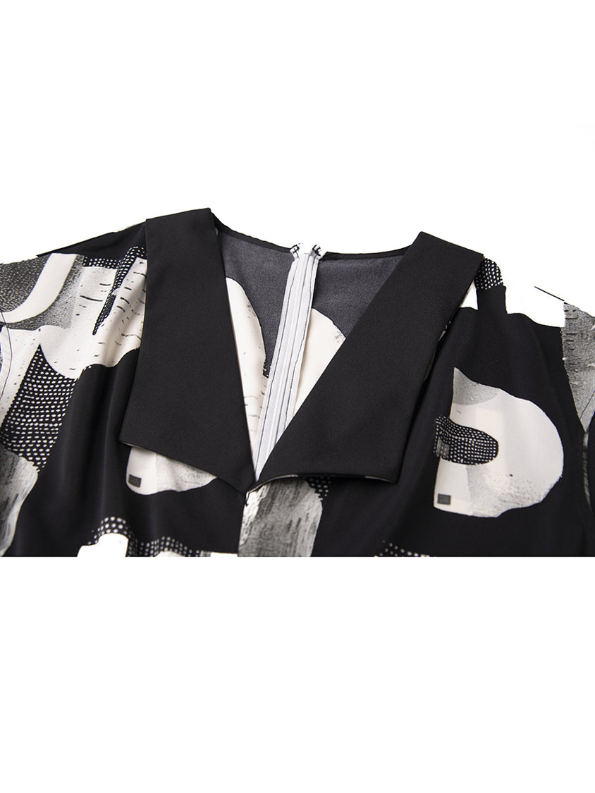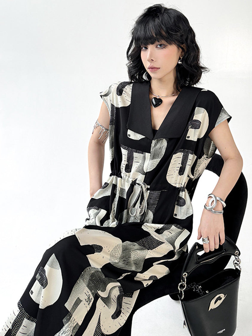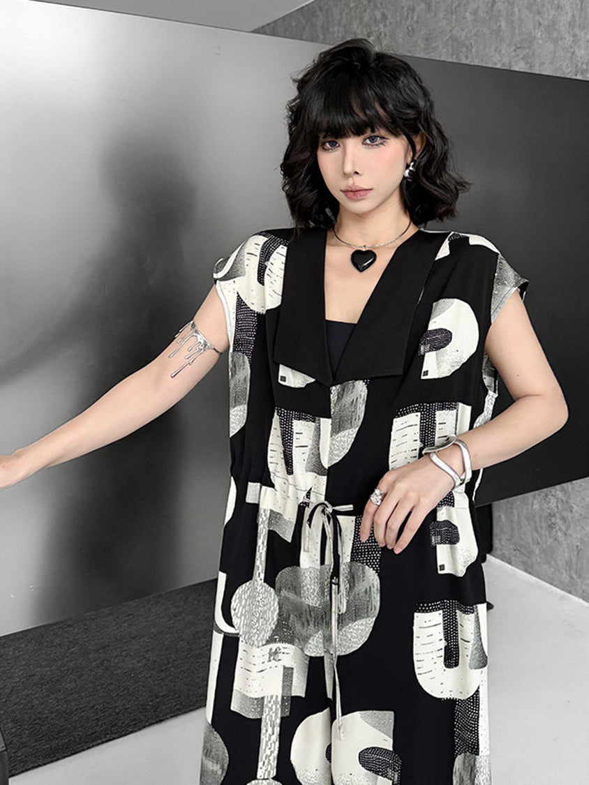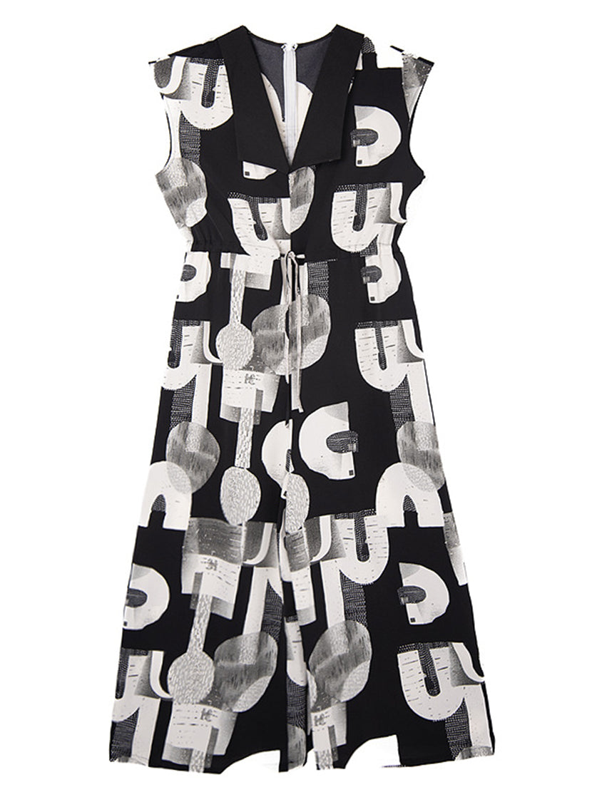 幾何学を思わせるモノトーンのグラフィックが、視線を惹きつけるジャンプスーツ。