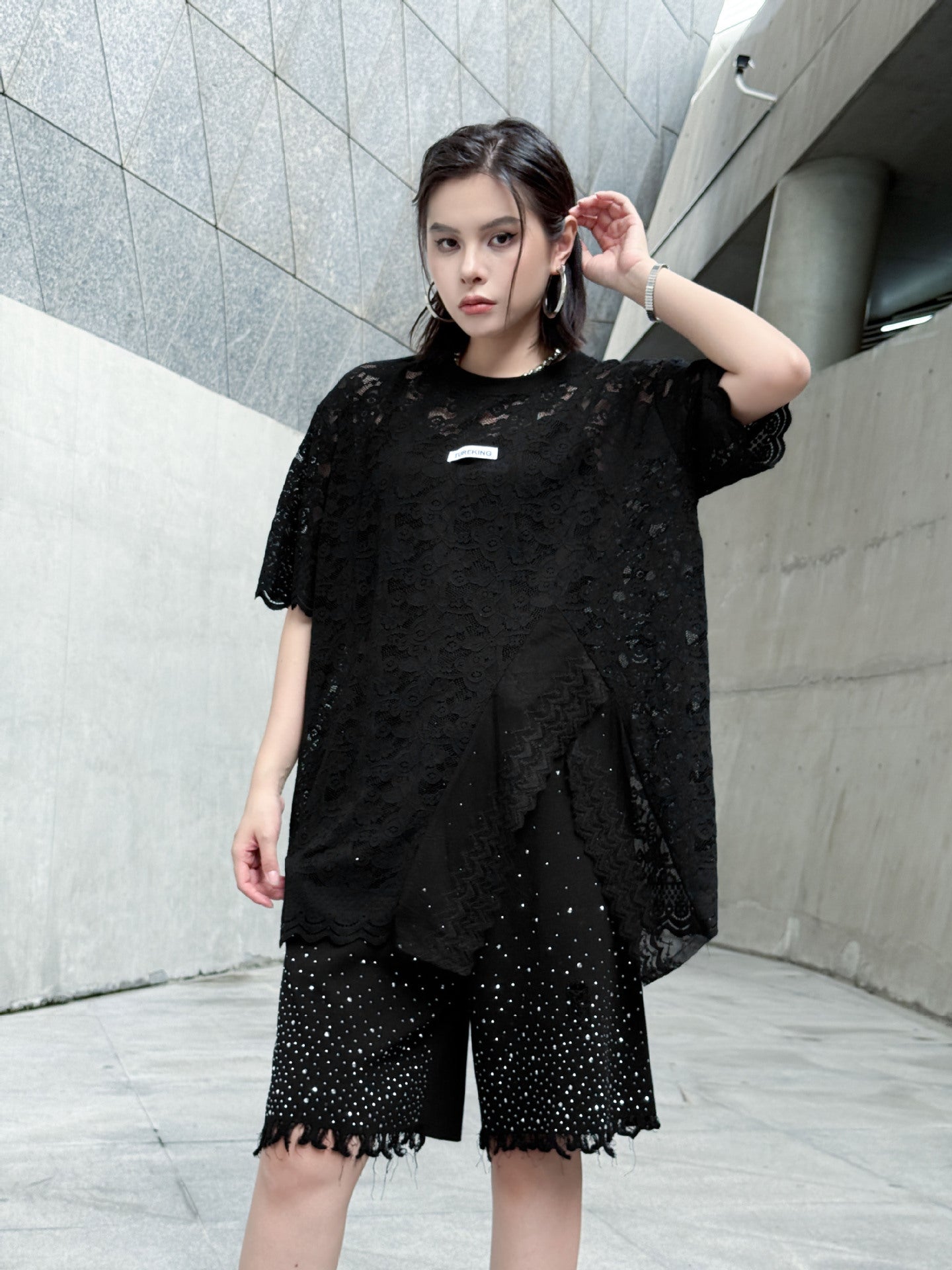 総レース仕様のショートスリーブトップ。透け感のある花柄レースを全面にあしらい、裾に向かって広がるゆるやかなフレアラインが特徴。前裾にはスリット入りのアレンジが施され、インナーやボトムスとのレイヤードで表情が変わる設計。ネックと袖口、裾にはスカラップカットがあしらわれており、ディテールにもこだわりが感じられる。背中側にもレースの美しさが際立つデザインで、軽やかで抜け感のあるスタイルに仕上がっている。