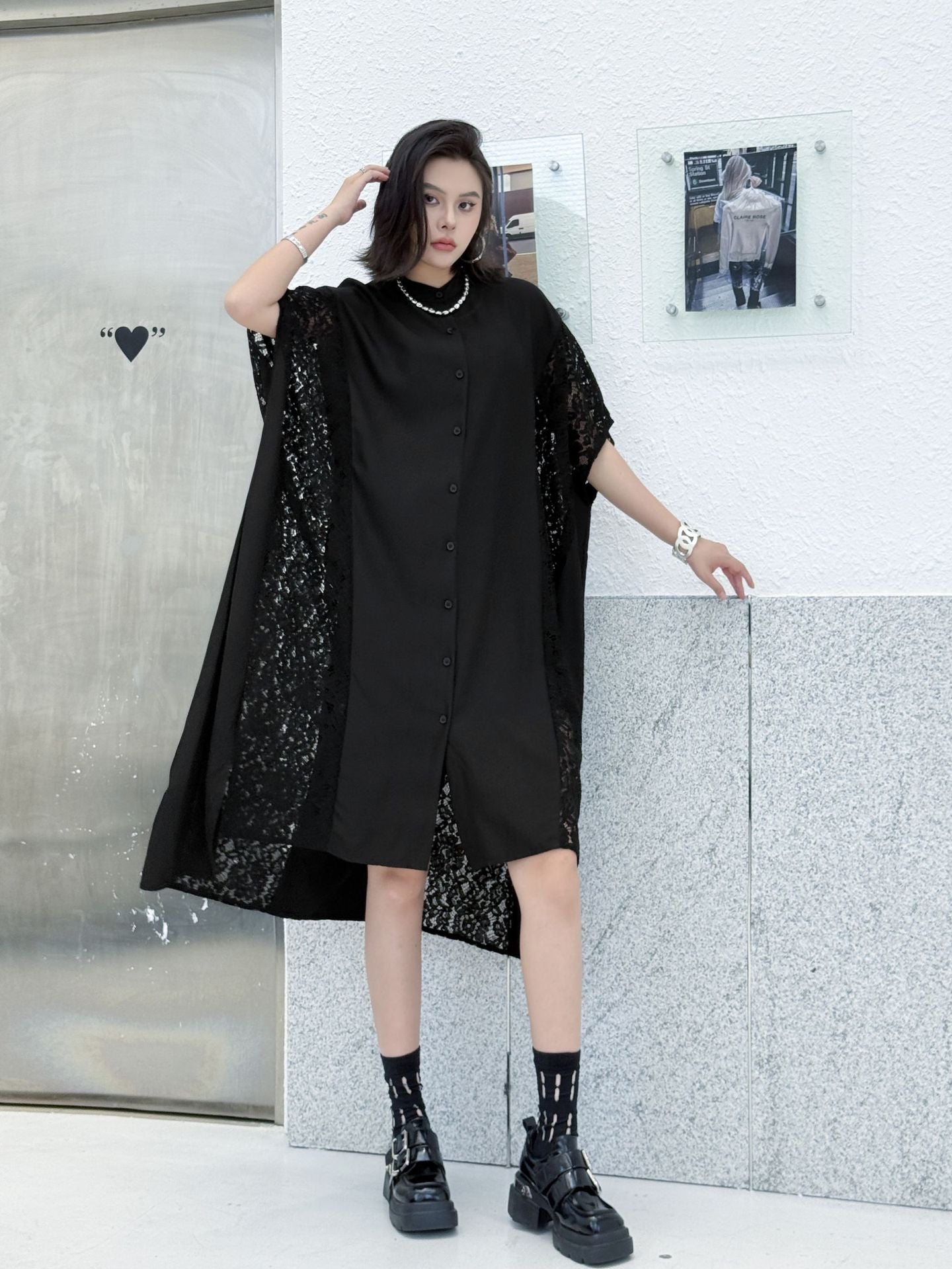 ストンと落ちるストレートシルエットのシャツドレスに、両サイドへ贅沢にあしらわれた繊細なレースが映えるデザイン。前立てはすっきりとした比翼仕立てで、クラシックな印象を保ちながらも、サイドから覗く肌感と透け感が抜け感をプラス。裾にかけて広がるゆるやかなAライン構成で、フロントとバックにかけて裾丈の差をつけたスリットカットも特徴的。ホワイト・ブラック・ライトブルーの3色展開で、カラーごとに異なるムードを演出する。