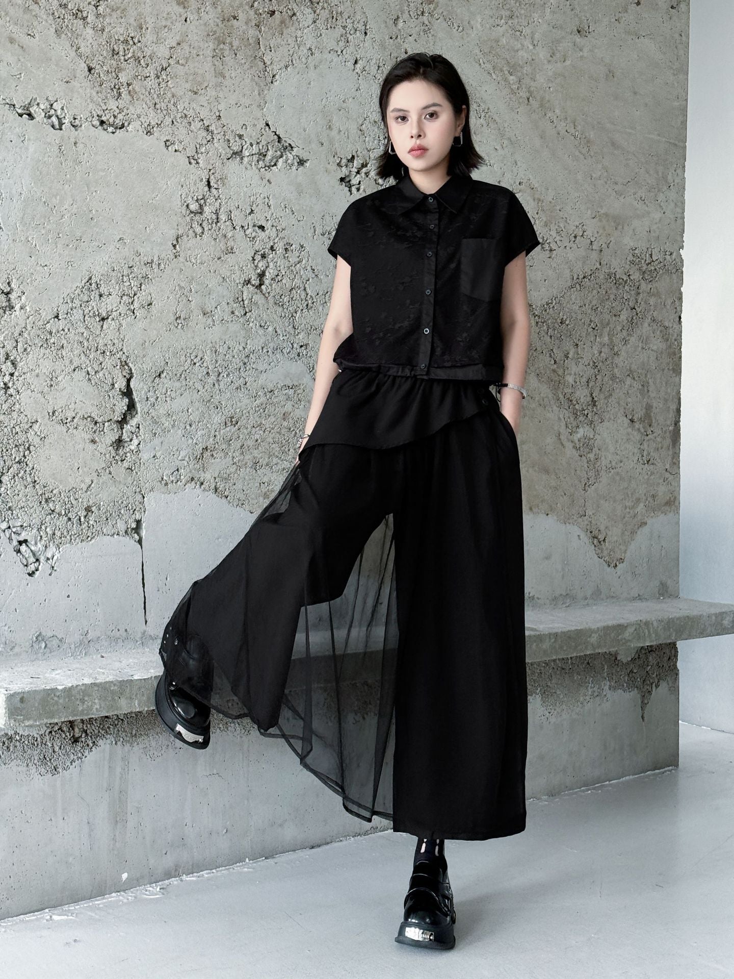ウエストに波打つようなラッフルと、ふんわり重ねたチュールレイヤーが視線を惹くデザイン。ボトムス本体にはさらりとした素材を用い、歩くたびに軽やかに揺れるシルエットを演出。内側にワイドパンツを配し、スカート見えしながらも動きやすさを備えた構造。ヒップまわりに余裕を持たせつつ、落ち感のある素材感でシルエットをすっきりと整える。