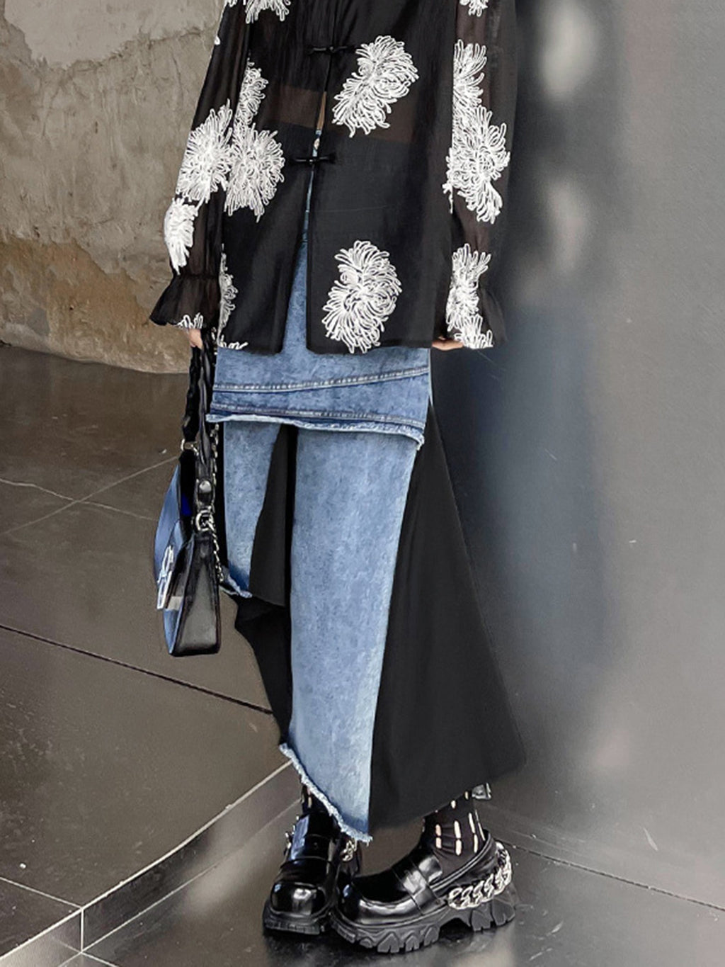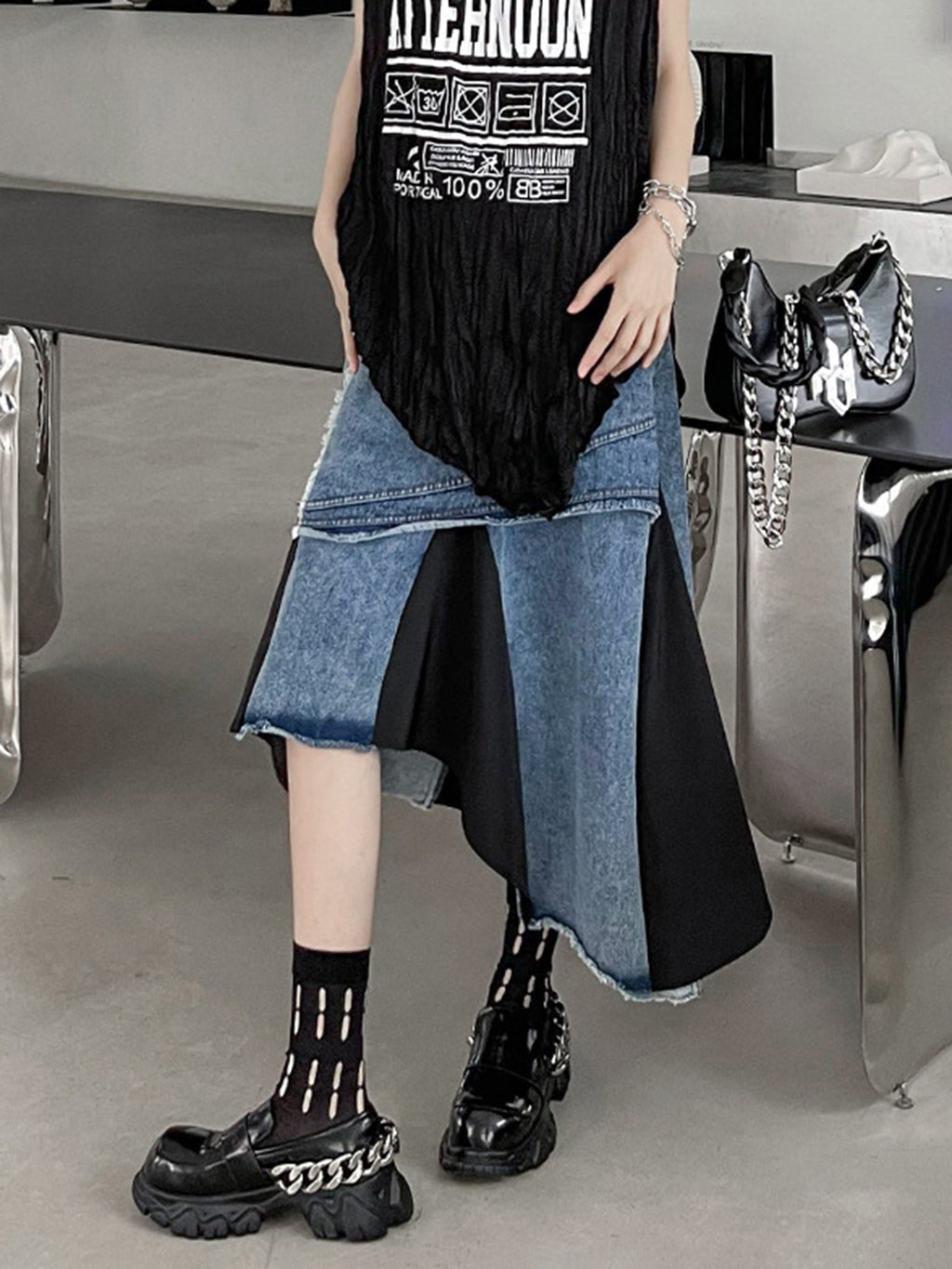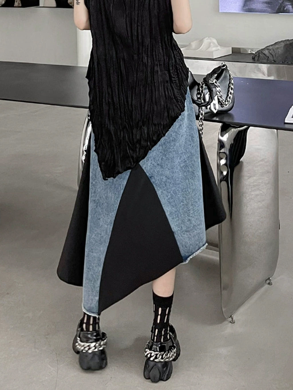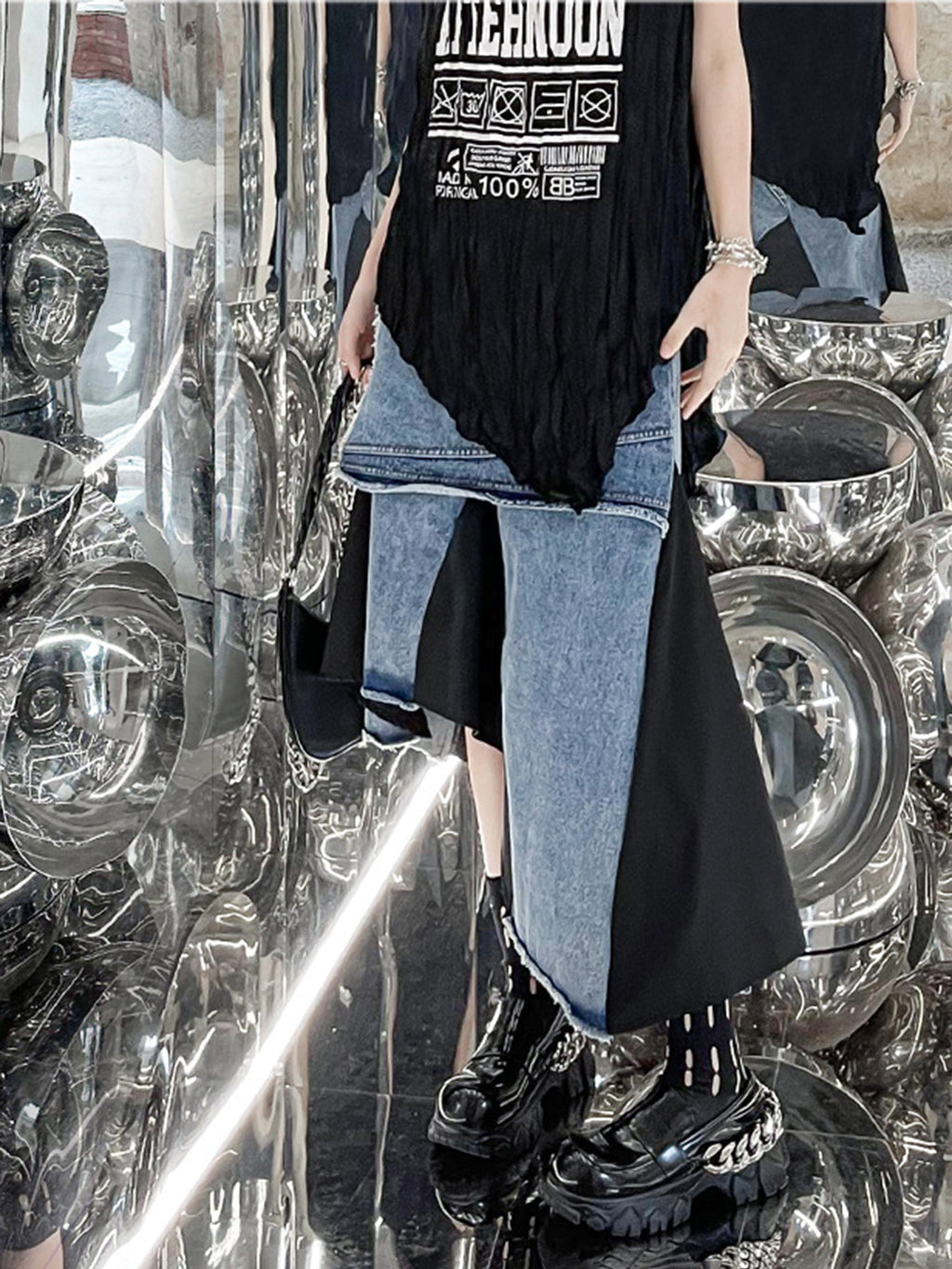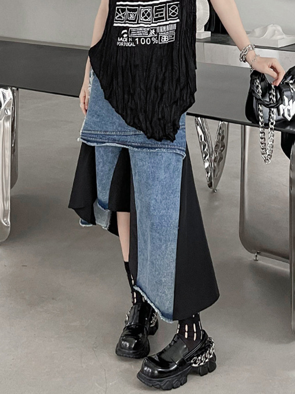 ユニークなカッティングで構成されたヴィンテージ調のデニム地に、深みのあるブラックの布帛生地をドッキングしたレイヤード構造のデニムスカート。正面には非対称な腰巻風デザインを重ね、段差のある裾ラインが個性的なムードを演出。バックスタイルには大胆に配置された三角パネルが特徴的で、360度どこから見ても印象的なシルエットに仕上がっている。ハイウエスト寄りの位置からの落ち感があり、自然な脚長効果も期待できるモダンエッジな1点。