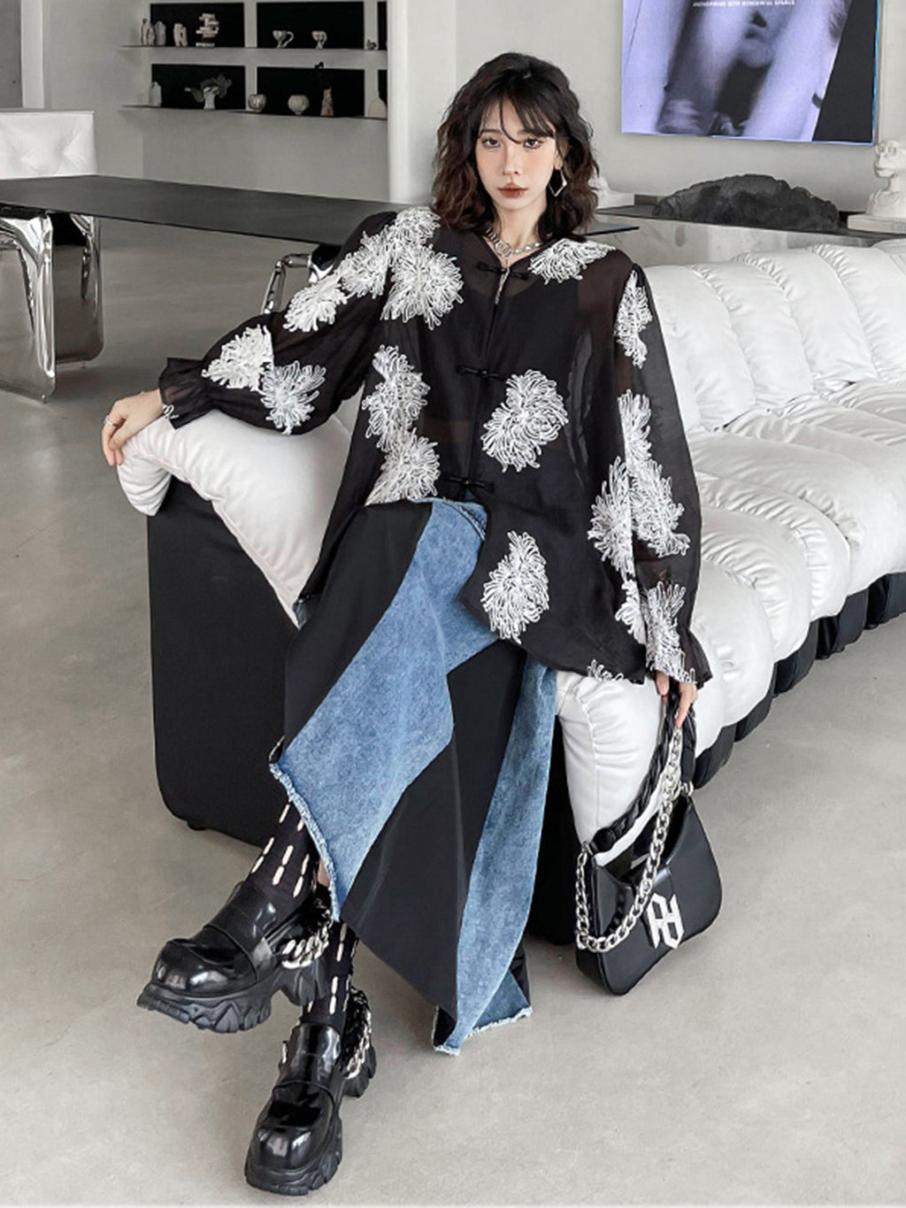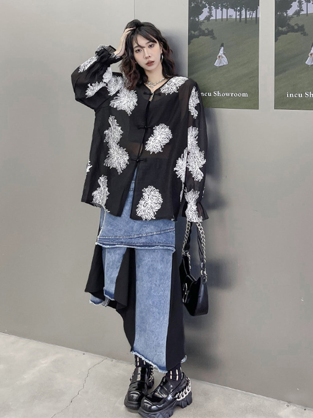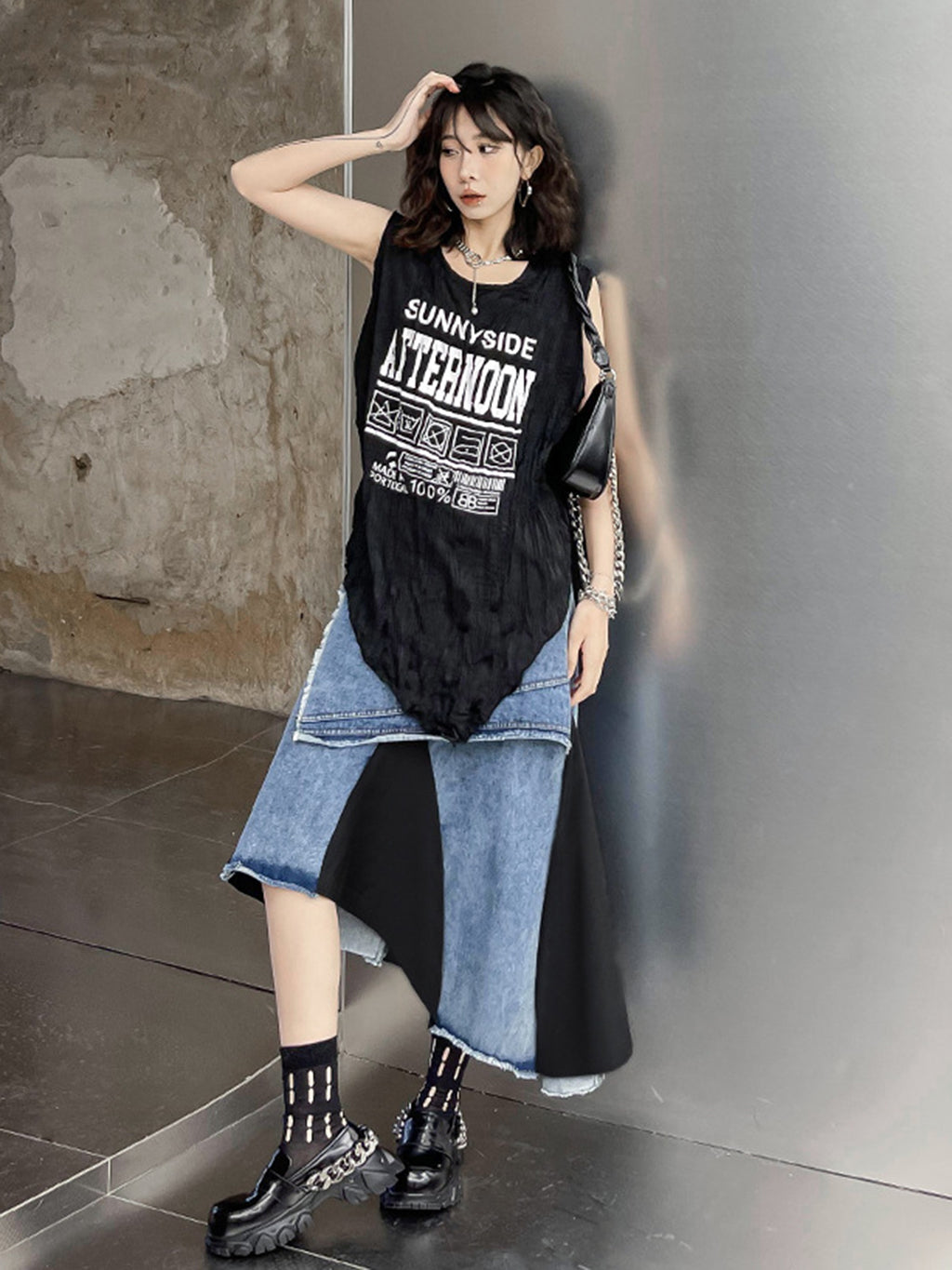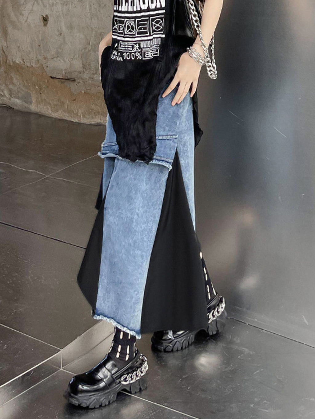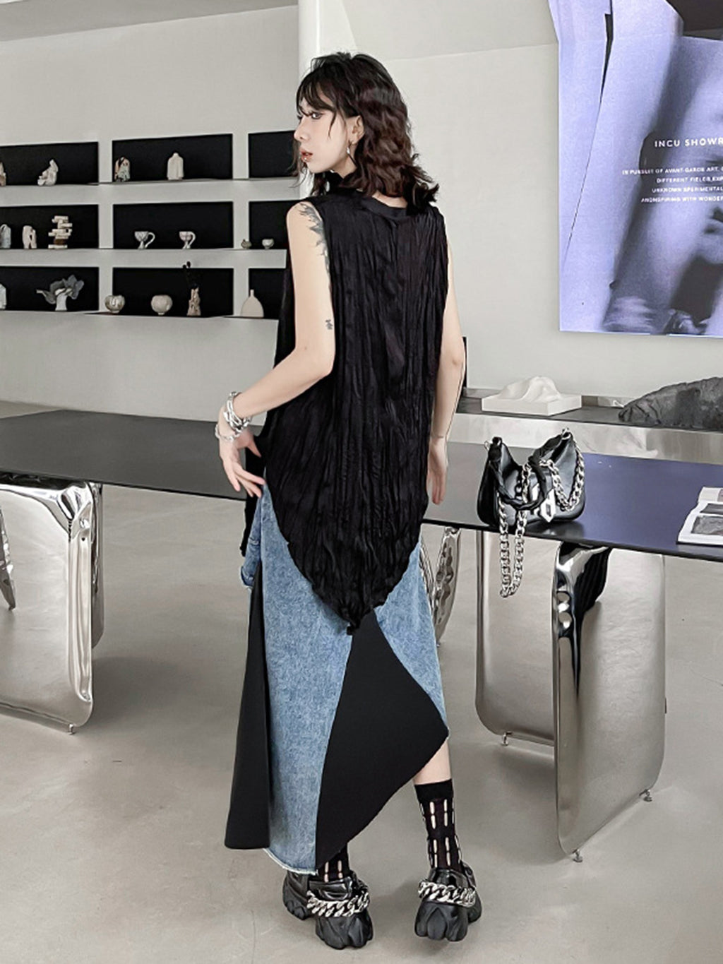 ユニークなカッティングで構成されたヴィンテージ調のデニム地に、深みのあるブラックの布帛生地をドッキングしたレイヤード構造のデニムスカート。正面には非対称な腰巻風デザインを重ね、段差のある裾ラインが個性的なムードを演出。バックスタイルには大胆に配置された三角パネルが特徴的で、360度どこから見ても印象的なシルエットに仕上がっている。ハイウエスト寄りの位置からの落ち感があり、自然な脚長効果も期待できるモダンエッジな1点。