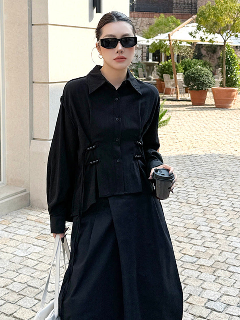 リネンブレンド特有のドライタッチな質感をもつ生地を使用し、フロントボタンとシャープな襟元で構成された設計。ウエスト部分にはドローコードとブラックビーズを組み合わせた装飾ディテールを内蔵し、縦方向のギャザーラインと奥行きのある立体フォルムを形成する構成。ドロップショルダーとボリュームスリーブが生み出す緩急のあるシルエットにより、モードと抜け感が共存する空気を描くデザイン。
