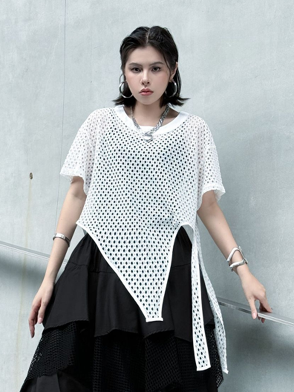 フロントにシャープなカッティングが施されたメッシュ生地のトップス。全体に透け感のあるオープンワークで、レイヤードを楽しめる仕様。袖と身頃はゆとりあるシルエットでリラックス感を演出しつつ、前後差のあるヘムラインが印象に残る。パンツにもスカートにも好相性で、日常の装いにさりげないアクセントを加える。