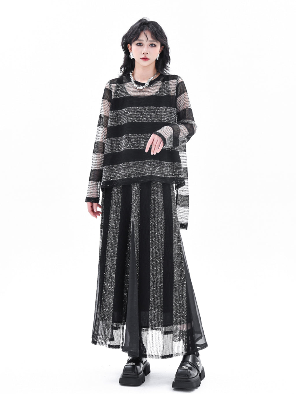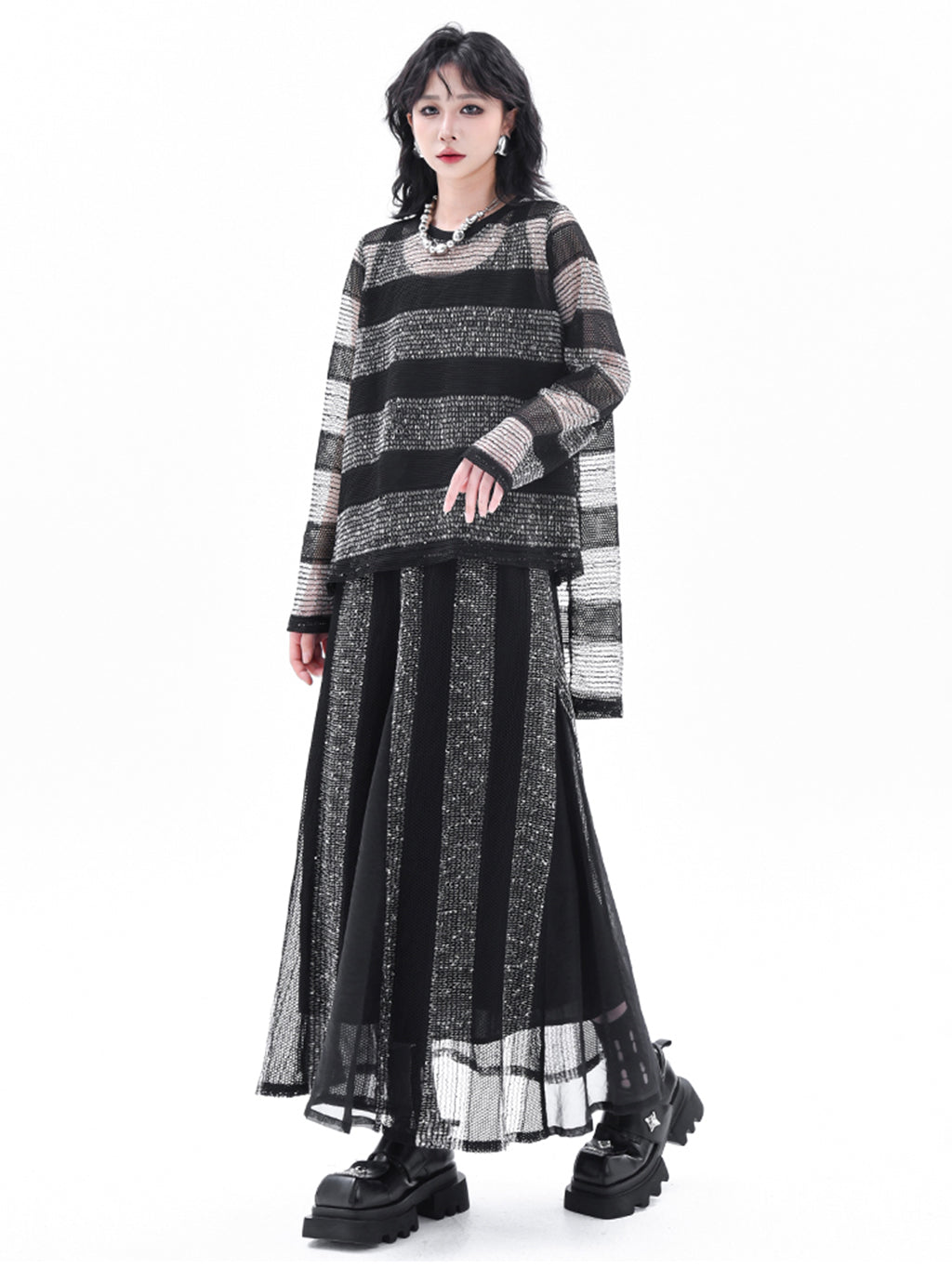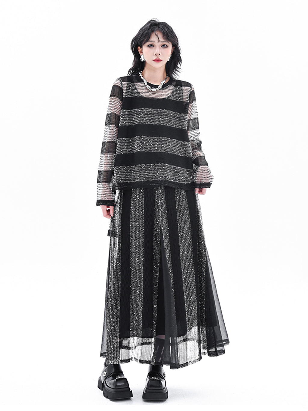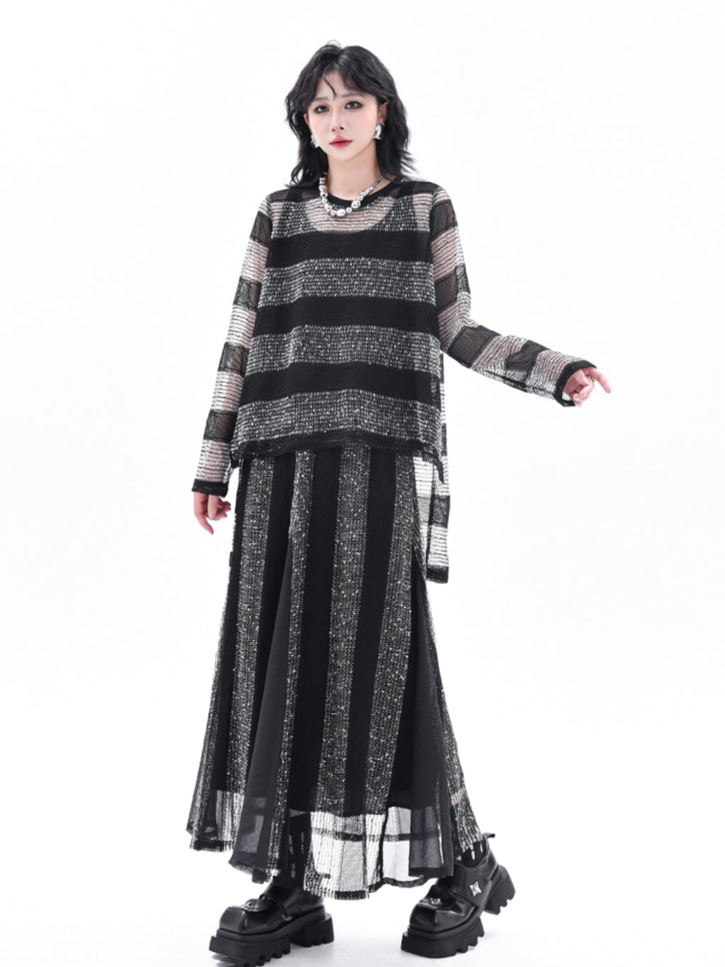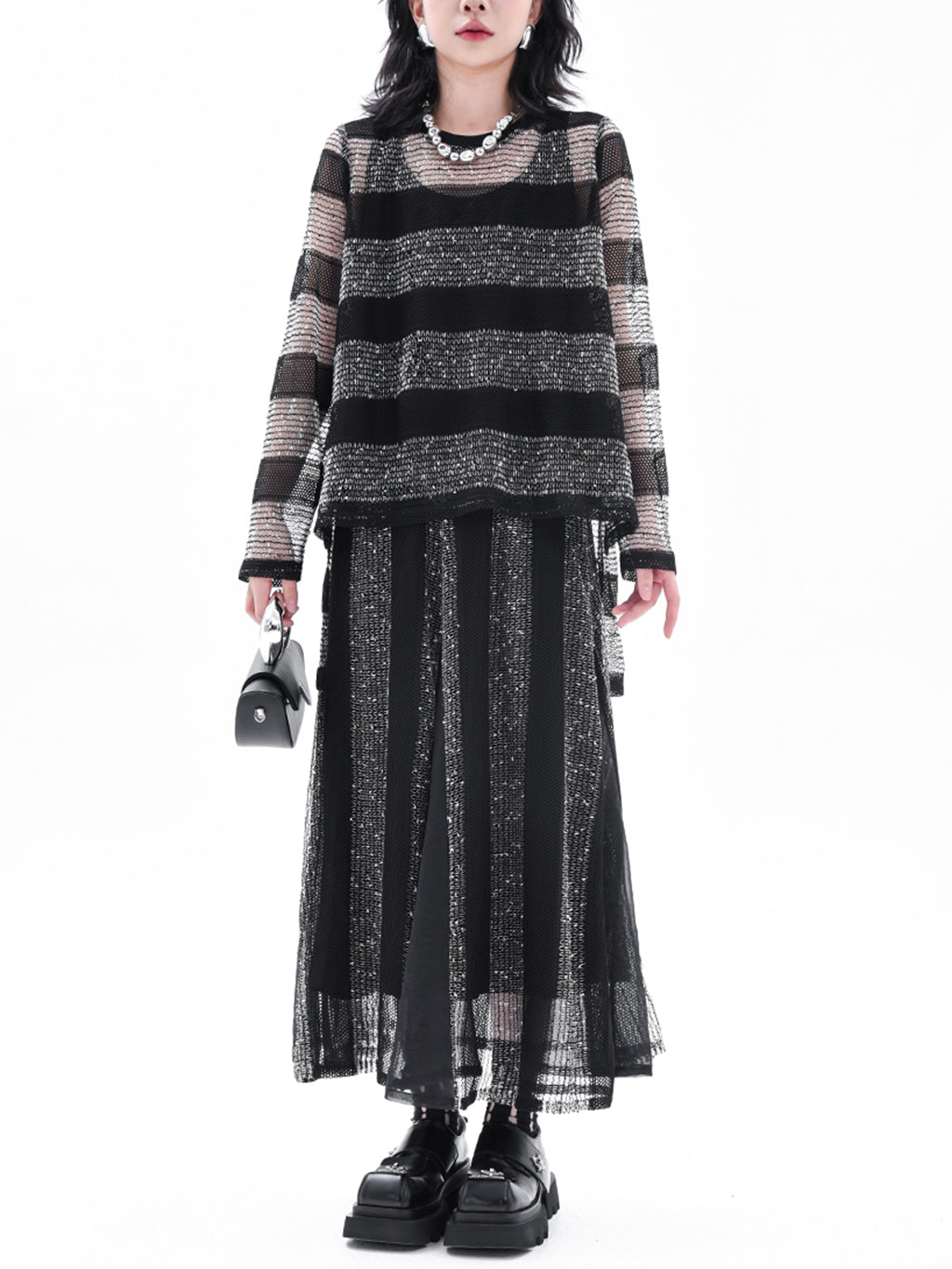 トップスは透け感のあるメッシュニット素材を横ボーダーで編み上げ、軽やかな仕上がりに。袖口と裾には編み目の変化を加え、立体感を演出。スカートは縦にストライプ状のチュール素材を切り替えたロング丈。動くたびに揺れる軽やかさと立体感のある陰影が魅力。全体をブラックトーンで統一しながらも、テクスチャのコントラストで魅せる構成。セットアップとしてはもちろん、単体でも着回し力抜群。