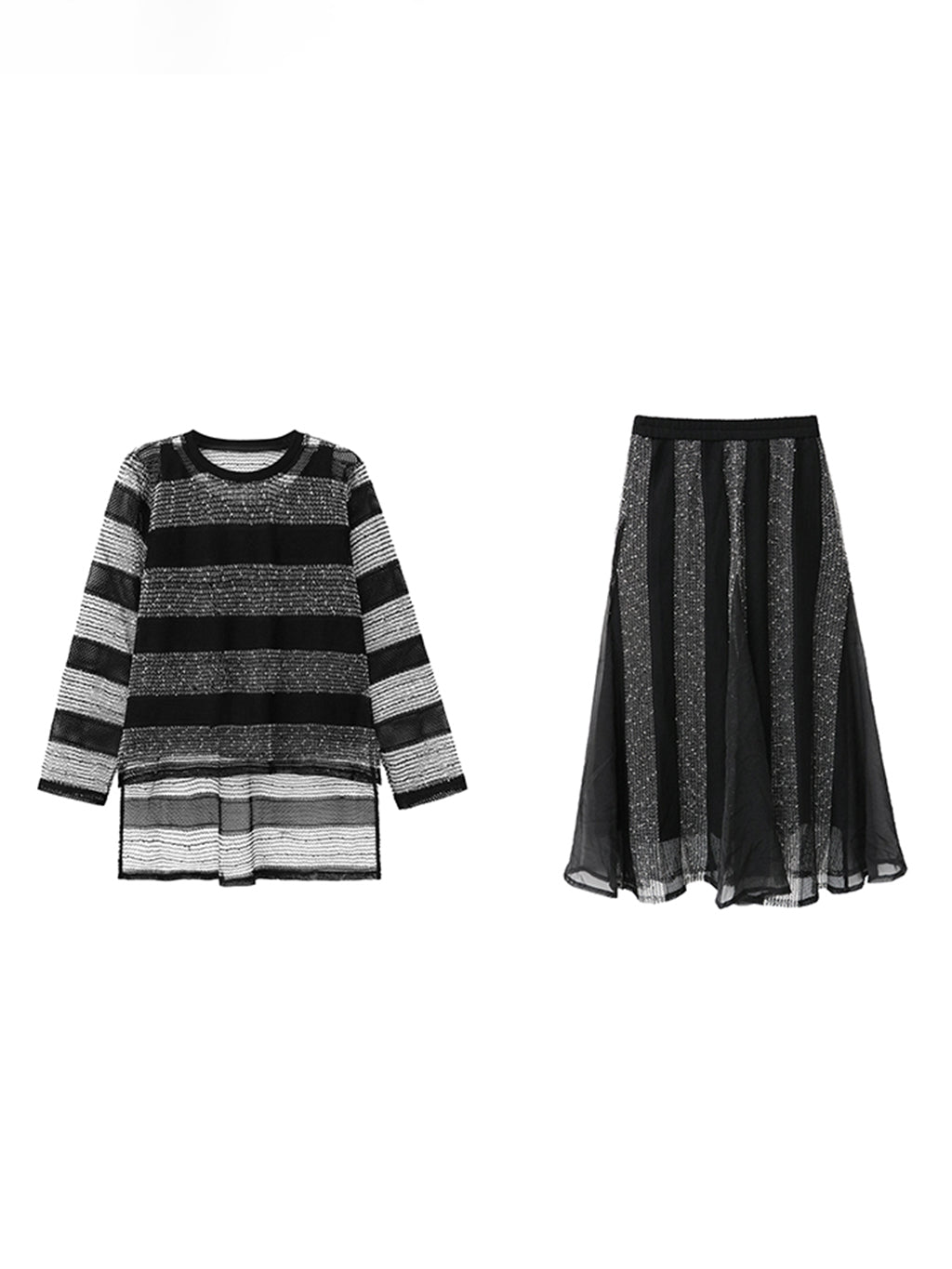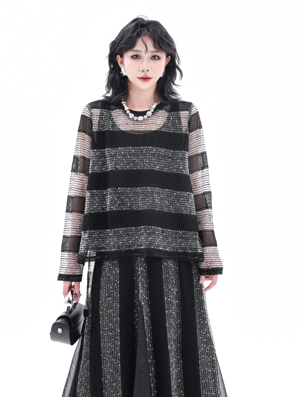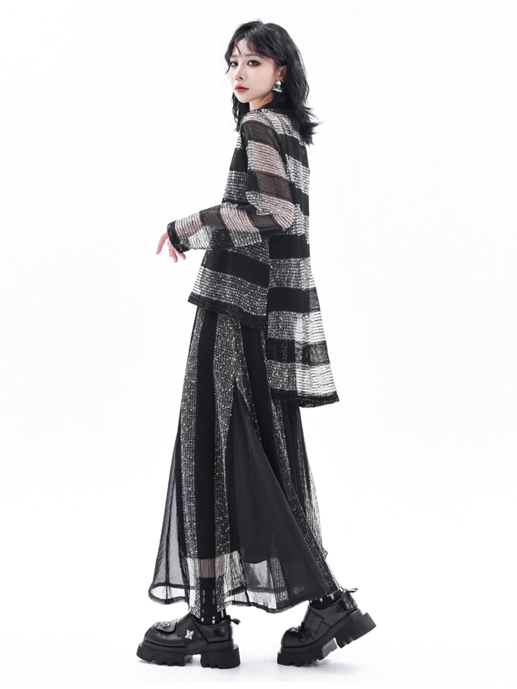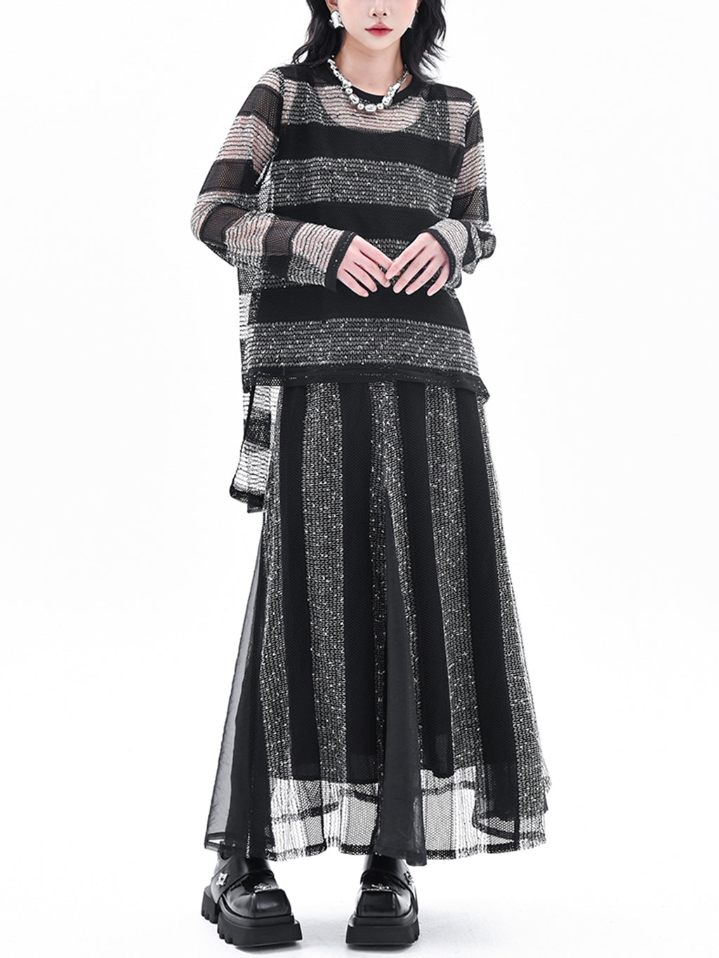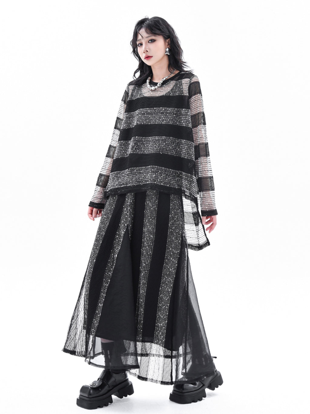 トップスは透け感のあるメッシュニット素材を横ボーダーで編み上げ、軽やかな仕上がりに。袖口と裾には編み目の変化を加え、立体感を演出。スカートは縦にストライプ状のチュール素材を切り替えたロング丈。動くたびに揺れる軽やかさと立体感のある陰影が魅力。全体をブラックトーンで統一しながらも、テクスチャのコントラストで魅せる構成。セットアップとしてはもちろん、単体でも着回し力抜群。