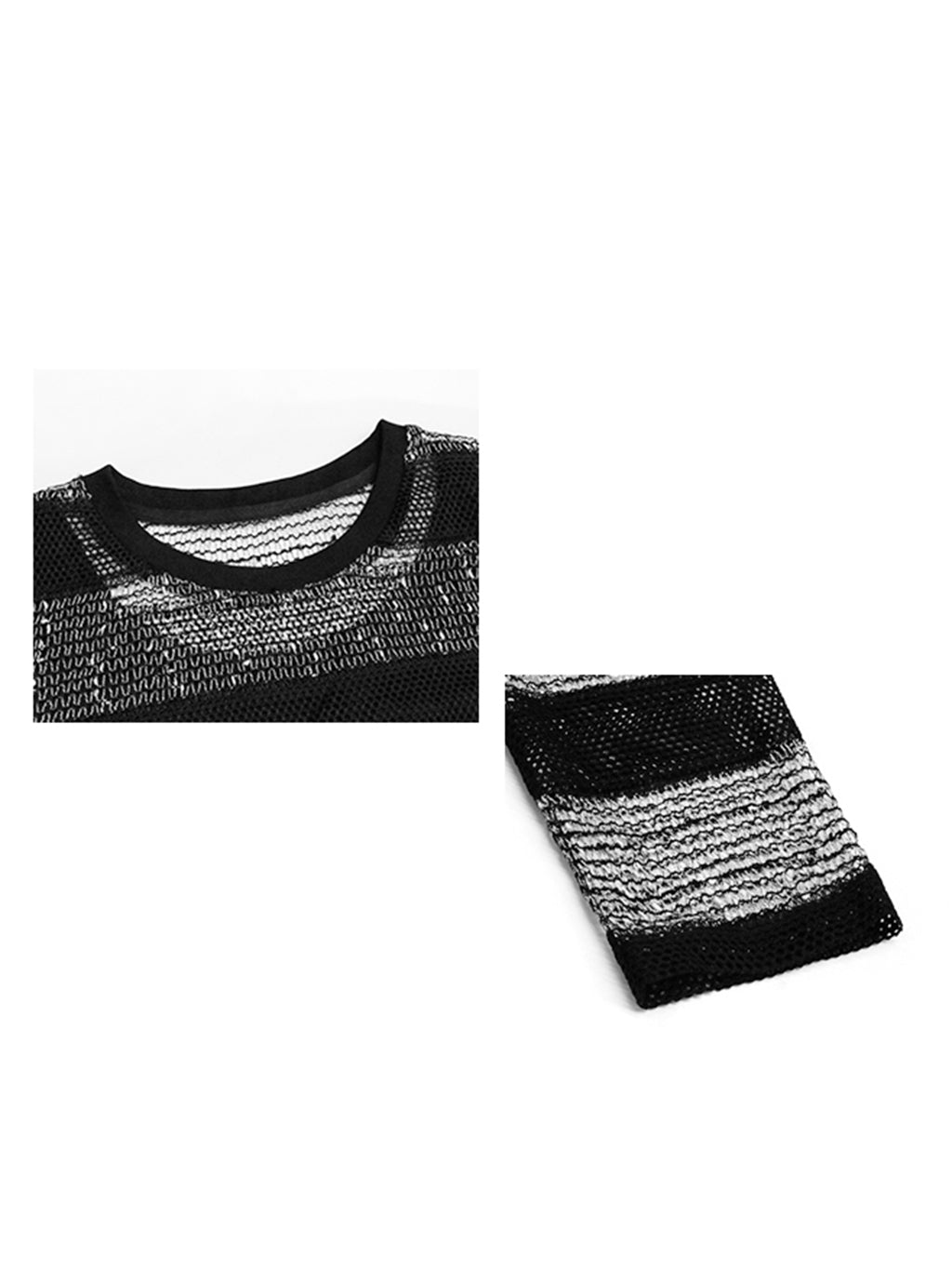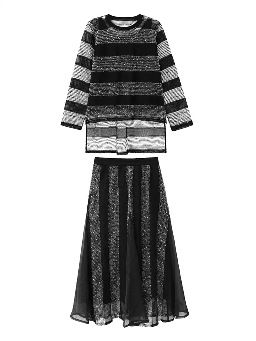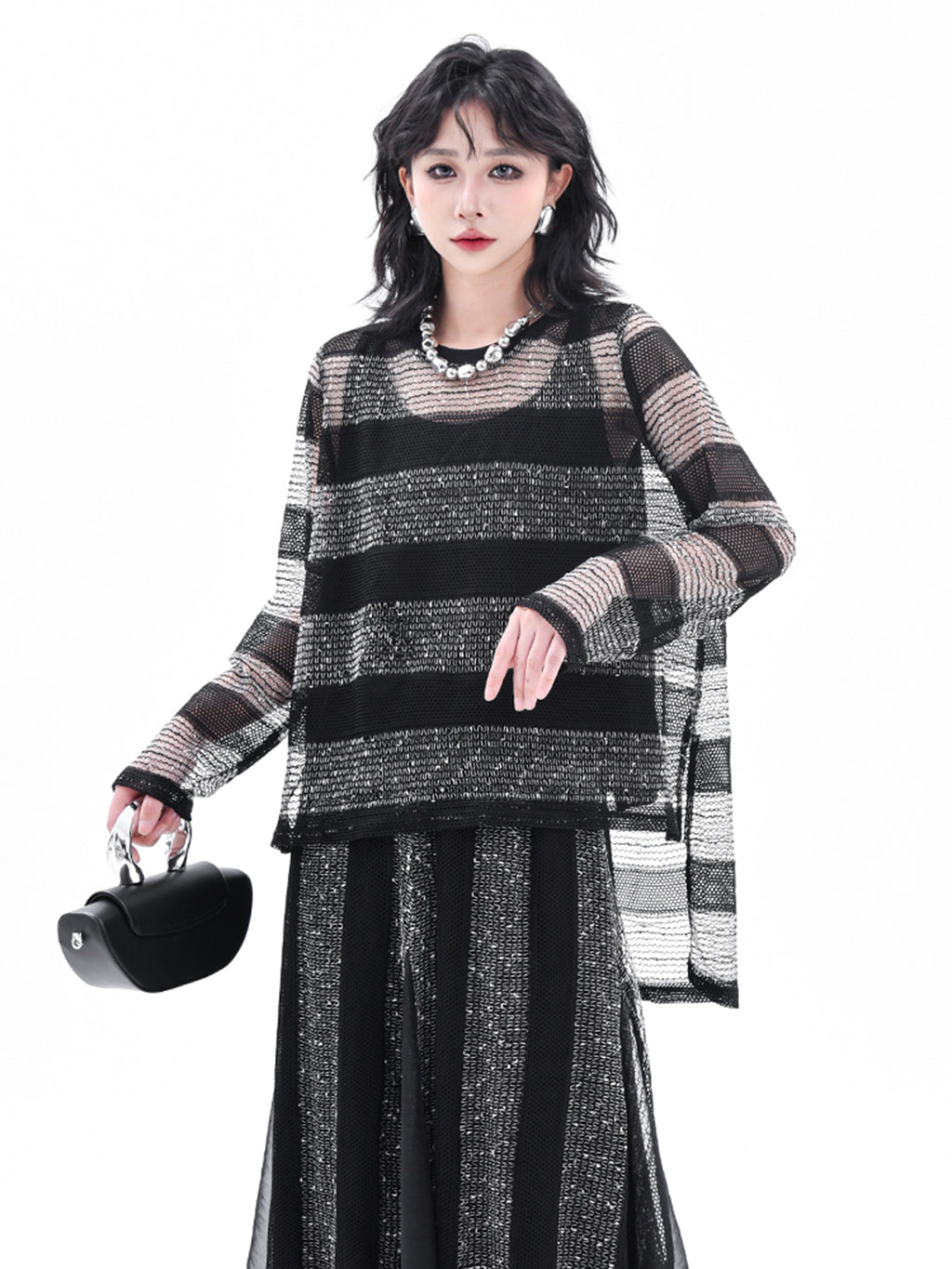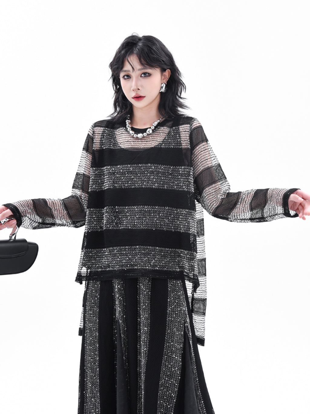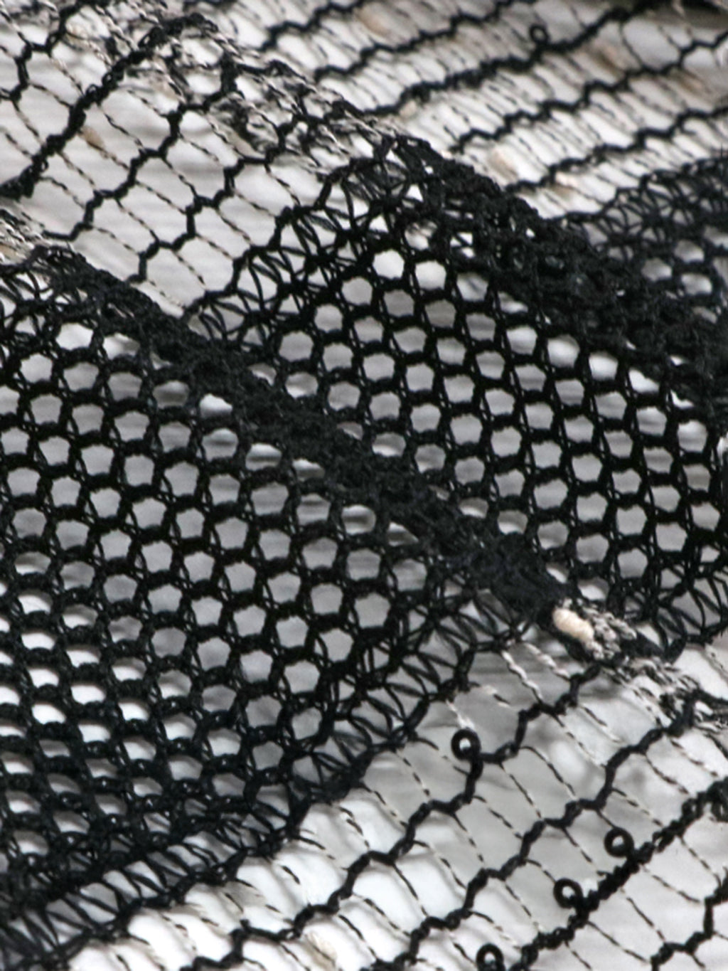 トップスは透け感のあるメッシュニット素材を横ボーダーで編み上げ、軽やかな仕上がりに。袖口と裾には編み目の変化を加え、立体感を演出。スカートは縦にストライプ状のチュール素材を切り替えたロング丈。動くたびに揺れる軽やかさと立体感のある陰影が魅力。全体をブラックトーンで統一しながらも、テクスチャのコントラストで魅せる構成。セットアップとしてはもちろん、単体でも着回し力抜群。