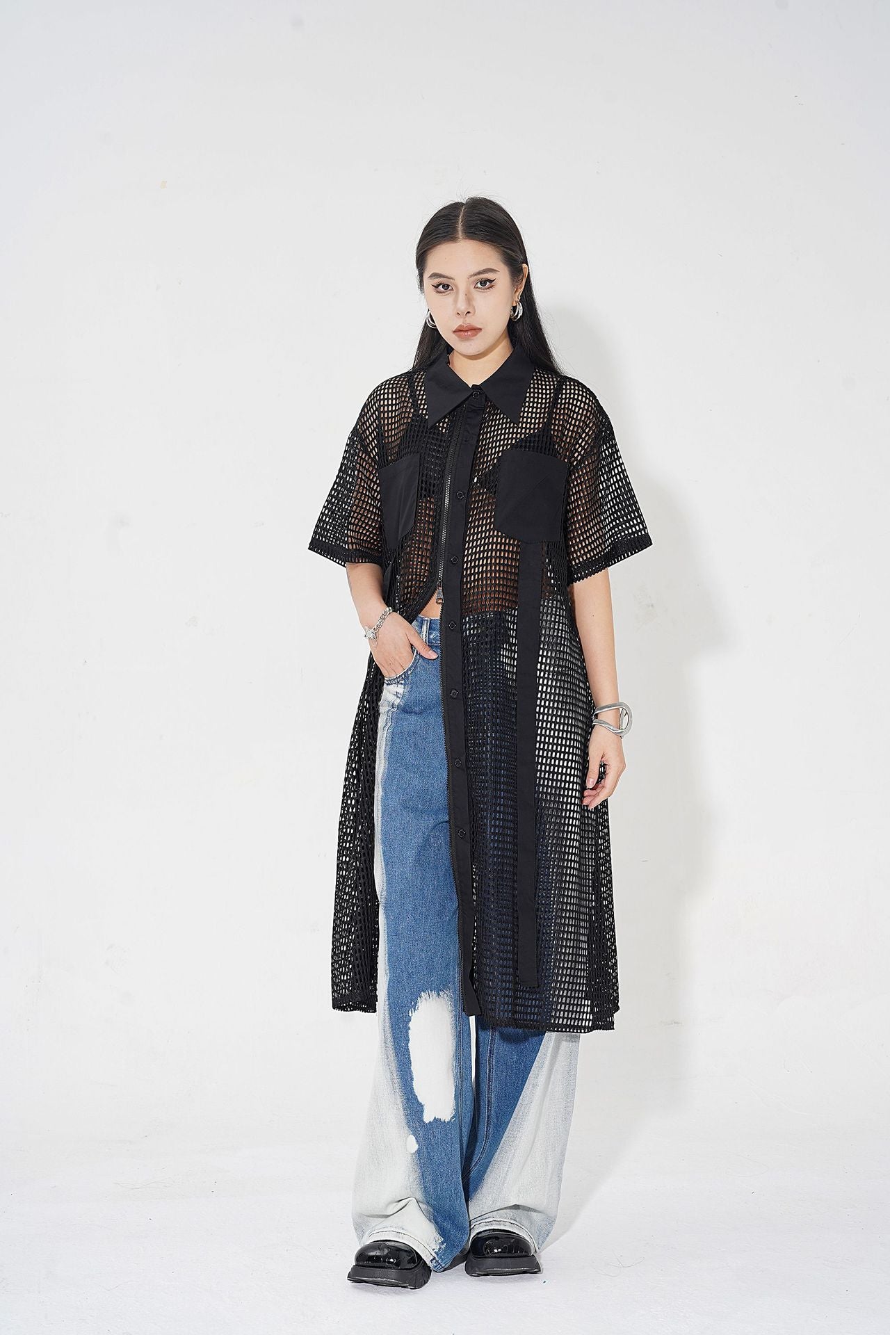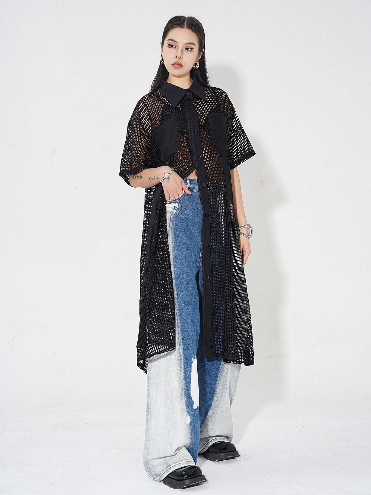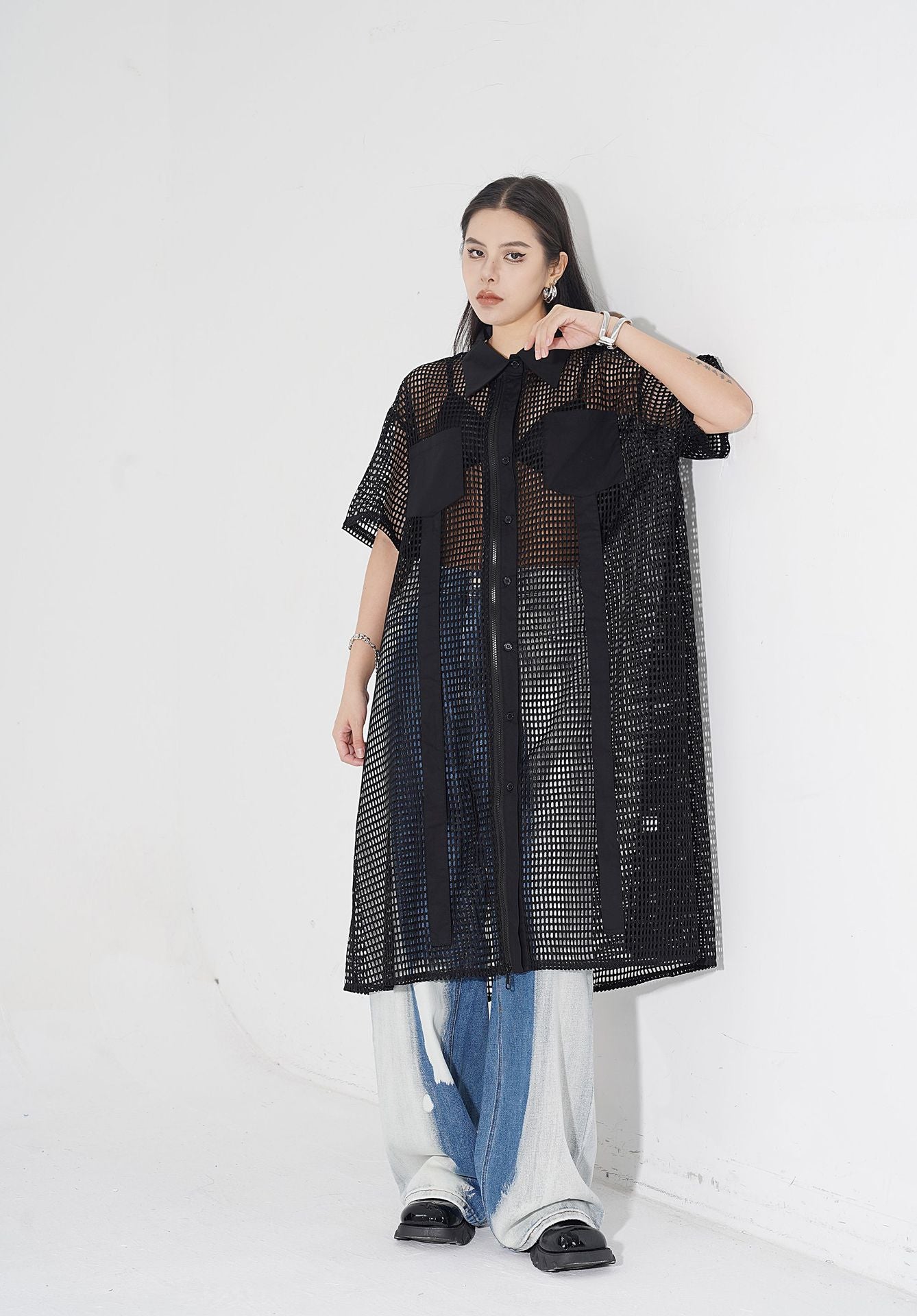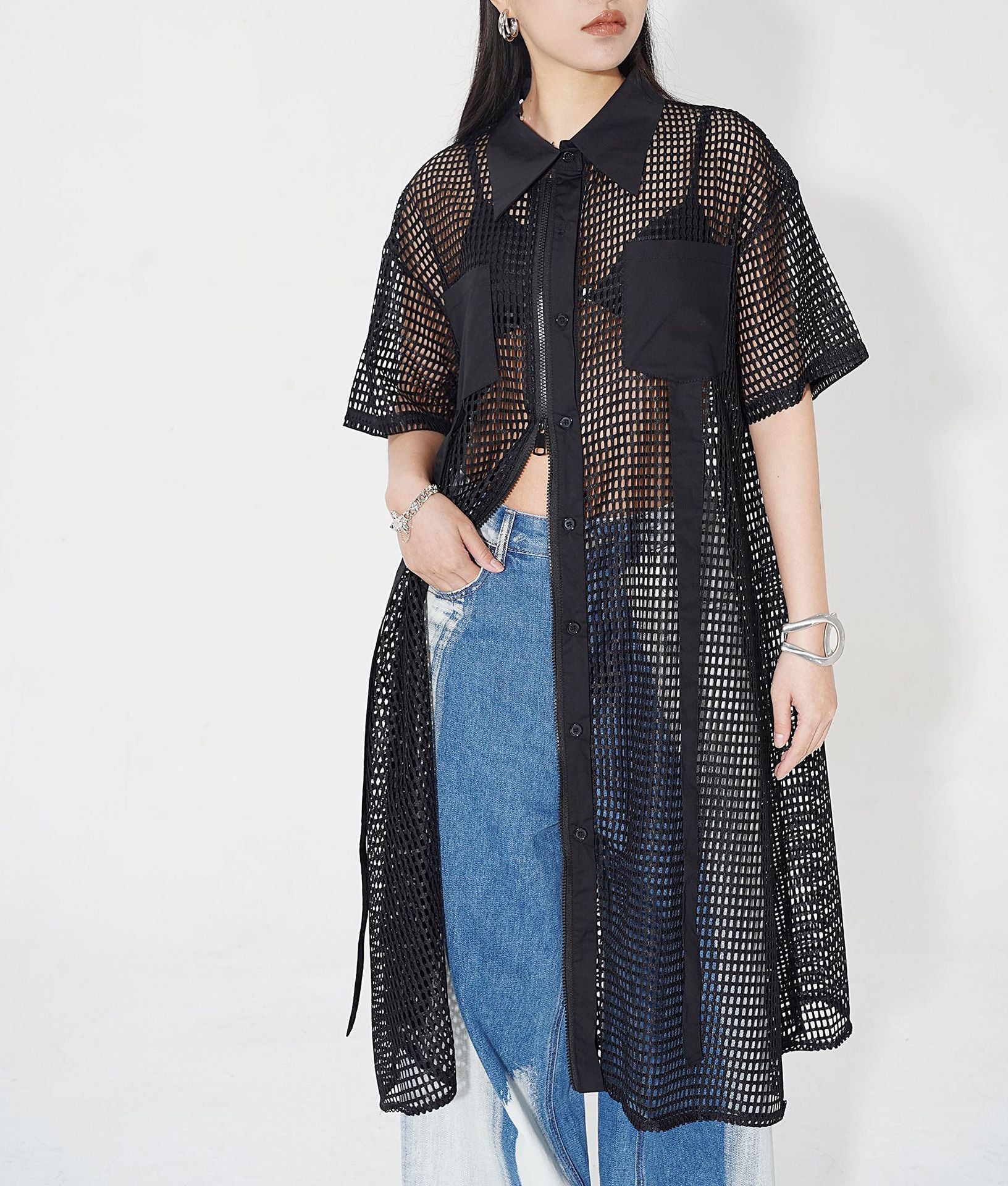 透け感のあるメッシュ素材をベースに、シャツカラーと前立てに布帛パネルを組み合わせたロングブラウス。軽量ながらも立体的なフォルムを描き、シルエットを美しく見せる構造。胸元に配置されたポケットが視覚的なアクセントとなり、カジュアルからストリートまで幅広いスタイルに馴染む。羽織りとしても活用できるオープンフロント仕様で、シーズンレスにレイヤードスタイルを楽しめるデザイン。