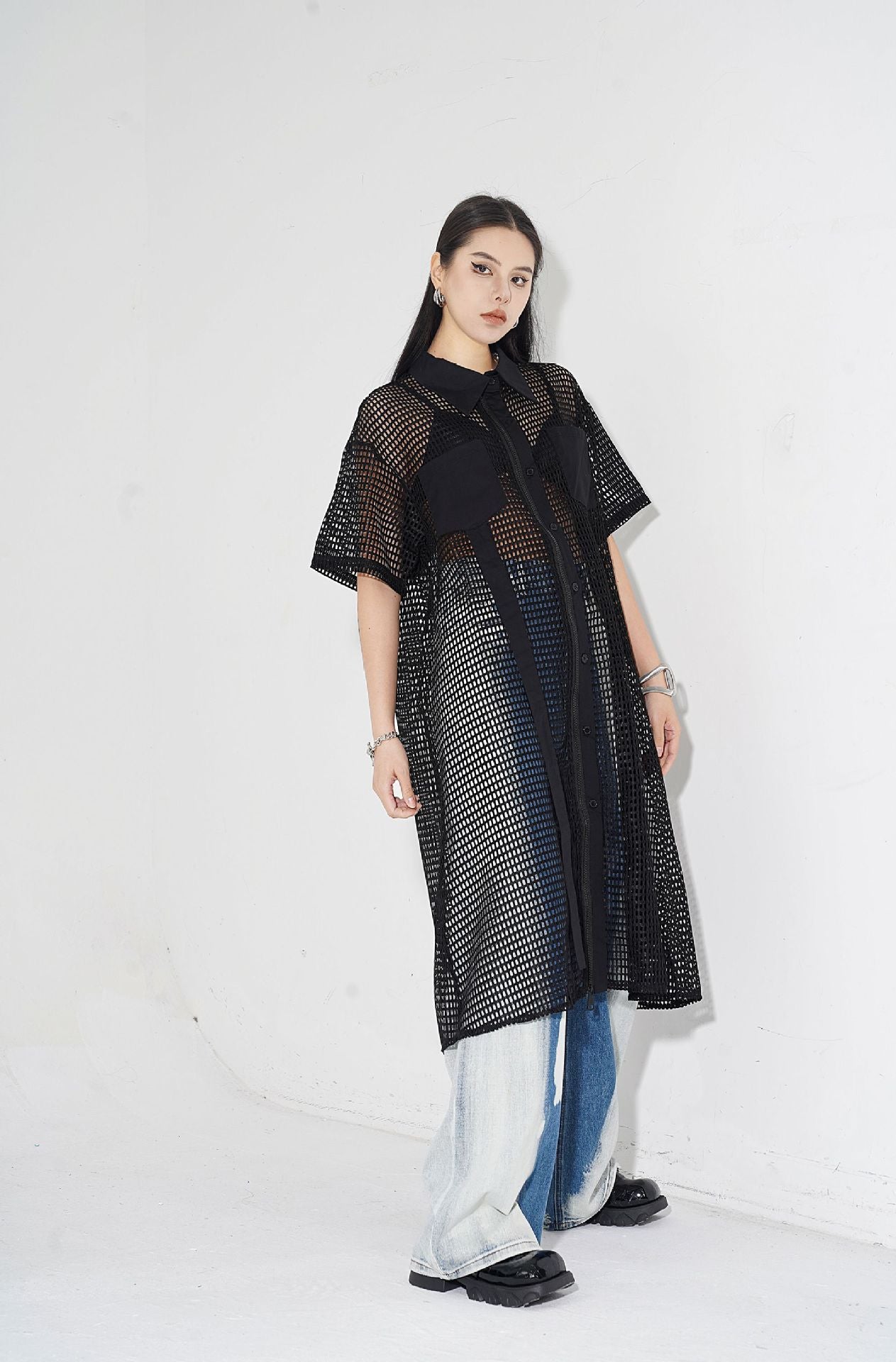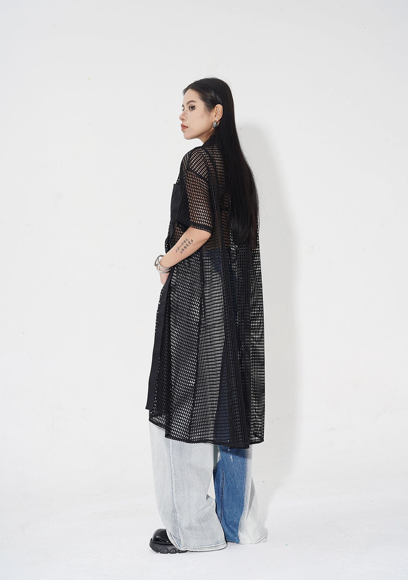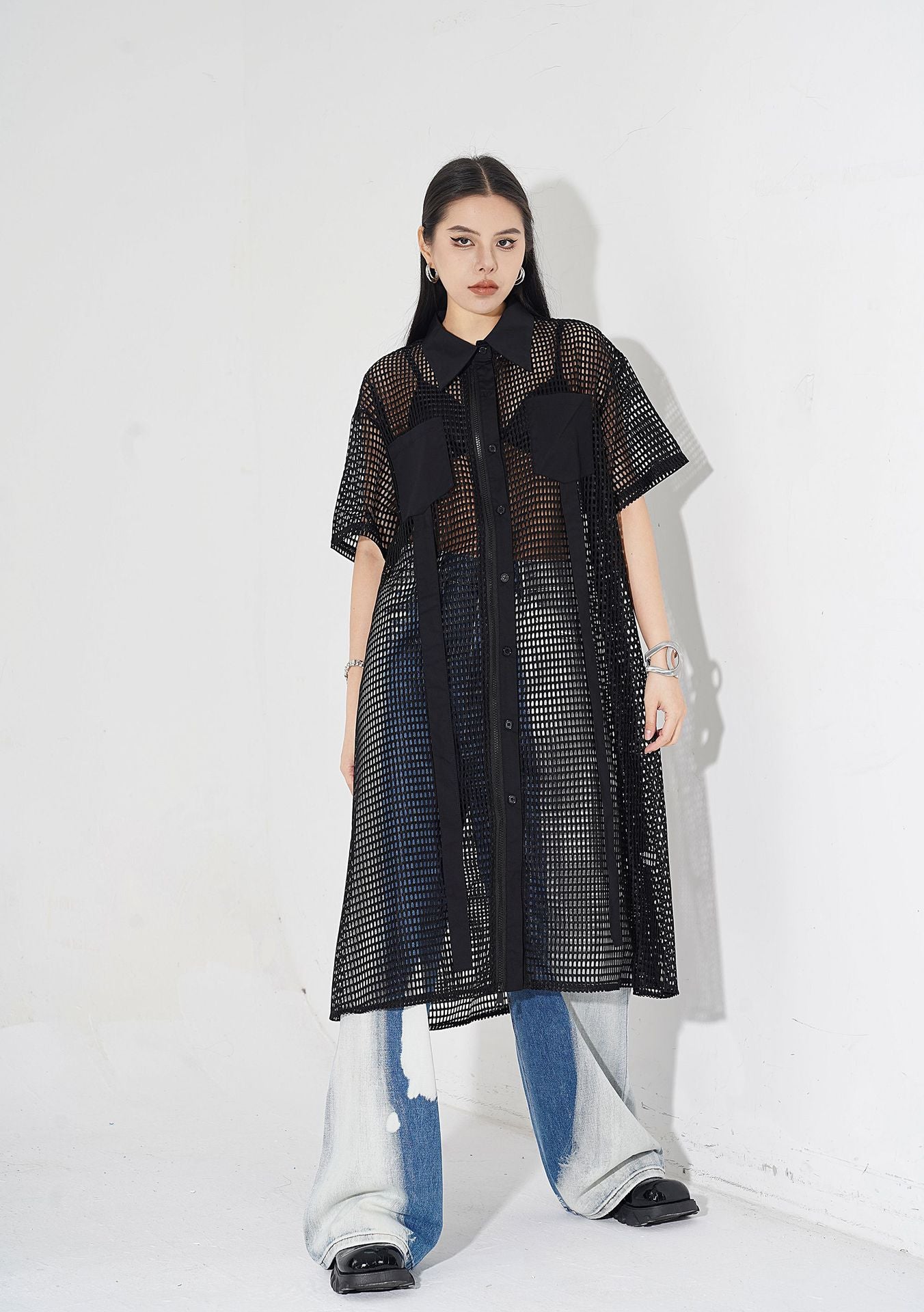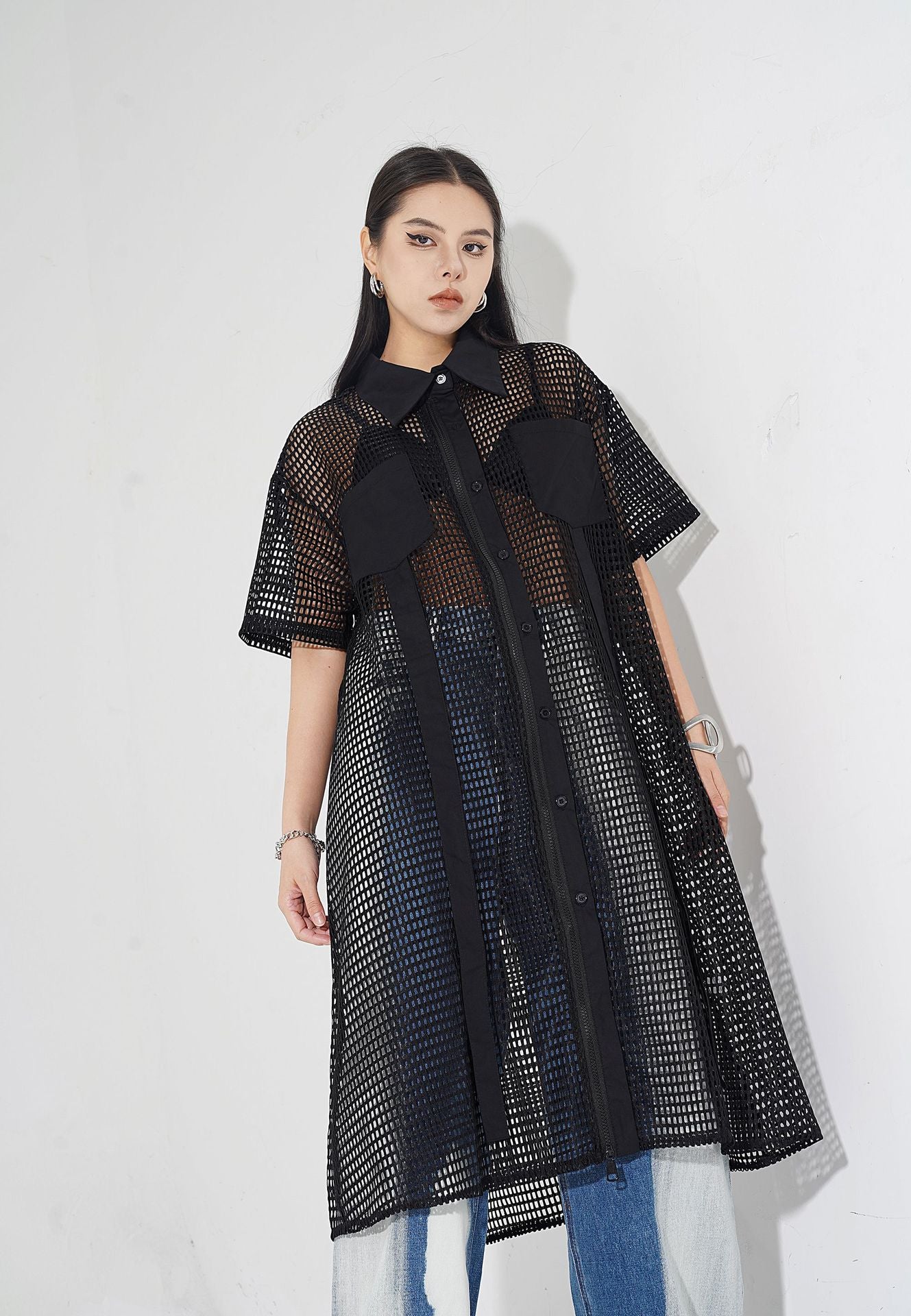 透け感のあるメッシュ素材をベースに、シャツカラーと前立てに布帛パネルを組み合わせたロングブラウス。軽量ながらも立体的なフォルムを描き、シルエットを美しく見せる構造。胸元に配置されたポケットが視覚的なアクセントとなり、カジュアルからストリートまで幅広いスタイルに馴染む。羽織りとしても活用できるオープンフロント仕様で、シーズンレスにレイヤードスタイルを楽しめるデザイン。