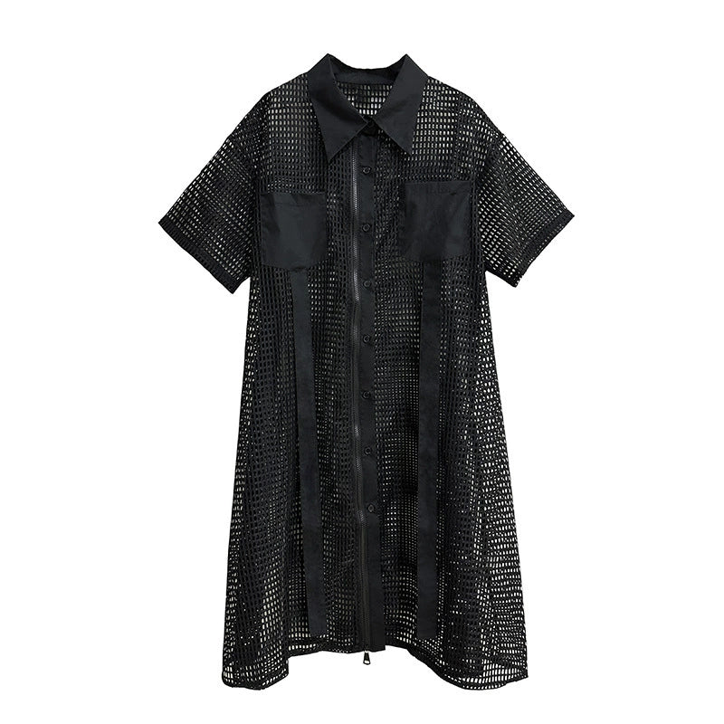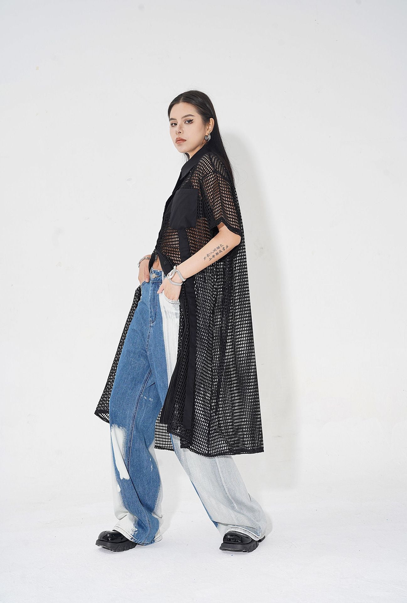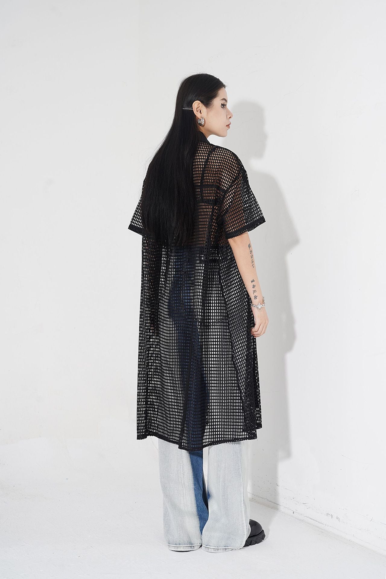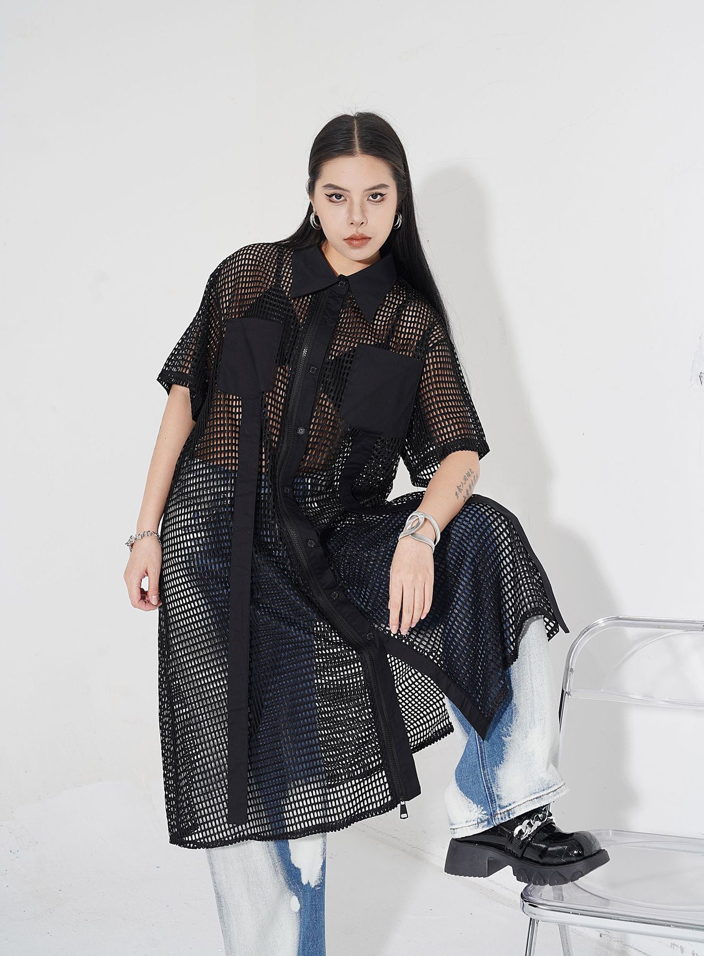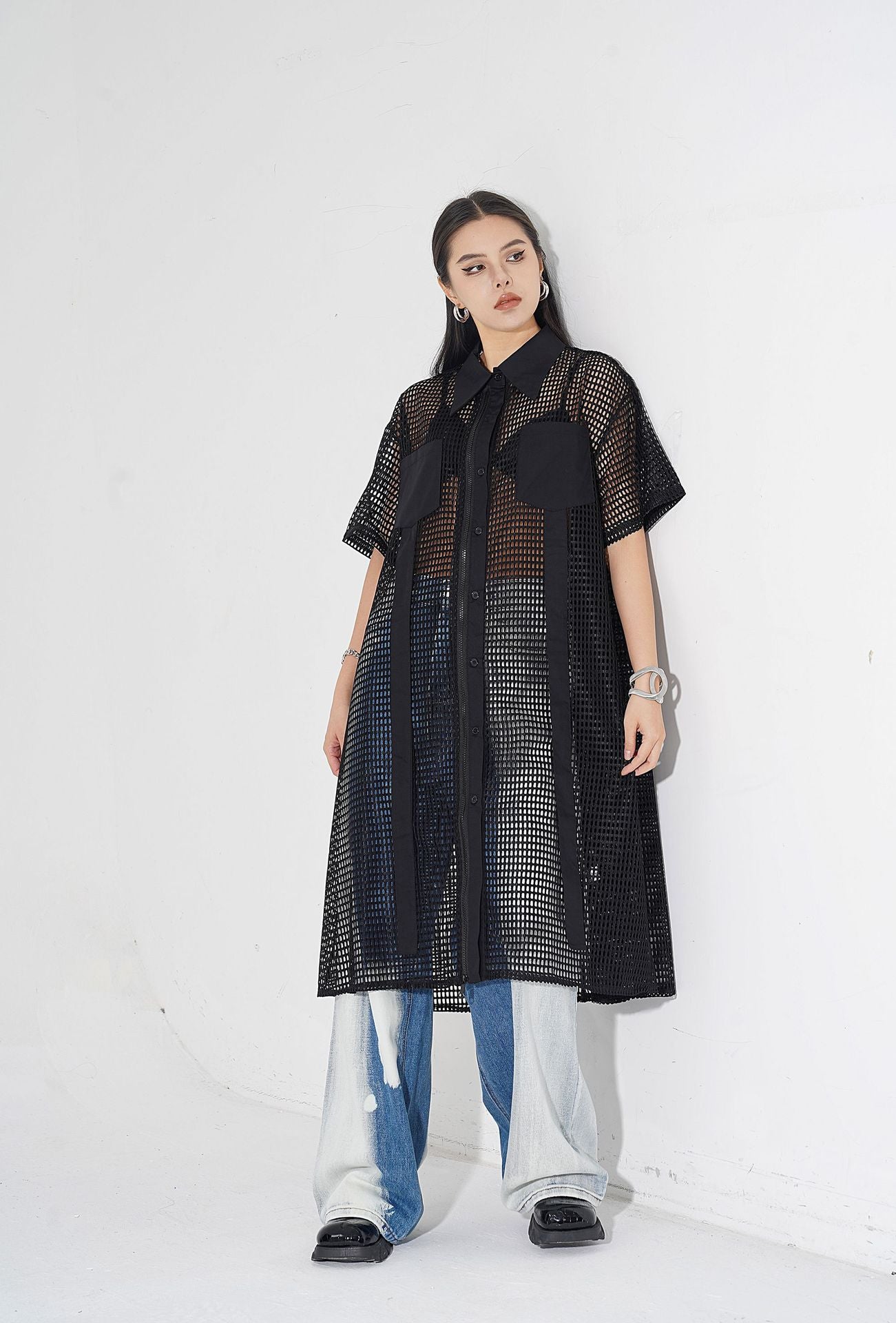 透け感のあるメッシュ素材をベースに、シャツカラーと前立てに布帛パネルを組み合わせたロングブラウス。軽量ながらも立体的なフォルムを描き、シルエットを美しく見せる構造。胸元に配置されたポケットが視覚的なアクセントとなり、カジュアルからストリートまで幅広いスタイルに馴染む。羽織りとしても活用できるオープンフロント仕様で、シーズンレスにレイヤードスタイルを楽しめるデザイン。