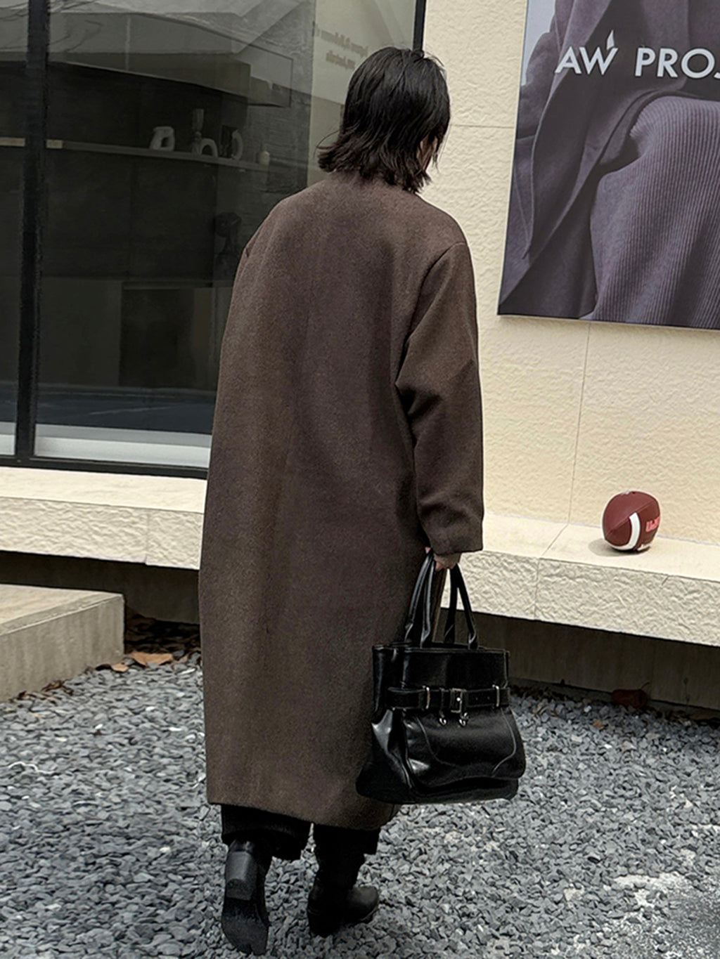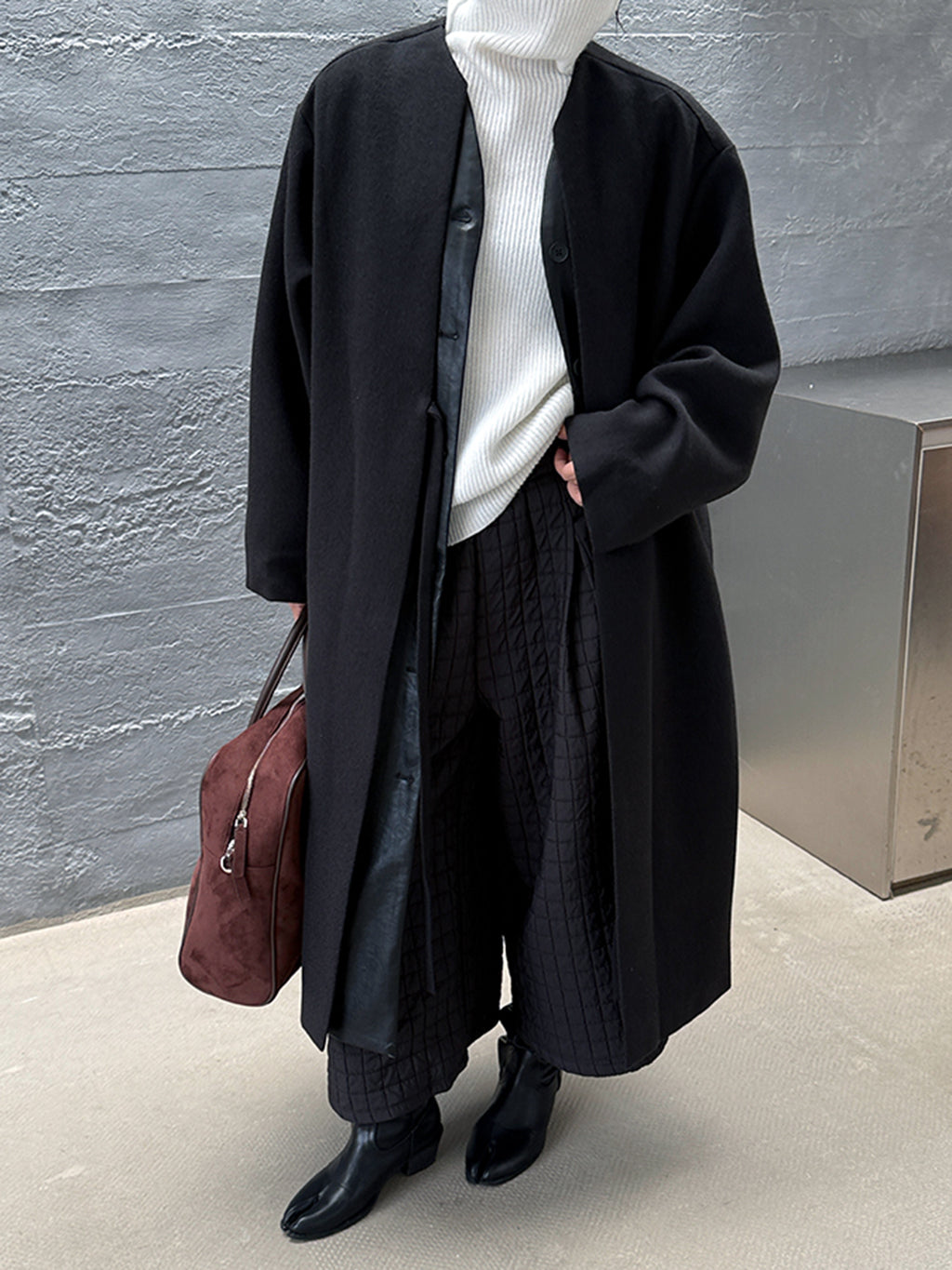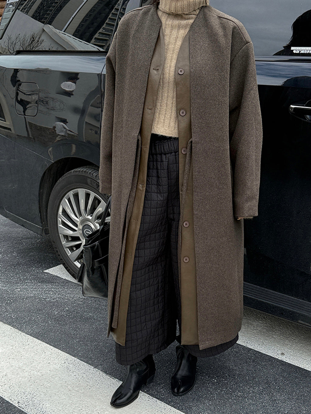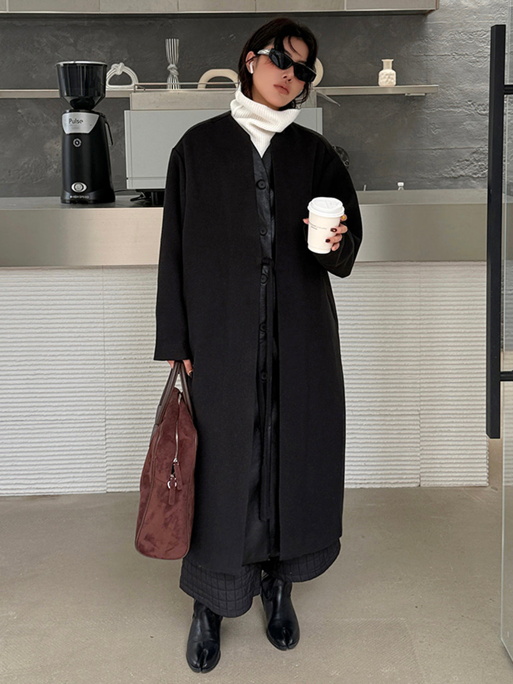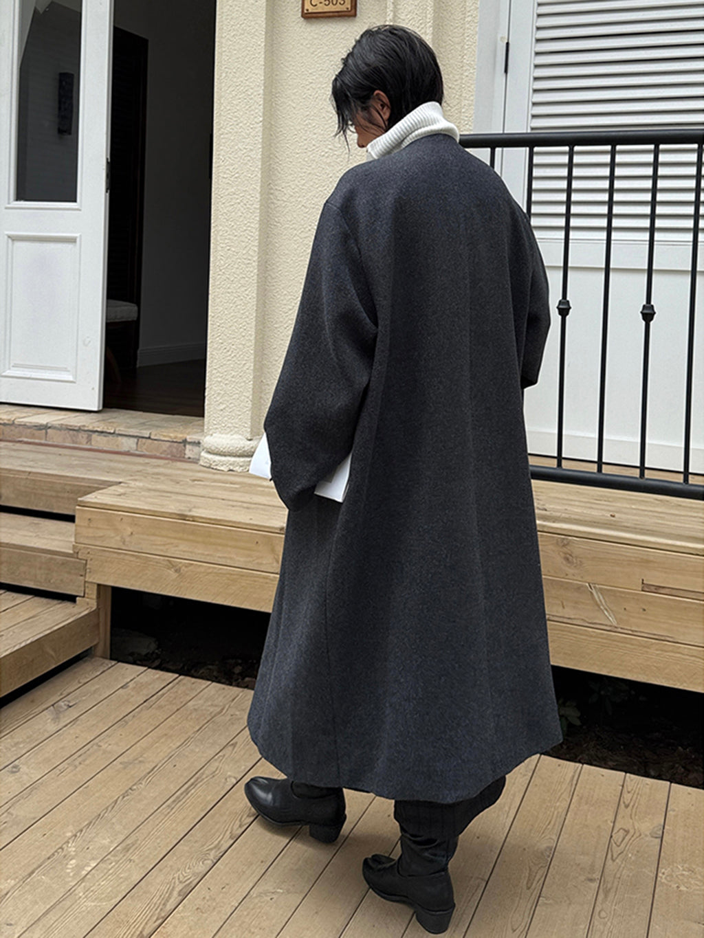 すっきりとしたノーカラーが印象的なロング丈コート。表面はウール調の起毛感を持ち、やわらかな質感が体を包み込むようにフィット。内側には光沢のある生地を配し、前合わせから覗くことでモード感のあるレイヤード風に仕上げている。ドロップショルダーのラグランスリーブにより肩回りはゆとりがあり、全体的にやや丸みを帯びたリラクシーなシルエット。重ね着にも適した余白感があり、日常のスタイルから都市的なモードコーデまで活用できる汎用性の高い一枚。